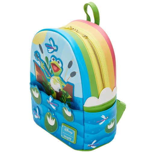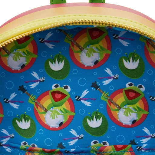 Help Kermit find the Rainbow Connection with this exclusive The Muppets Rainbow Connection Mini Backpack. On the front, Kermit strums his banjo and sings, surrounded by blue water, vibrant lily pads, and delightful dragonflies. In fact, the water scene is die-cut to form a charming, wavy front pocket for extra storage. This accessory makes for a colorful complement to any Disney outfit. Act fast to collect this Loungefly.com exclusive accessory; supplies are limited.