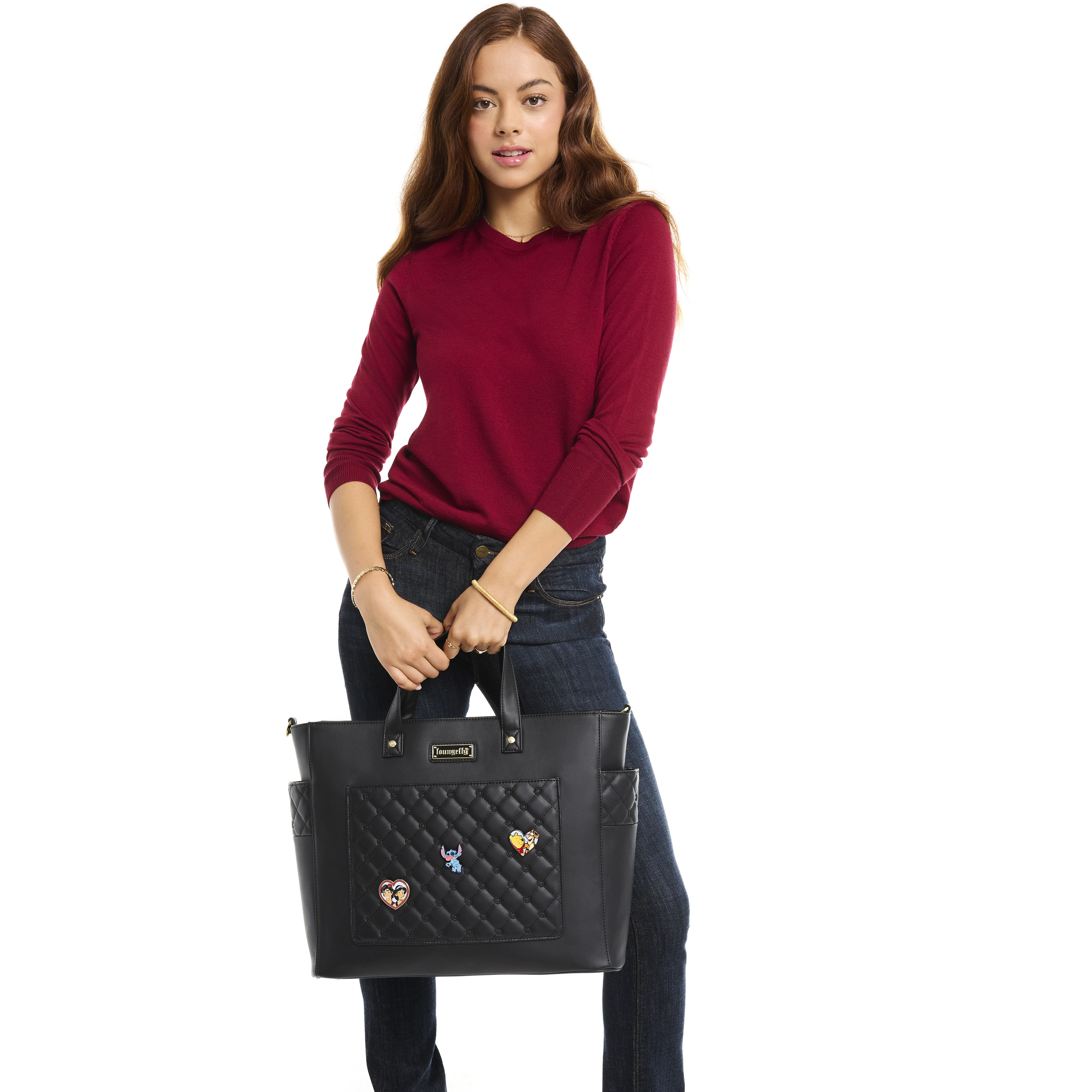 This bag converts between a backpack and a tote bag. Sleek black faux leather makes it the perfect bag for any workplace – but you can still have some fun by customizing it! On the front, you'll find a quilted section with embroidered pin holes, allowing you to stick on your own pins to customize your look!