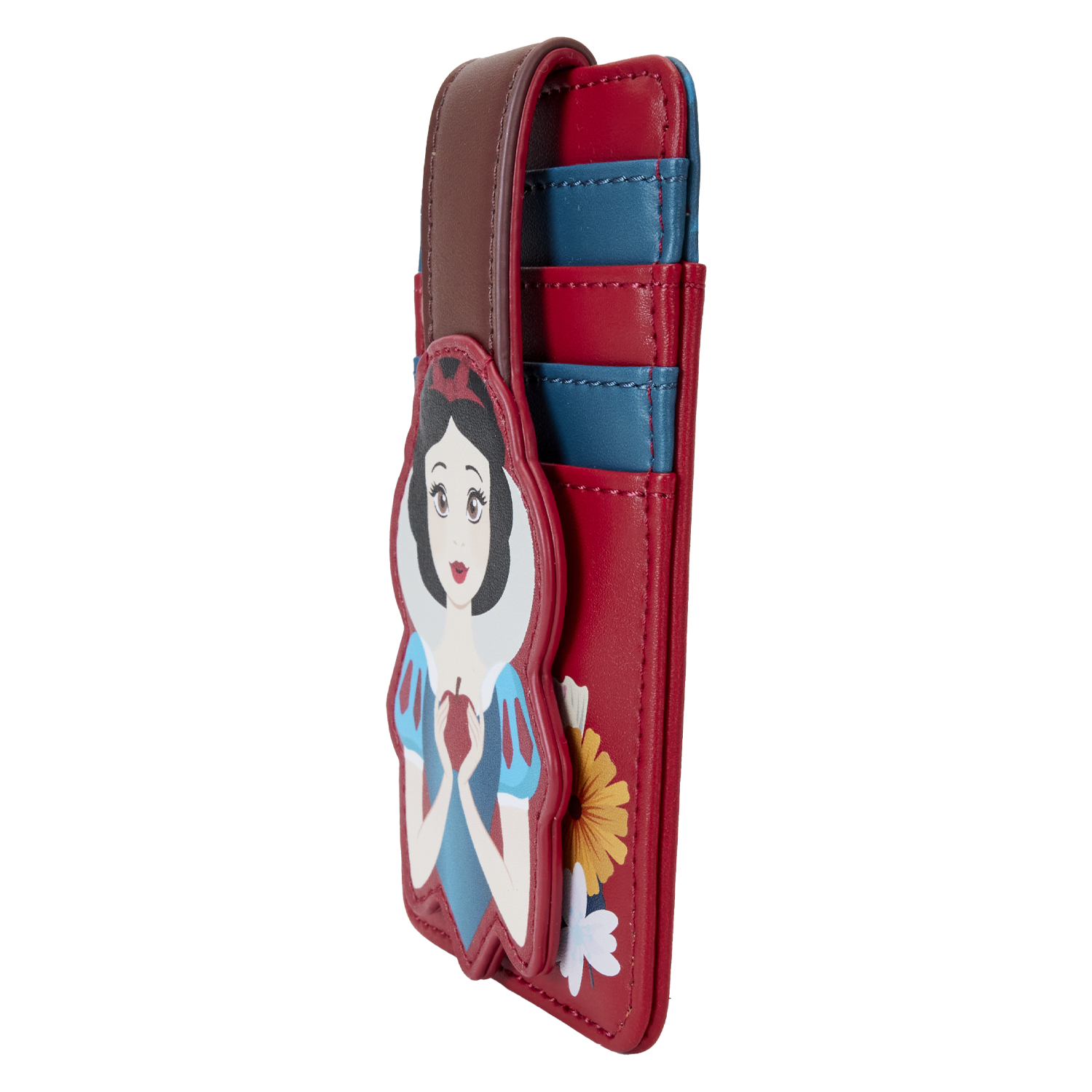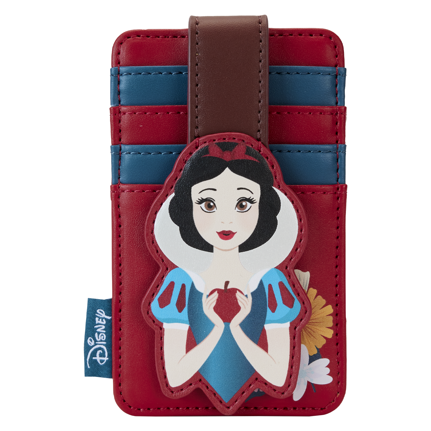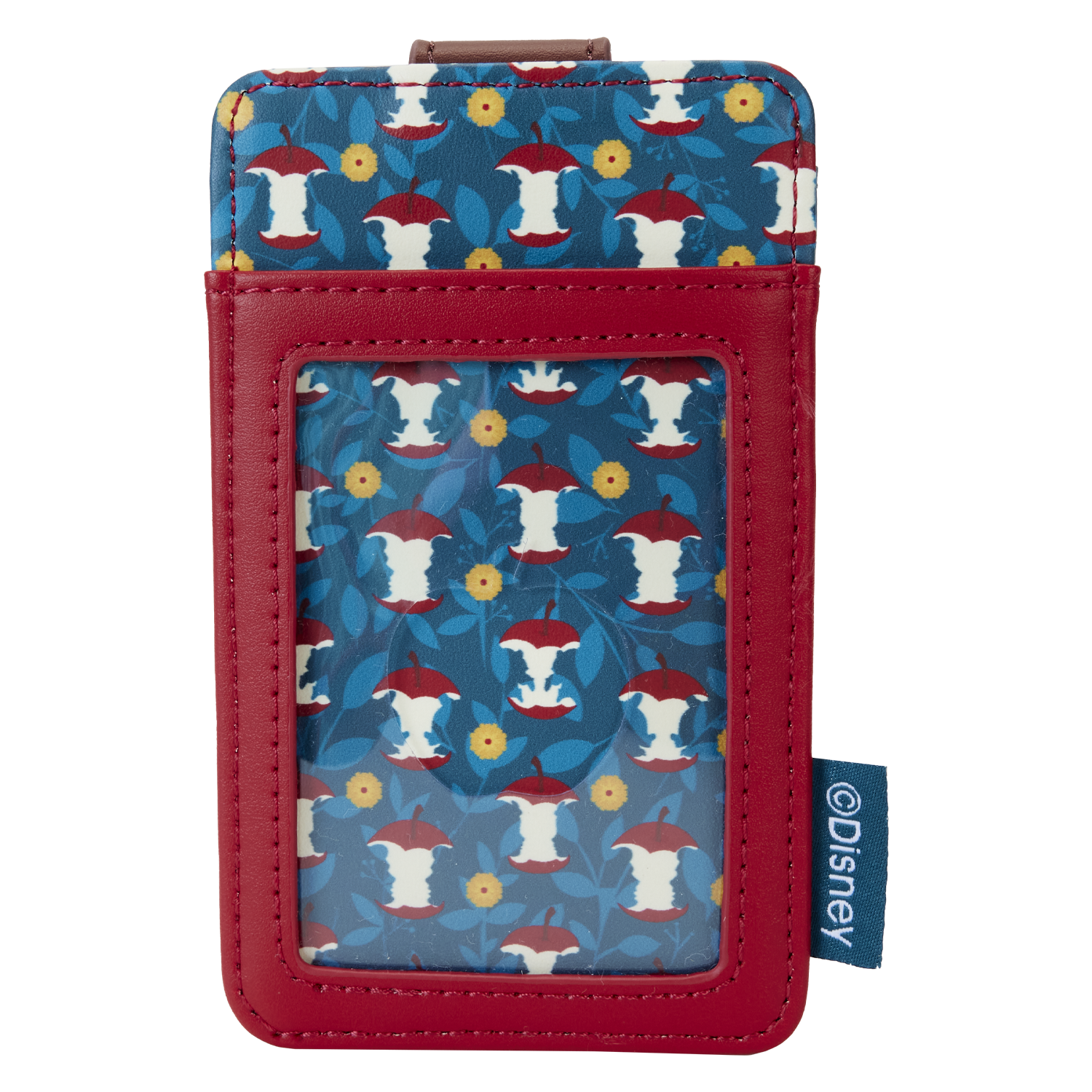 The exclusive Loungefly Disney Snow White Classic Apple Card Holder is made of vegan leather (polyurethane). Additional features include applique and printed details.