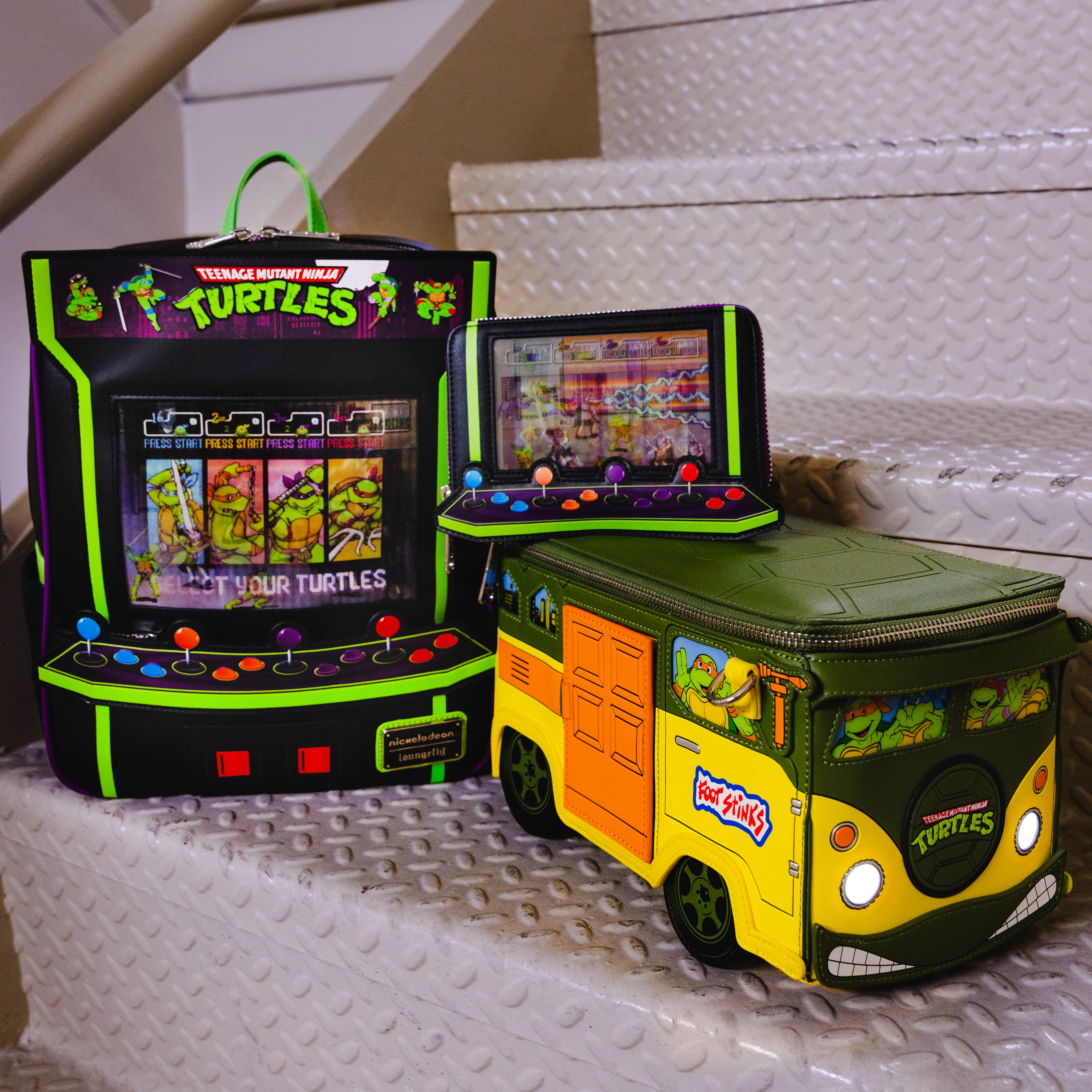 Step into the arcade with a shell of a lot of style. Our Loungefly Teenage Mutant Ninja Turtles 40th Anniversary Vintage Arcade Zip-Around Wallet is ready for action. This accessory is designed with a vintage 1980s arcade video game design in mind. The applique console ledge extends forward with applique joysticks, in various colors, that poke up on top. Debossed and embossed details add textural elements, and the “screen” above includes clear PVC material to make it appear glossy. Lenticular details reveal three different views: two in which the Teenage Mutant Ninja Turtles jump into action in games and another in which you can select a Teenage Mutant Ninja Turtle player to start. In the dark, the green trim glows! Flip the wallet over, and you’ll find the words “Select Your Turtles” in stylized digital print. Inside, you’ll find approximately four slots for holding cards and one clear slot for displaying your ID. A sword-shaped die-cut shape, on the clear slot, adds a touch of adventure. Score big points wherever you go with this fun accessory.