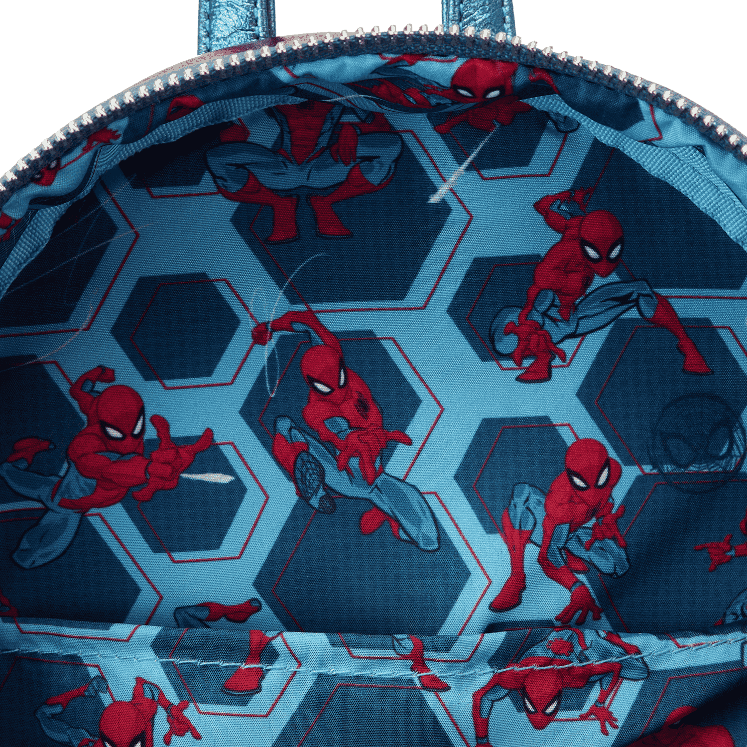 The Loungefly Marvel Metallic Spider-Man Cosplay Mini Backpack is made of vegan leather (polyurethane). Bag has adjustable shoulder straps and sturdy metal hardware. Additional features include applique, holographic, debossed, glitter, and printed details. Take note of the coordinating inside lining.
