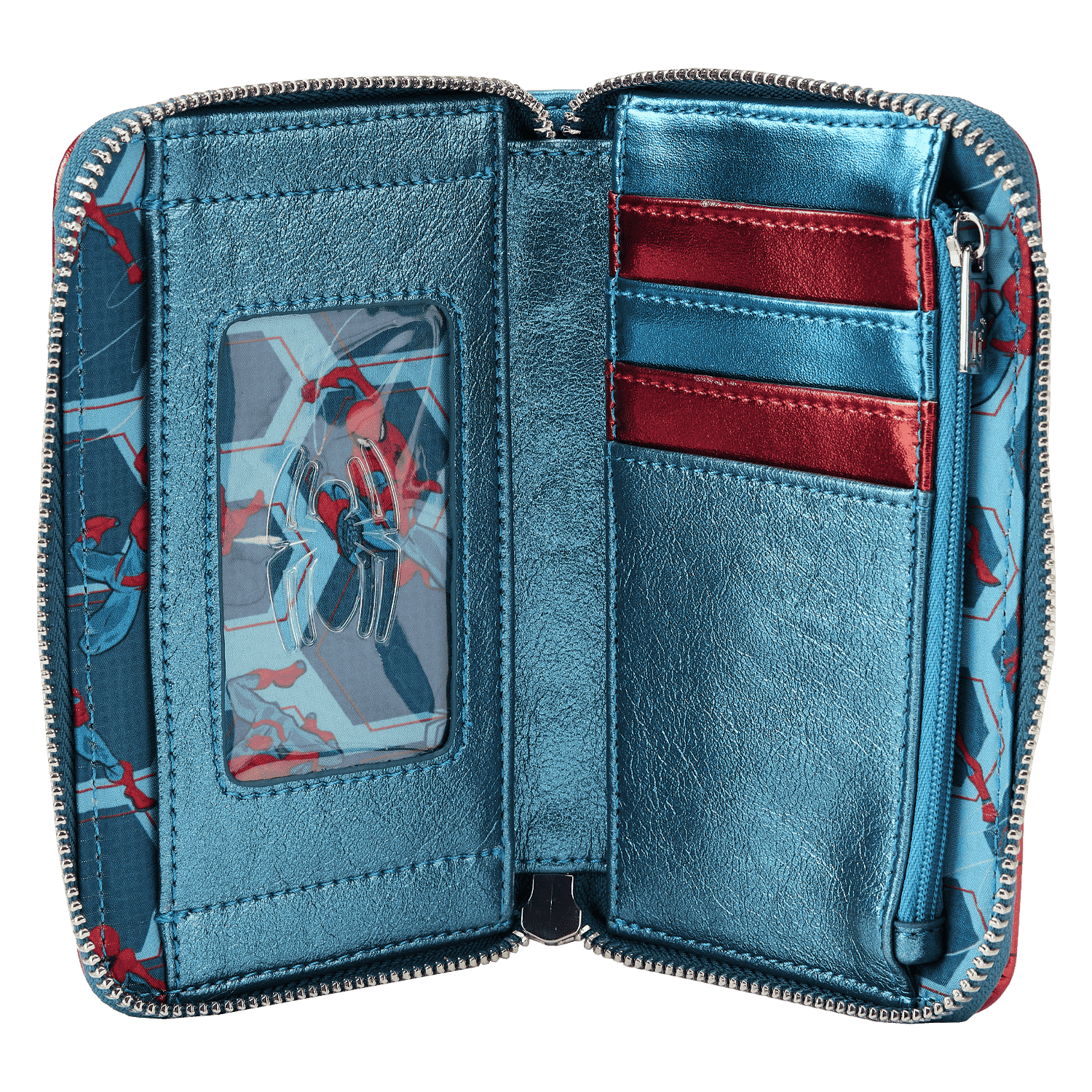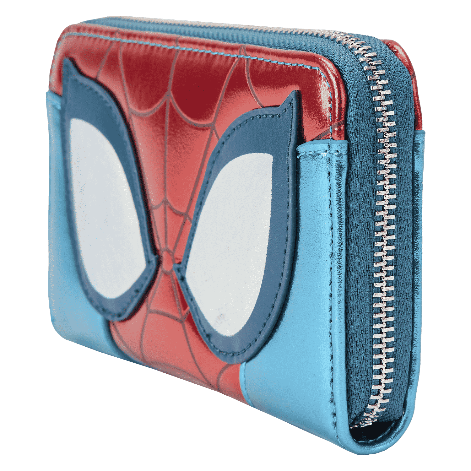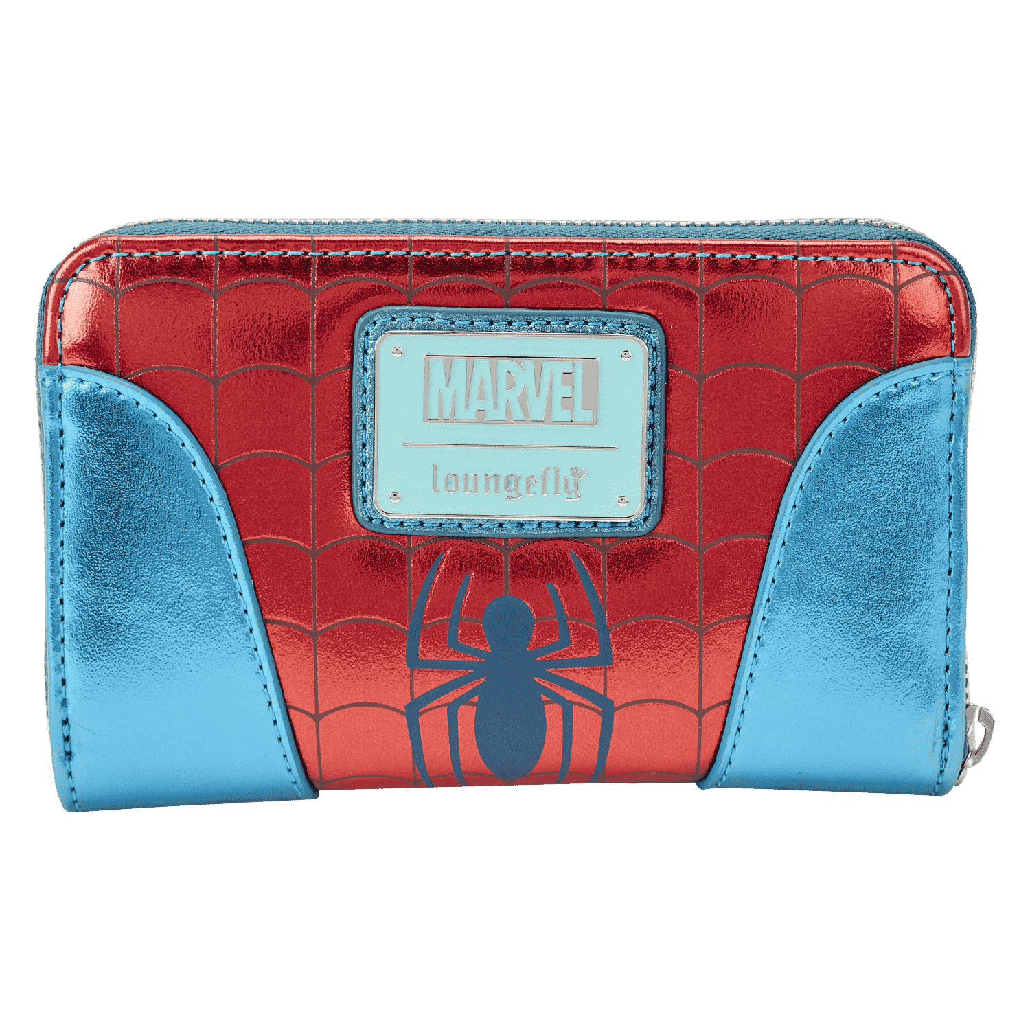 The Loungefly Marvel Metallic Spider-Man Zip Around Wallet is made of vegan leather (polyurethane). Wallet zips closed with sturdy metal hardware. Additional features include applique, holographic, debossed, and printed details. Take note of the coordinating inside lining.