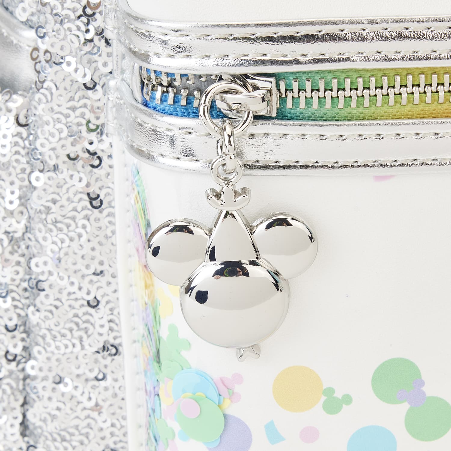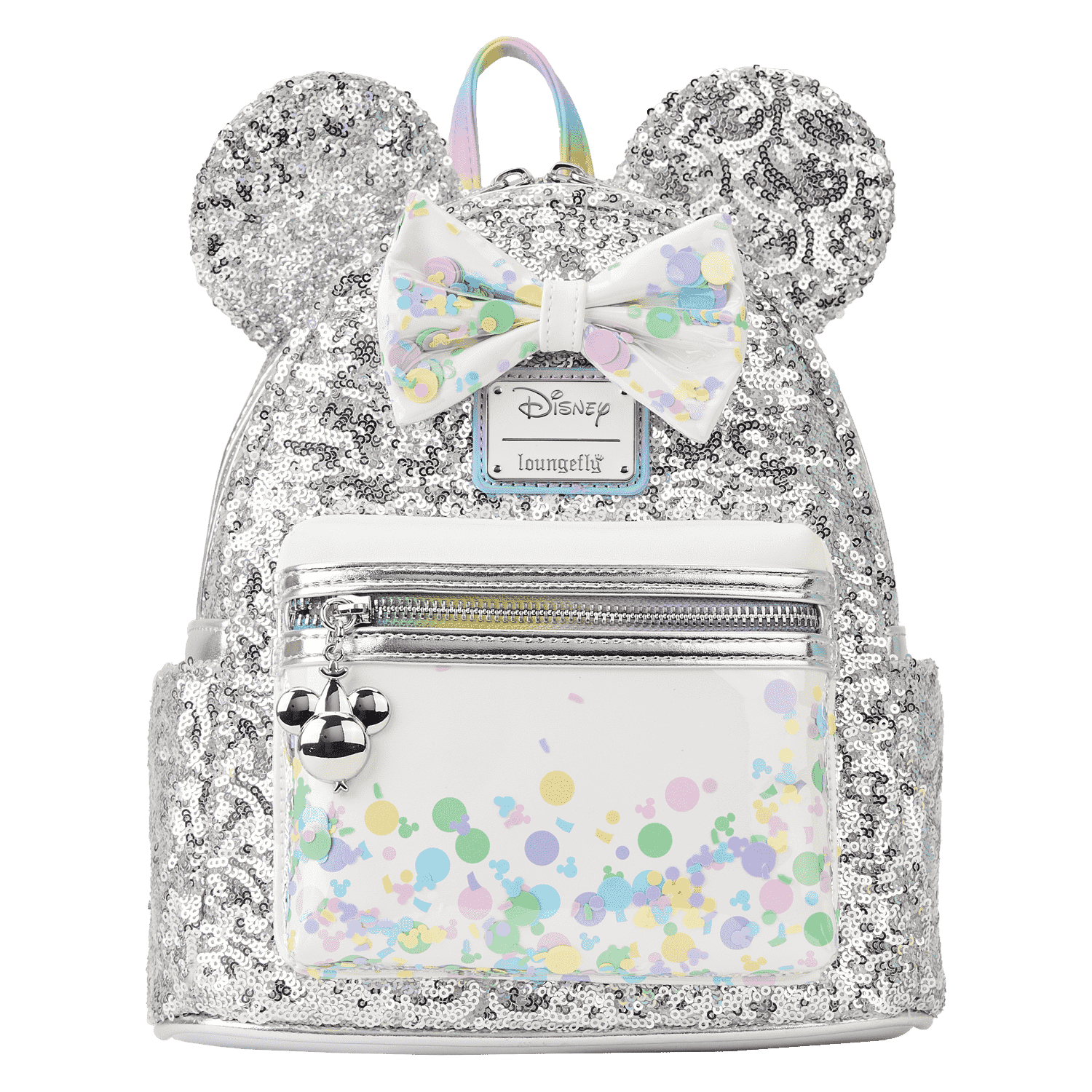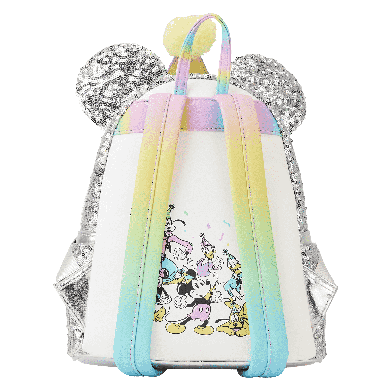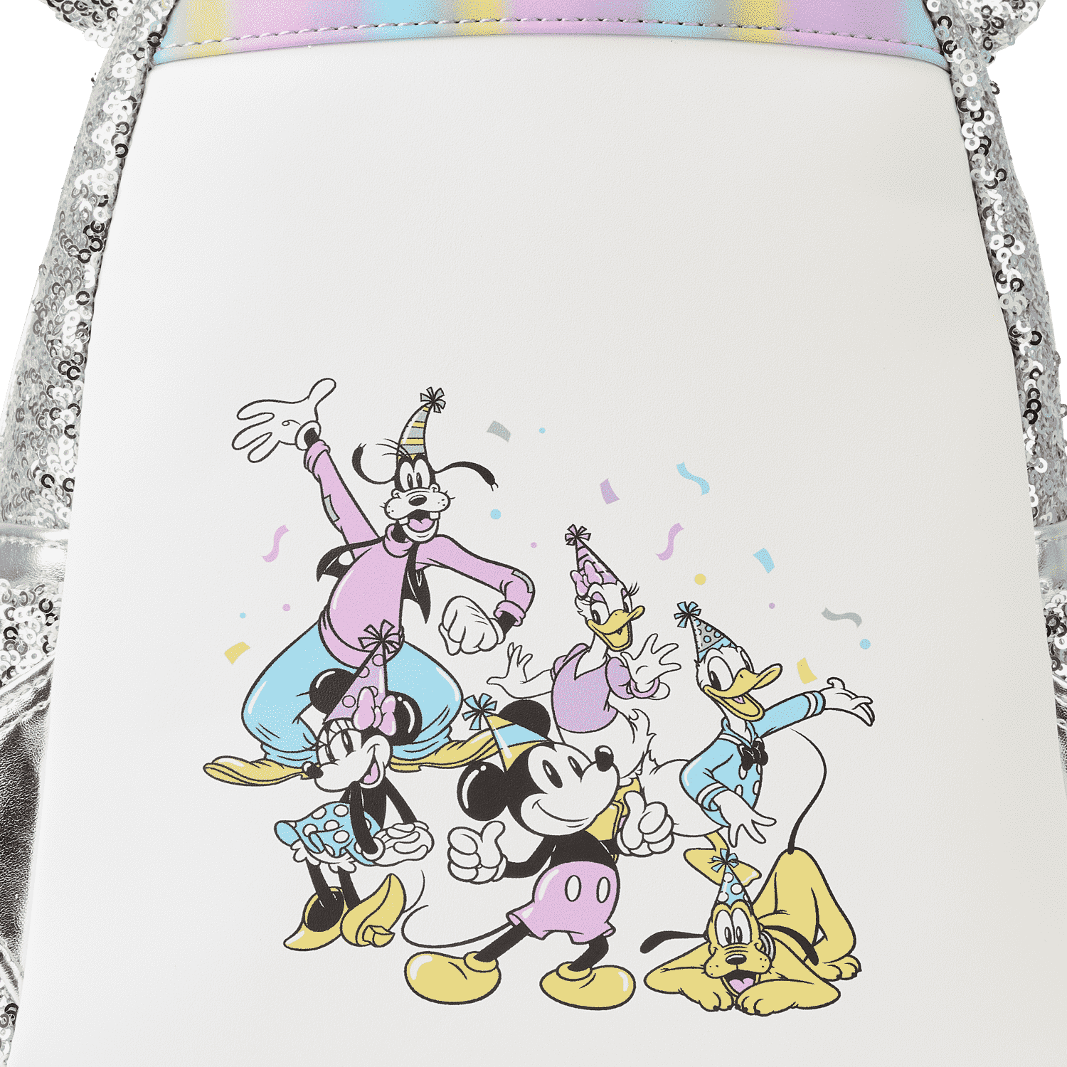 It’s a piece of cake to pull off a festive look with our Loungefly Disney Mickey Mouse and Friends Birthday Celebration Mini Backpack. This accessory is full of fun surprises to help you celebrate a special day. The applique party hat, with metallic rainbow print and a yellow pompom on top, is removable, so you can save it to wear for your birthday. The 3D PVC bow holds colorful confetti sequins, which match the shapes and colors of the sequins on the front zipped pocket. And if you look carefully, you might spot some “hidden Mickeys.” The front zipped pocket also has a silver molded metal zipper charm in the shape of Mickey Mouse’s head and ears, with a party hat on top. The entire backpack is covered in shiny silver sequins, including the signature ears that stick up on top. Rainbow shoulder straps and rainbow zipper tape finish the look. On the back, several characters are ready for the party, including Mickey Mouse, Minnie Mouse, Pluto, Goofy, Donald Duck, and Daisy Duck. Add sparkle wherever you go with this charming accessory.