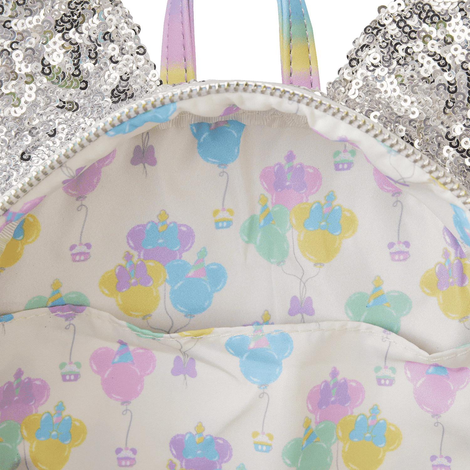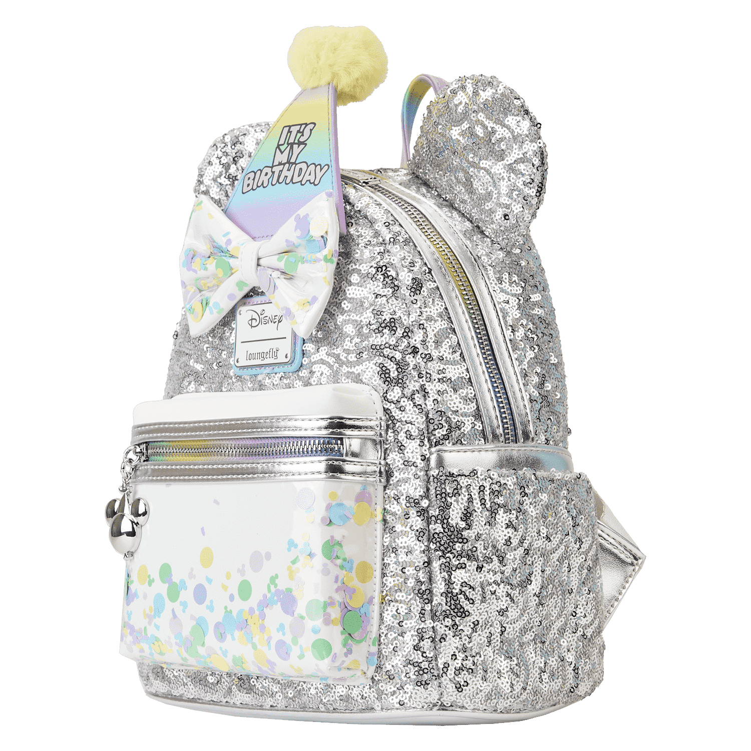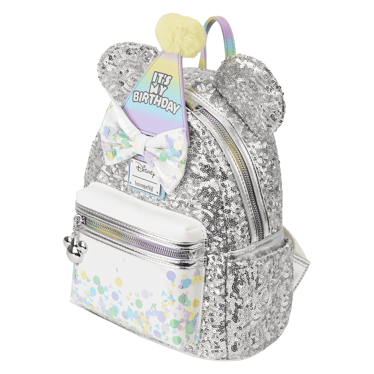 The Loungefly Disney Mickey Mouse and Friends Birthday Celebration Mini Backpack is made of vegan leather (polyurethane). Bag has adjustable shoulder straps, side pockets, a removable applique party hat, and shiny silver-colored metal hardware. Additional features include applique, printed, zipper charm, sequin, and 3D PVC bow details. Take note of the coordinating inside lining.