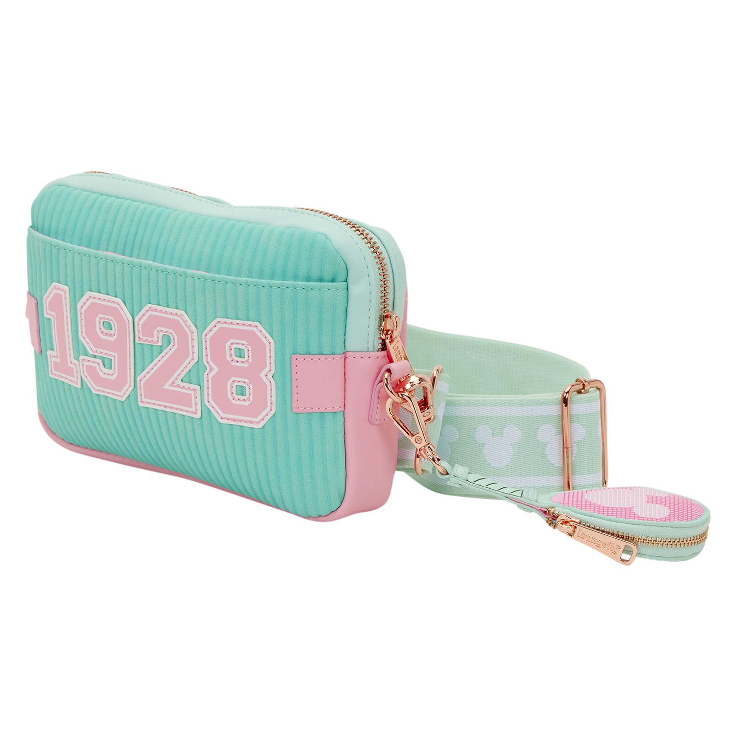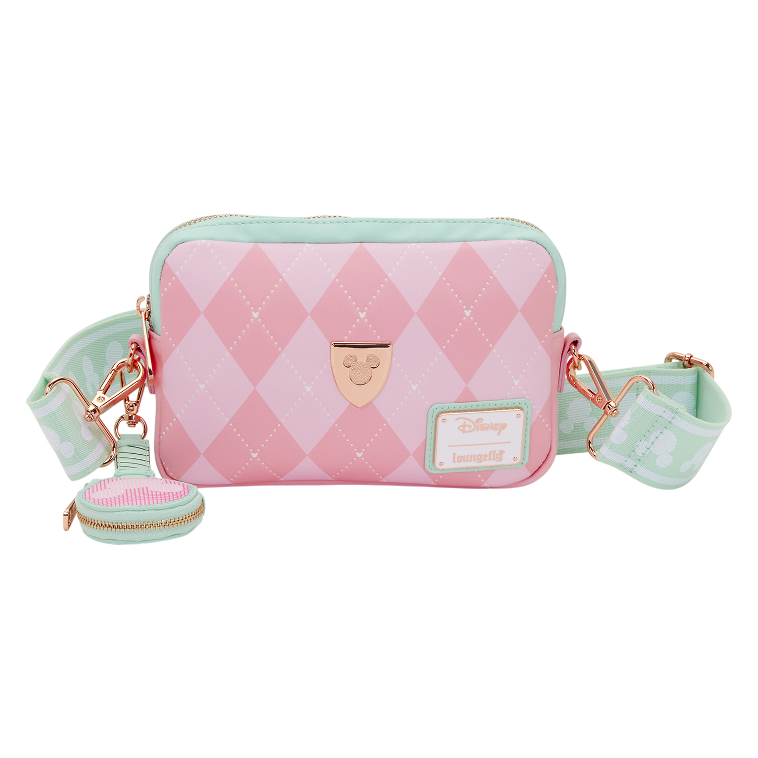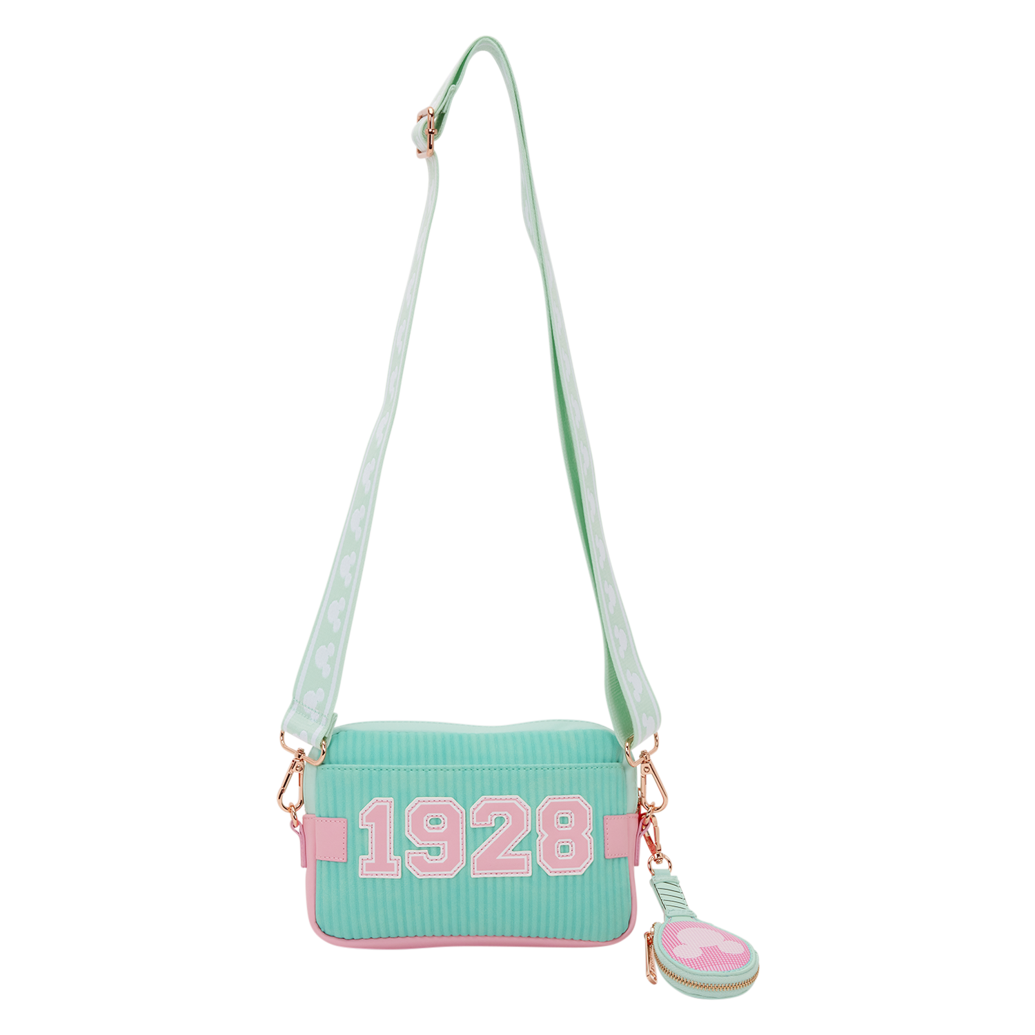 This sling bag combines Disney style with tennis fashion. You'll find a pink argyle pattern on the front of the bag with a 3D molded metal charm featuring Mickey Mouse's silhouette! Turn the bag around to find a pink applique against a green background that says "1928." Attached to the sling is a coin bag in the shape of a tennis racket!