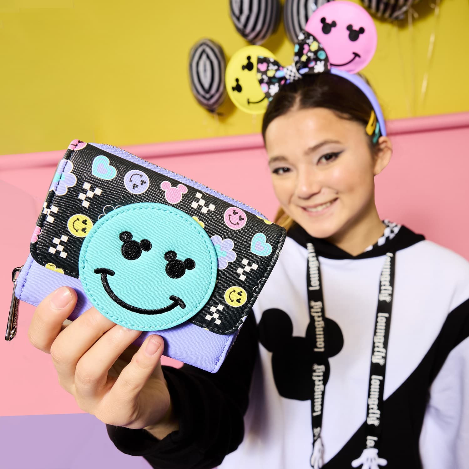 Add some bling to your wardrobe with a trendy throwback! The Loungefly Mickey Y2K Flap Wallet rewinds motifs from the early 2000s, featuring an allover print of pastel hearts, stars, flowers, and more. A smiley face takes shape on the front of the wallet, snapping an exterior pocket in place. With four slots for holding cards and a clear slot for holding ID, this totally sweet accessory will keep your belongings safe while you’re hanging with your BFFs.