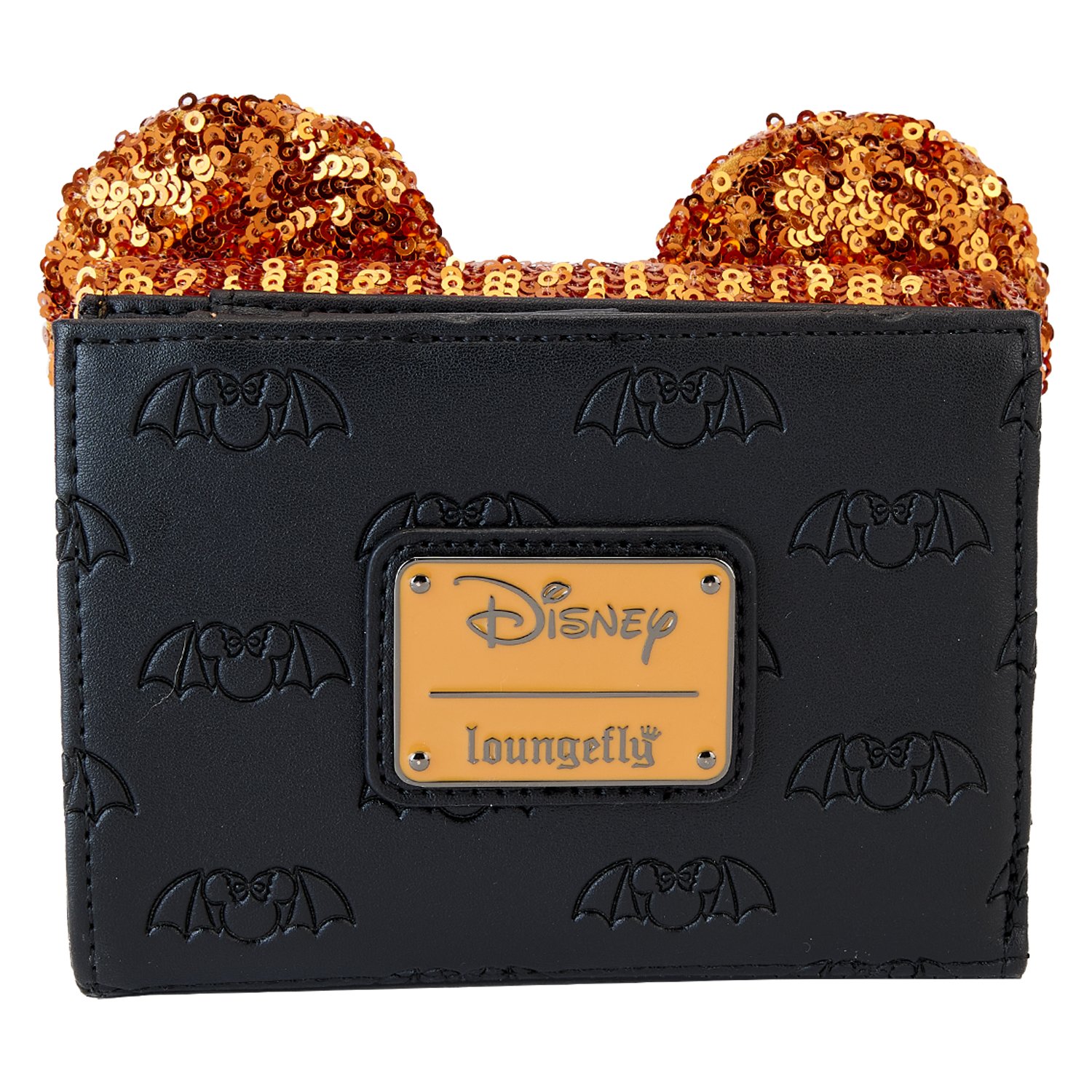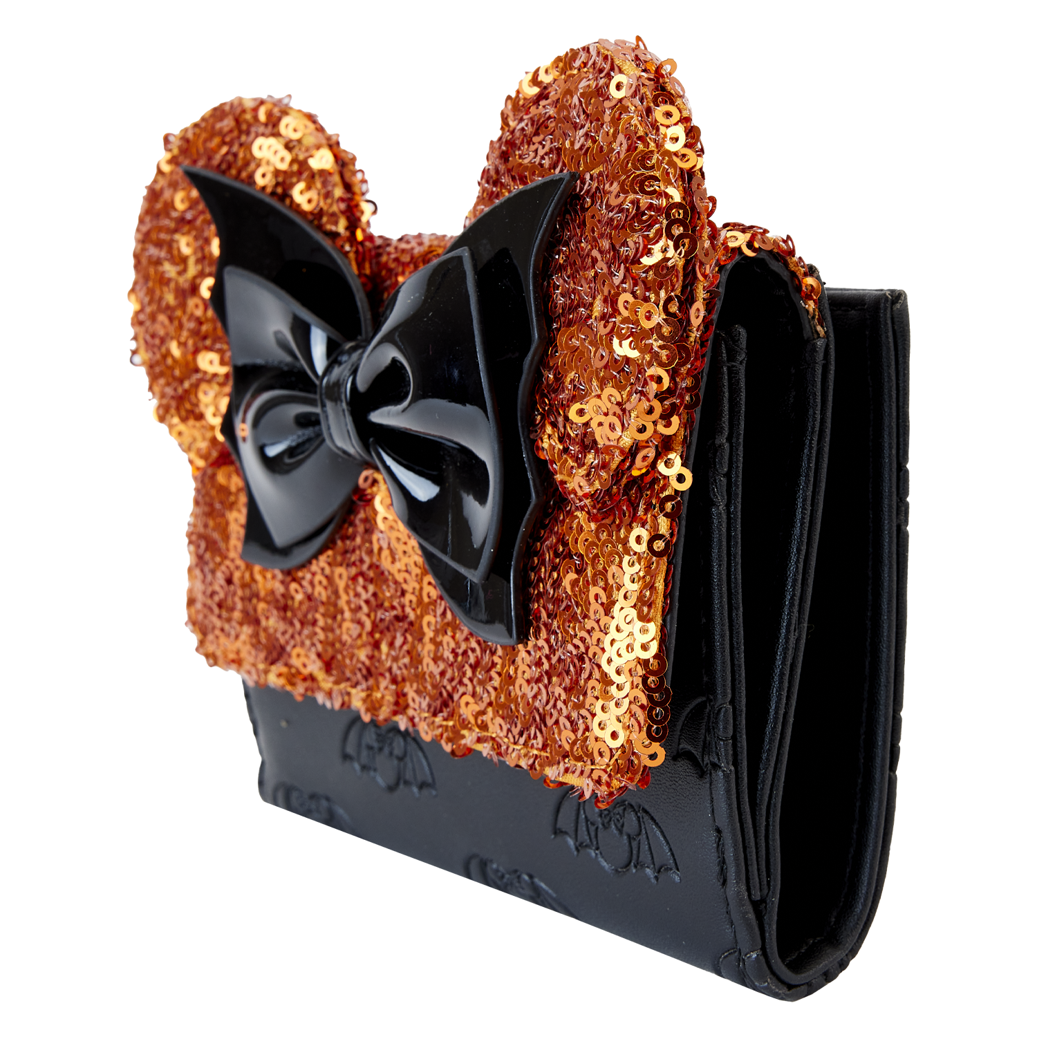 Let your wings take flight! The exclusive Loungefly Halloween Minnie Sequin Flap Wallet adds some extra glam to your daily haunts. Across the wallet, an allover print shows a debossed pattern of Minnie Mouse’s iconic silhouette with bat wings. Orange sequins highlight the top flap, which features a 3D bat-shaped bow between a pair of Minnie ears. The back features a zippered pouch for storing coins or other important items. Open the wallet to reveal three slots for holding cards and a clear slot for ID, which features a die-cut Minnie Mouse silhouette. This accessory is the perfect addition to any fall outing and will keep you looking fly throughout the night. Act fast to secure this exclusive Loungefly accessory; supplies are limited.