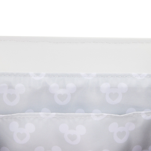 The Loungefly Minnie Mouse Sequin Wedding Crossbody Bag is made of vegan leather (polyurethane). Bag has adjustable shoulder strap (detachable), sturdy metal hardware, and 3D interchangeable bows. Additional features include sequin, applique, and metal ring details. Take note of the coordinating inside lining.
