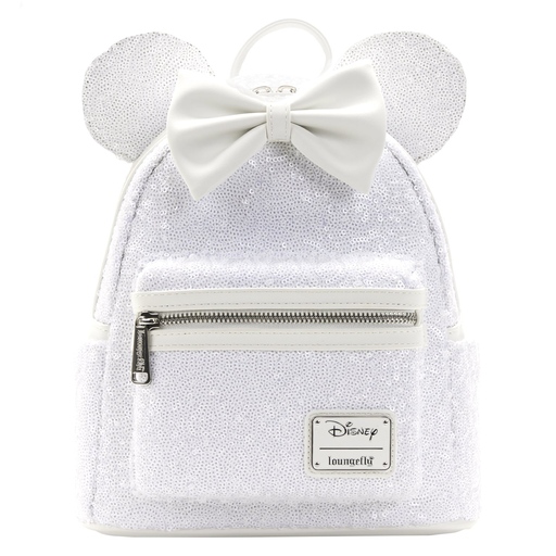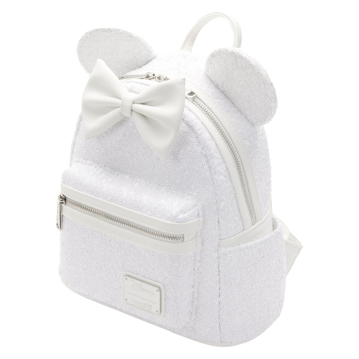 The Loungefly Minnie Mouse Sequin Wedding Mini Backpack is made of vegan leather (polyurethane). Bag has adjustable shoulder straps, sturdy metal hardware and 3D interchangeable bows. Additional features include sequin, applique, debossed, and metal ring details. Take note of the coordinating inside lining.
