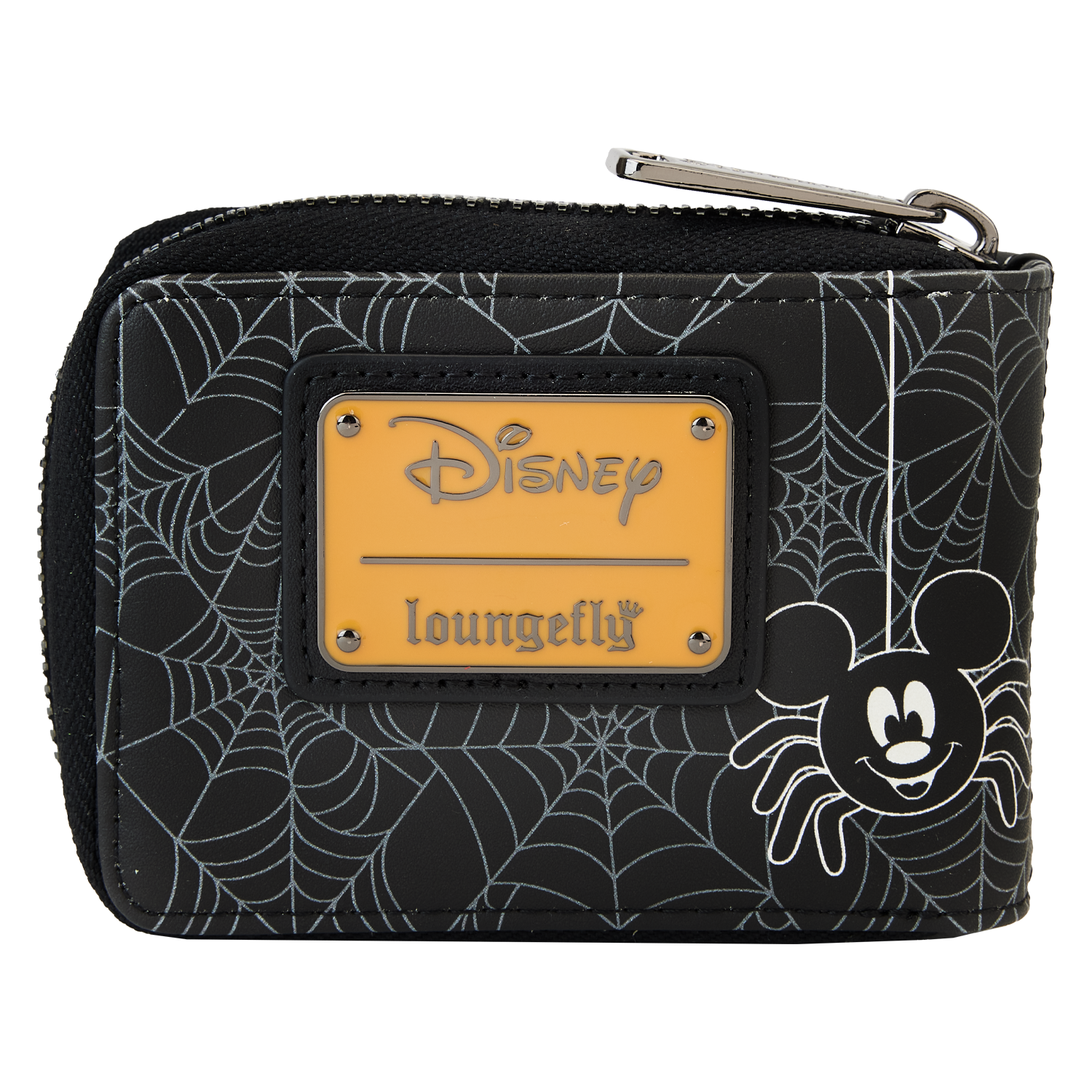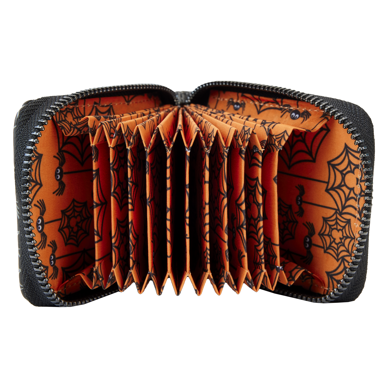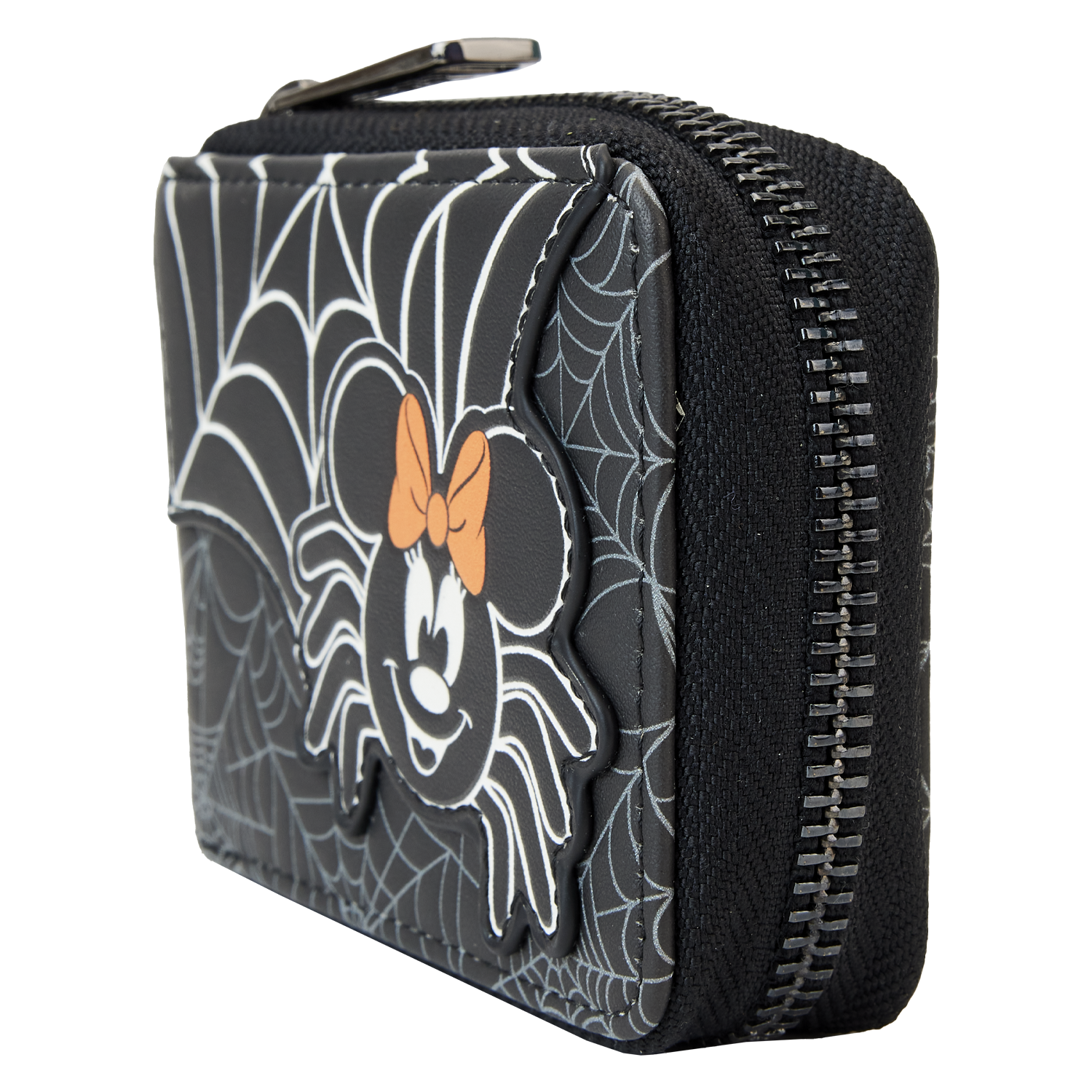 The Loungefly Disney Minnie Mouse Spider Accordion Wallet is made of vegan leather (polyurethane). Wallet zips closed and has sturdy gunmetal-colored hardware. Additional features include printed, applique, debossed, and glow-in-the-dark details. Take note of the coordinating inside lining.