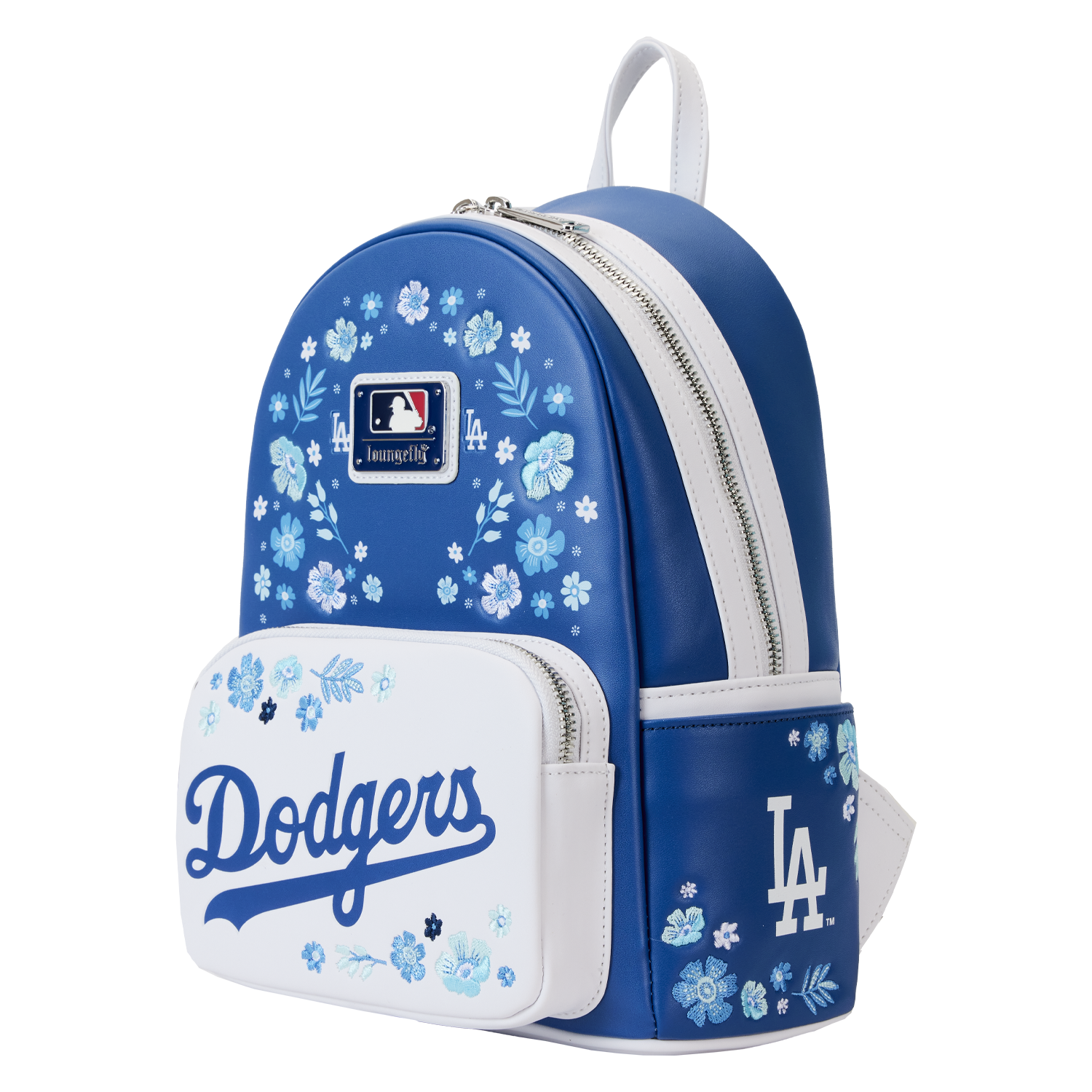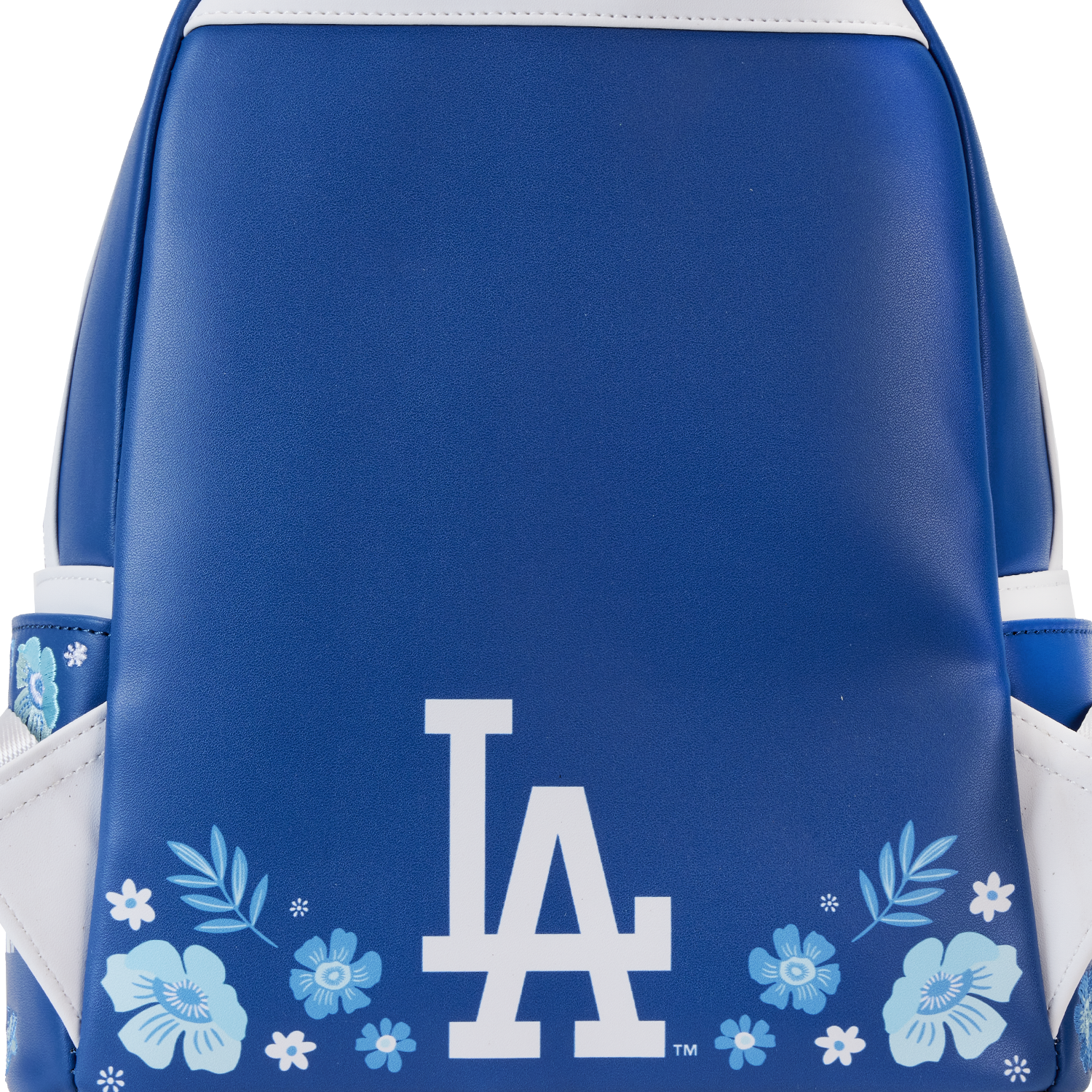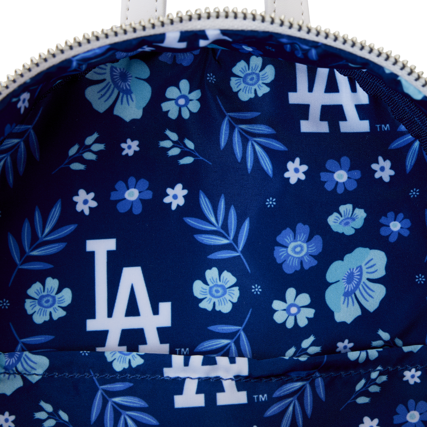 The Loungefly Los Angeles Dodgers Floral Mini Backpack is made of vegan leather (polyurethane). Bag has adjustable shoulder straps and shiny silver hardware. Additional features include embossed, embroidered, and printed details. Take note of the coordinating inside lining.