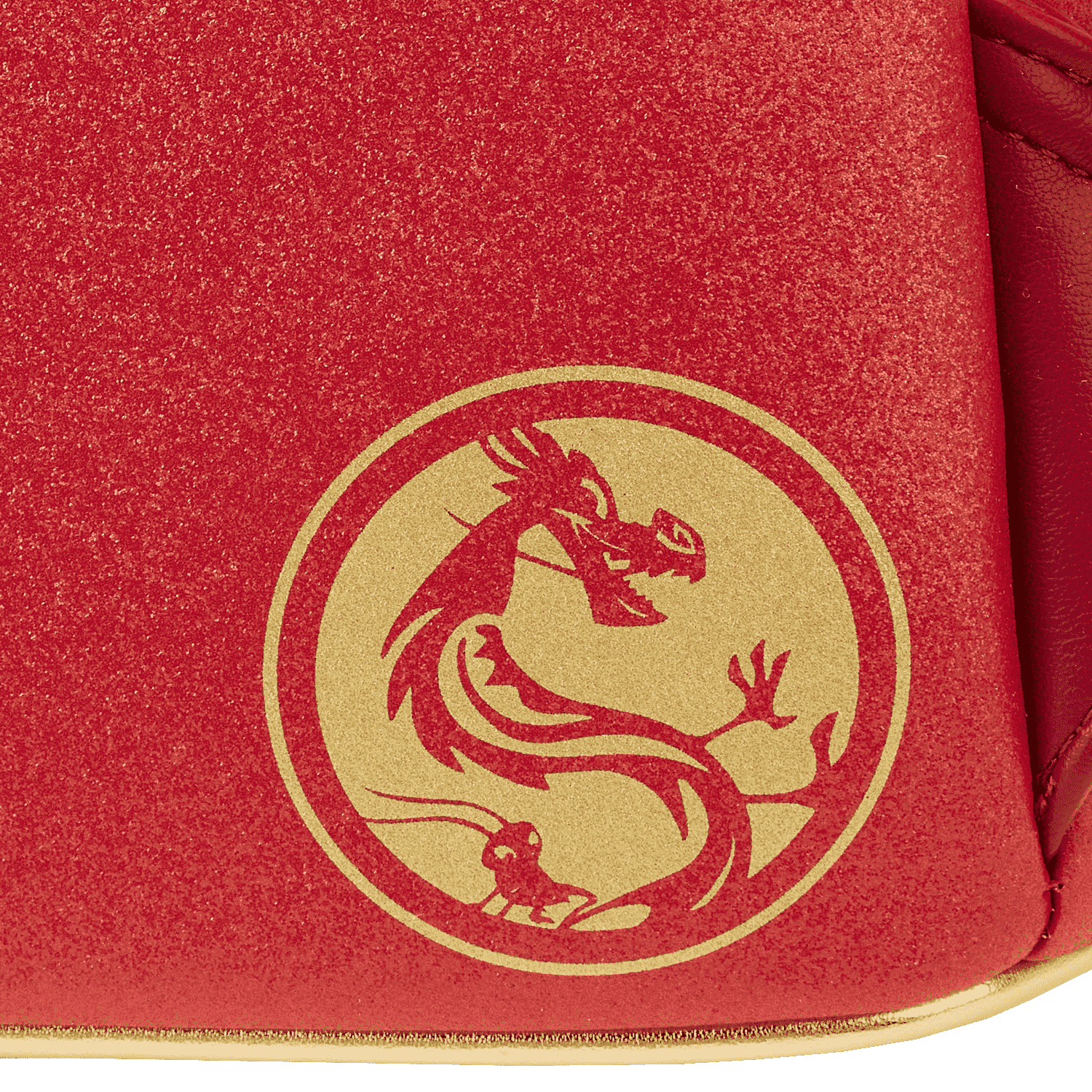 Begin your journey to mastery with something sparkly—and “travel-sized for your convenience.” Say, “Ahhh!” and get ready for some fun with our Loungefly Disney Mulan 25th Anniversary Mushu Glitter Cosplay Mini Backpack. Mushu comes to life in applique form, his head rising up over the top of the backpack. Allover red glitter vegan leather and gold-foil details add a show-stopping shine. On the front gold pocket, Mushu’s arms cradle Cri-Kee, who makes a starring appearance. Applique pink blossoms, on the shoulder straps and on the side pockets, create a delicate touch. On the back, the Crest of the Emperor appears in shiny gold and red. Transform any outing into an action-filled adventure.