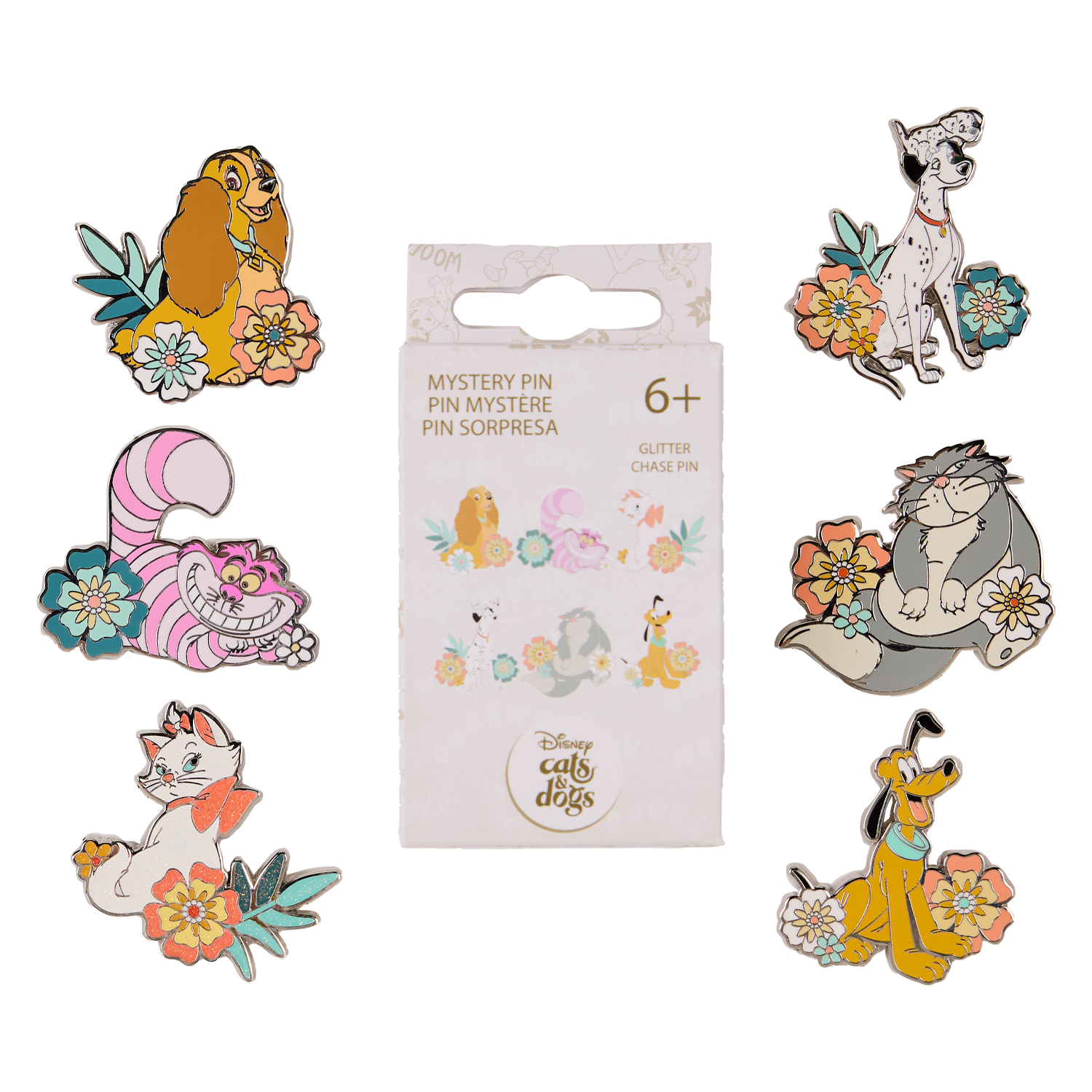 These mystery pins are inspired by iconic Disney dogs and cats in different poses with flowers. There are six different pins you can collect. There's a 1 in 12 chance to collect the glitter chase!