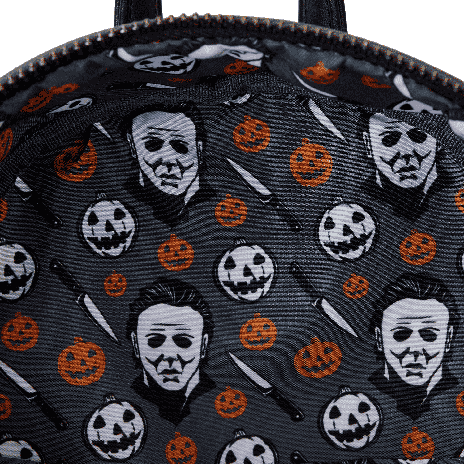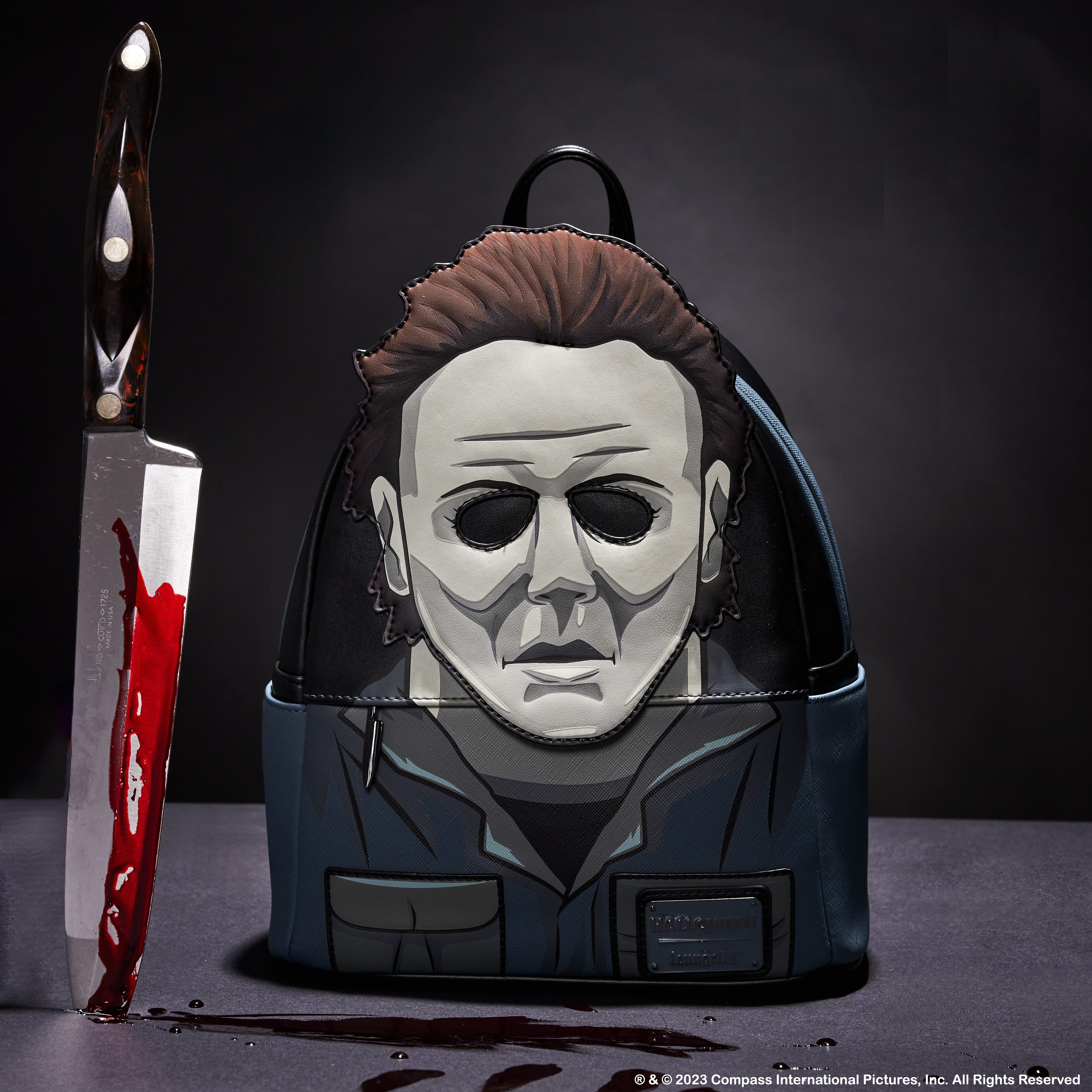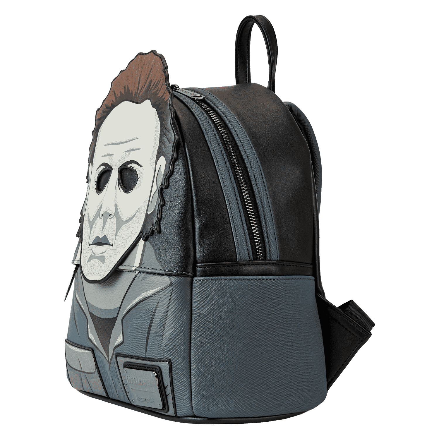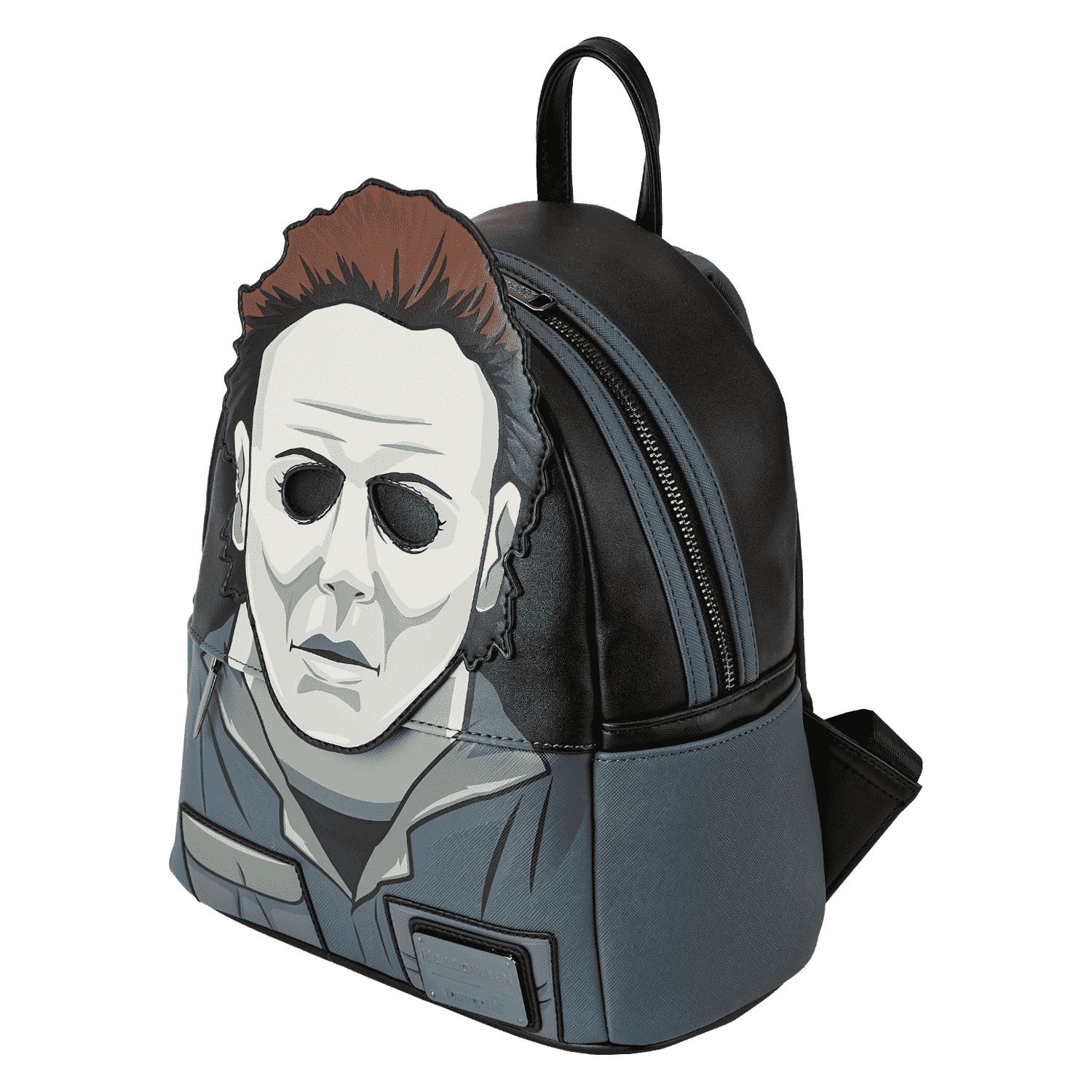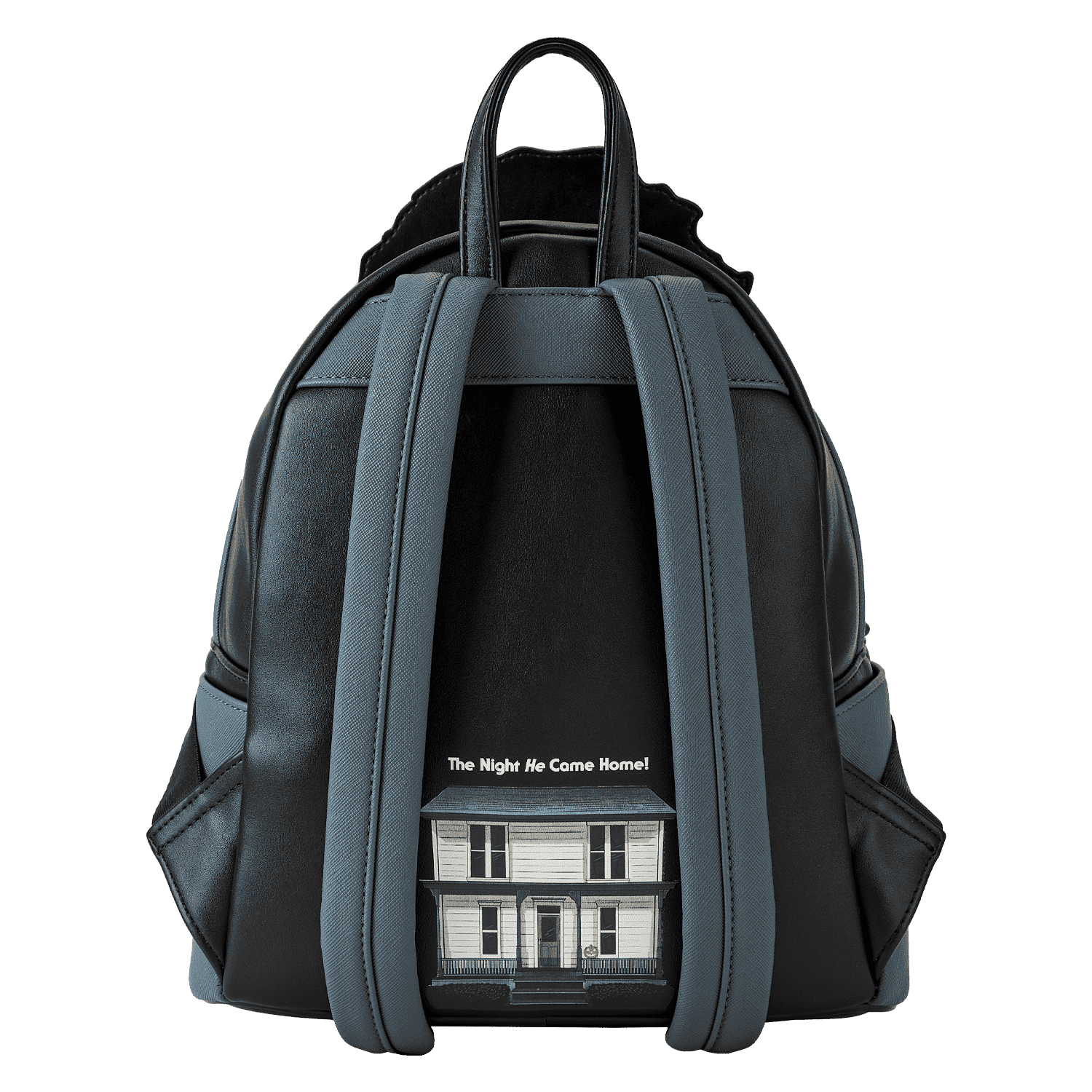 Cue the haunting theme song and look sharp! Make an entrance with our Loungefly Michael Myers Halloween Cosplay Mini Backpack. Michael Myers’ eerie, masked face comes to life in applique detail, rising up over the top edge of the backpack. In the dark, the entire face glows! The front zipped pocket features applique shirt pockets and a collar. A metal zipper charm, in the shape of a knife, is a pointed nod to the legacy of this slasher film. On the back, you’ll find the famous house setting for this classic Halloween movie, along with the words, “The Night He Came Home”—and they glow in the dark! Pack just what you need to enjoy a night of fun watching scary movies at friends’ houses—or simply visit your favorite haunts in style.