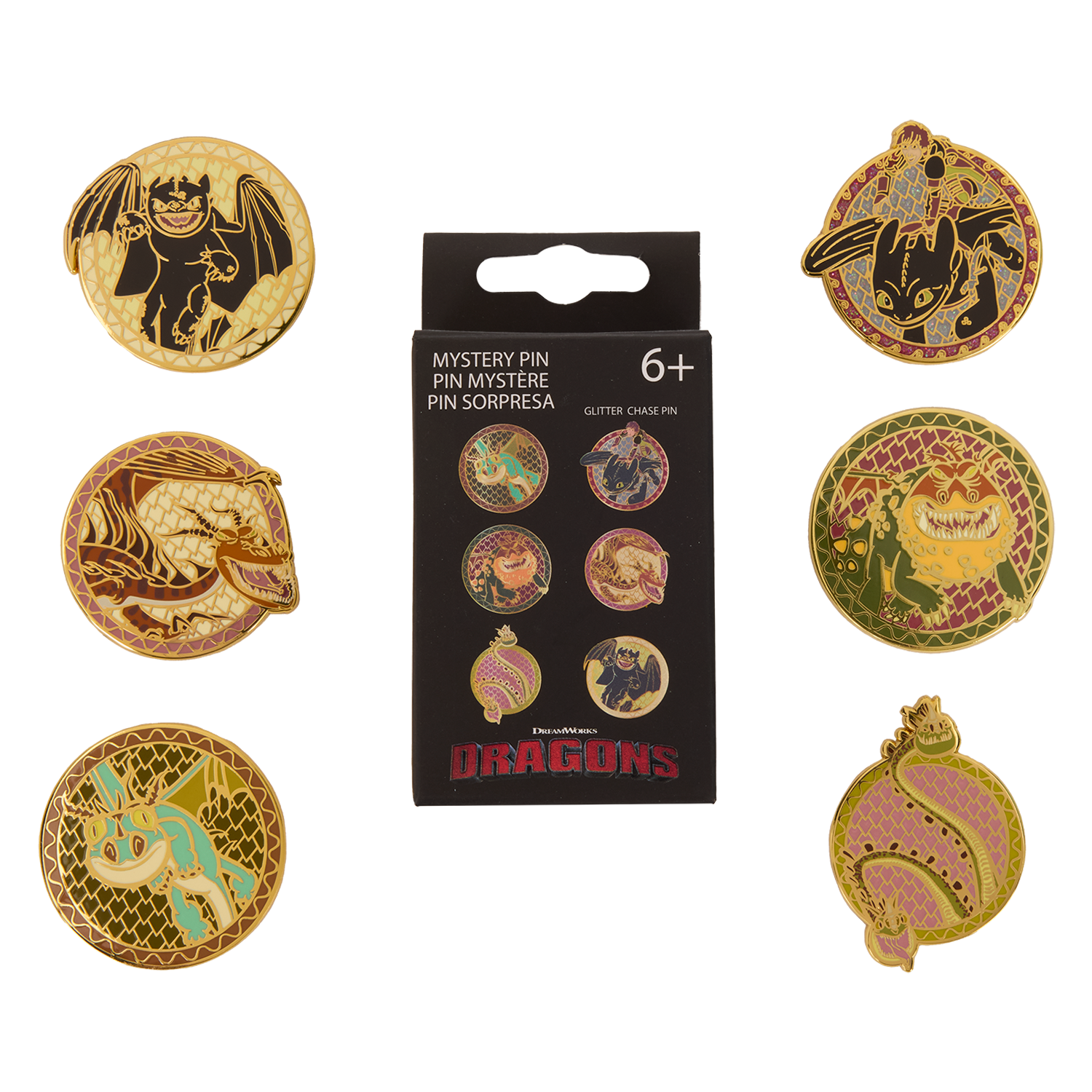 There are six different pins you can collect: Toothless, Barf and Belch, Hookfang, Meatlug, and Terrible Terror. You have a 1 in 12 chance to get the glitter chase featuring Hiccup and Toothless!