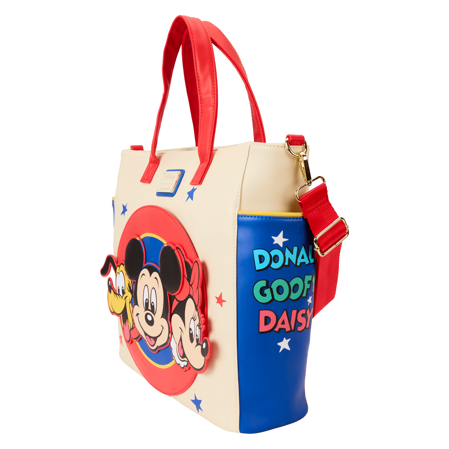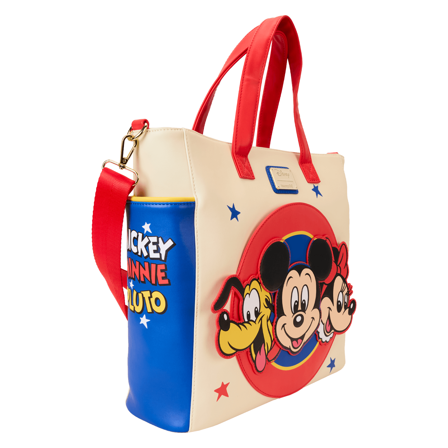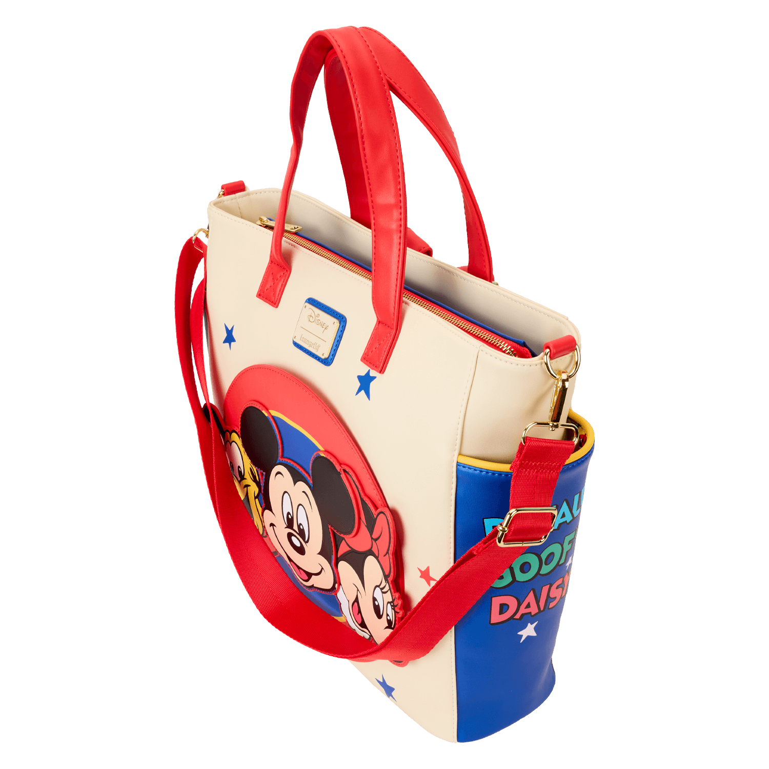 Open the curtains and start the show! Bring star power wherever you go. Take along our Disney’s Mickey Mouse and Friends tote bag. This versatile accessory, which converts to a backpack, features a timeless, classic look in all kinds of colorful details. Front and center, you’ll find a circular applique in bold colors with the faces of Disney’s Mickey Mouse, Minnie Mouse, and Pluto in the middle. An extra sprinkle of printed stars surrounds them. Color-blocking adds a splash of brilliance. Flip the tote bag around, and you’ll see Disney’s Donald Duck, Daisy Duck, and Pluto. The side panels feature their names in vivid colors as well. Pack your daily essentials in this roomy bag and set off on all kinds of star-studded adventures.