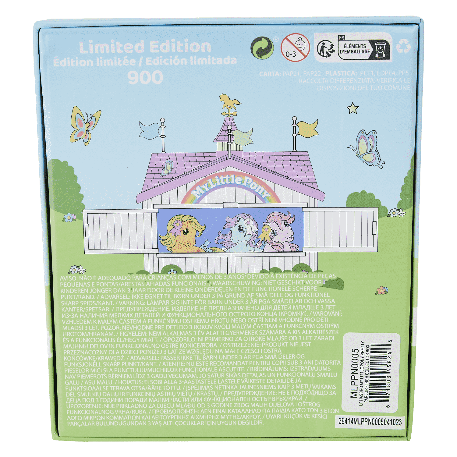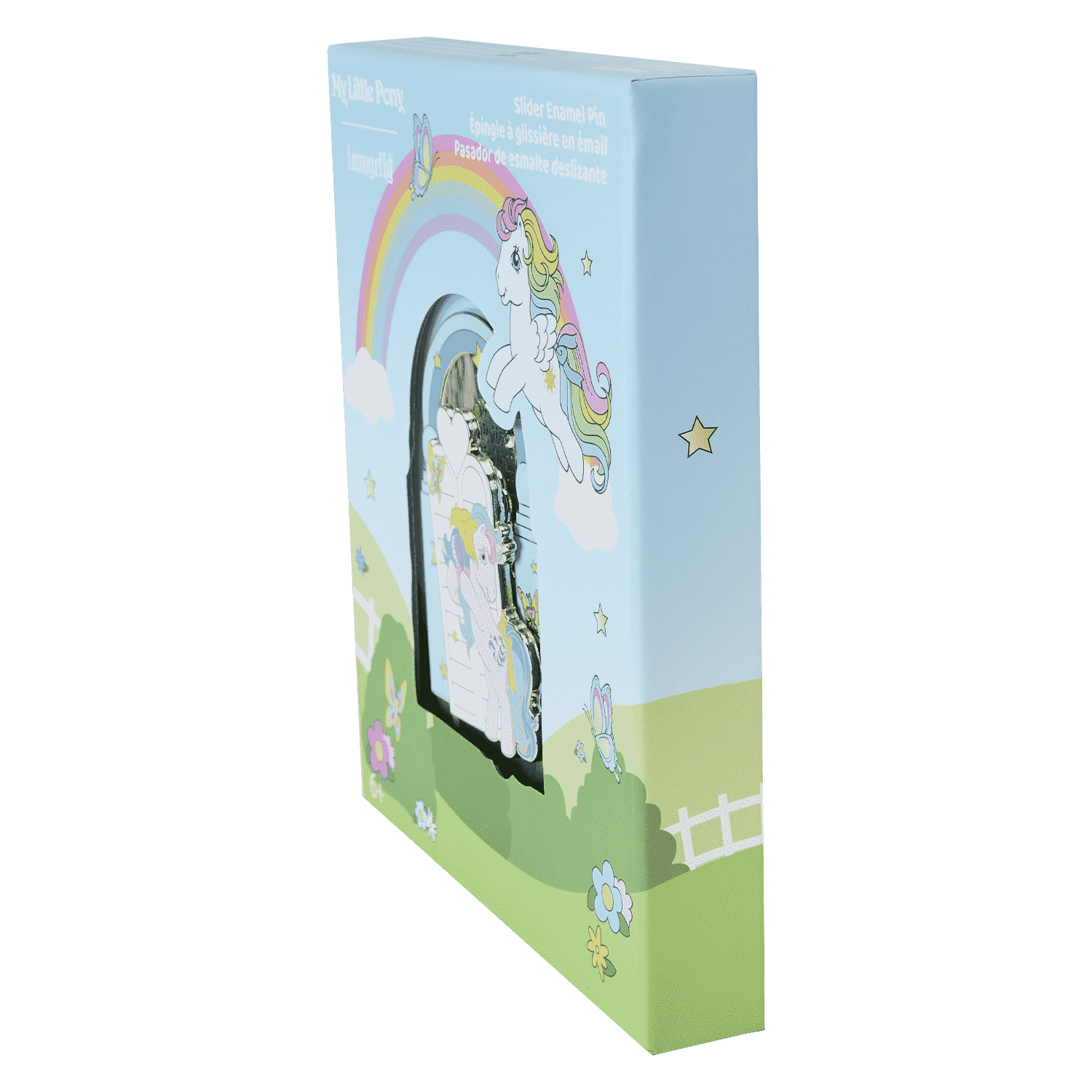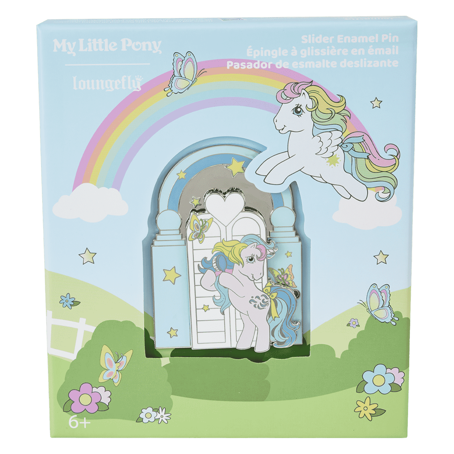 Retreat to a beloved childhood classic and open the stable doors to find some My Little Pony favorites. The Loungefly Hasbro My Little Pony® 40th Anniversary Pretty Parlor Enamel Pin is ready to shine in your collection. This whimsical accessory portrays the Pretty Parlor where you’ll find Windy brushing her mane in front of the parlor doors. Slide the parlor door to the side and find Peachy in front of a shiny silver mirror! This pin is a breath of fresh air to any set and a perfect addition to your My Little Pony collection.