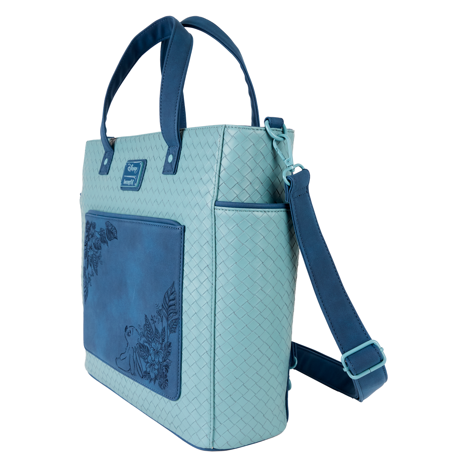 This convertible tote bag features Stitch sitting amongst embroidered flowers on the front. Convert it between a backpack and a crossbody for easy carrying while you're traveling!
