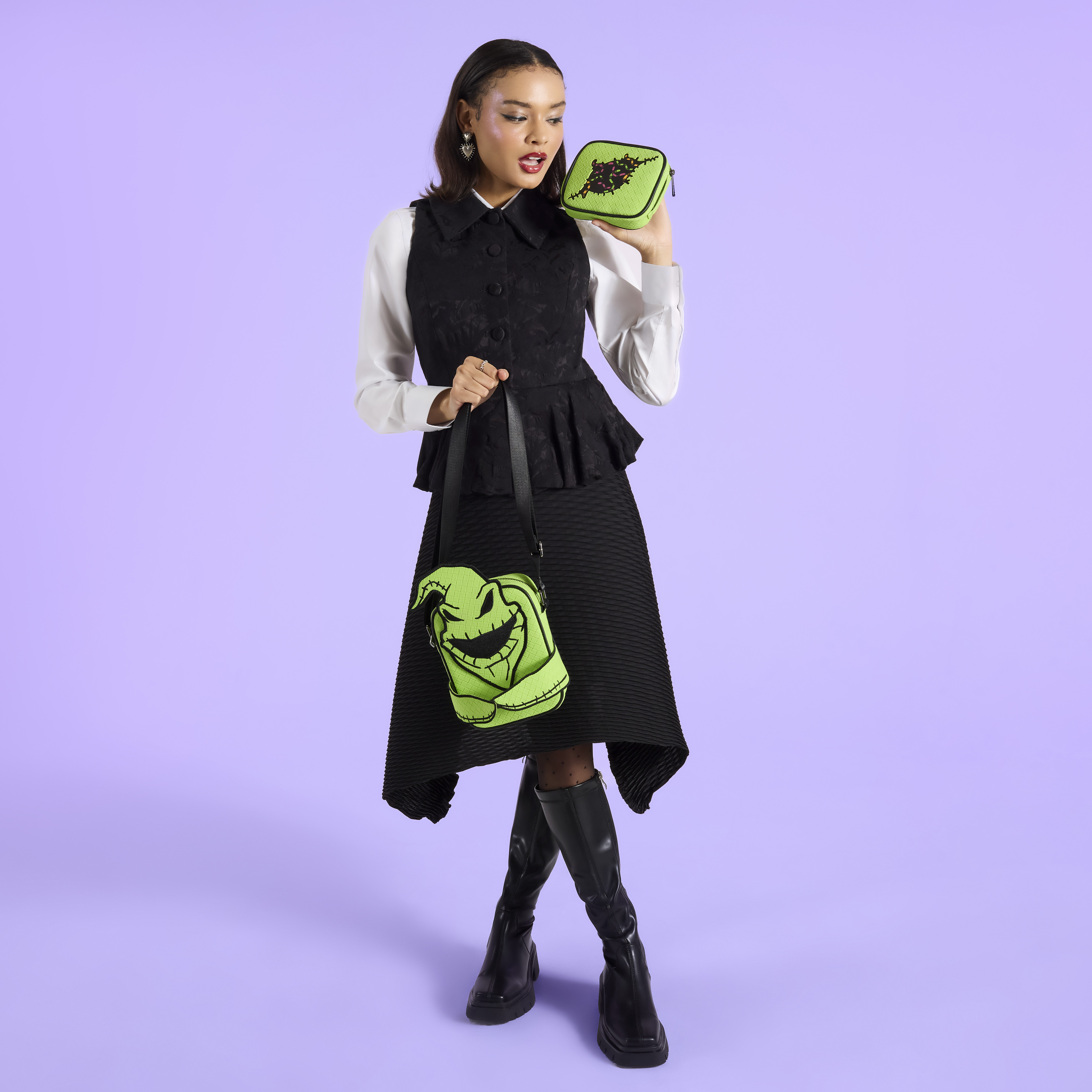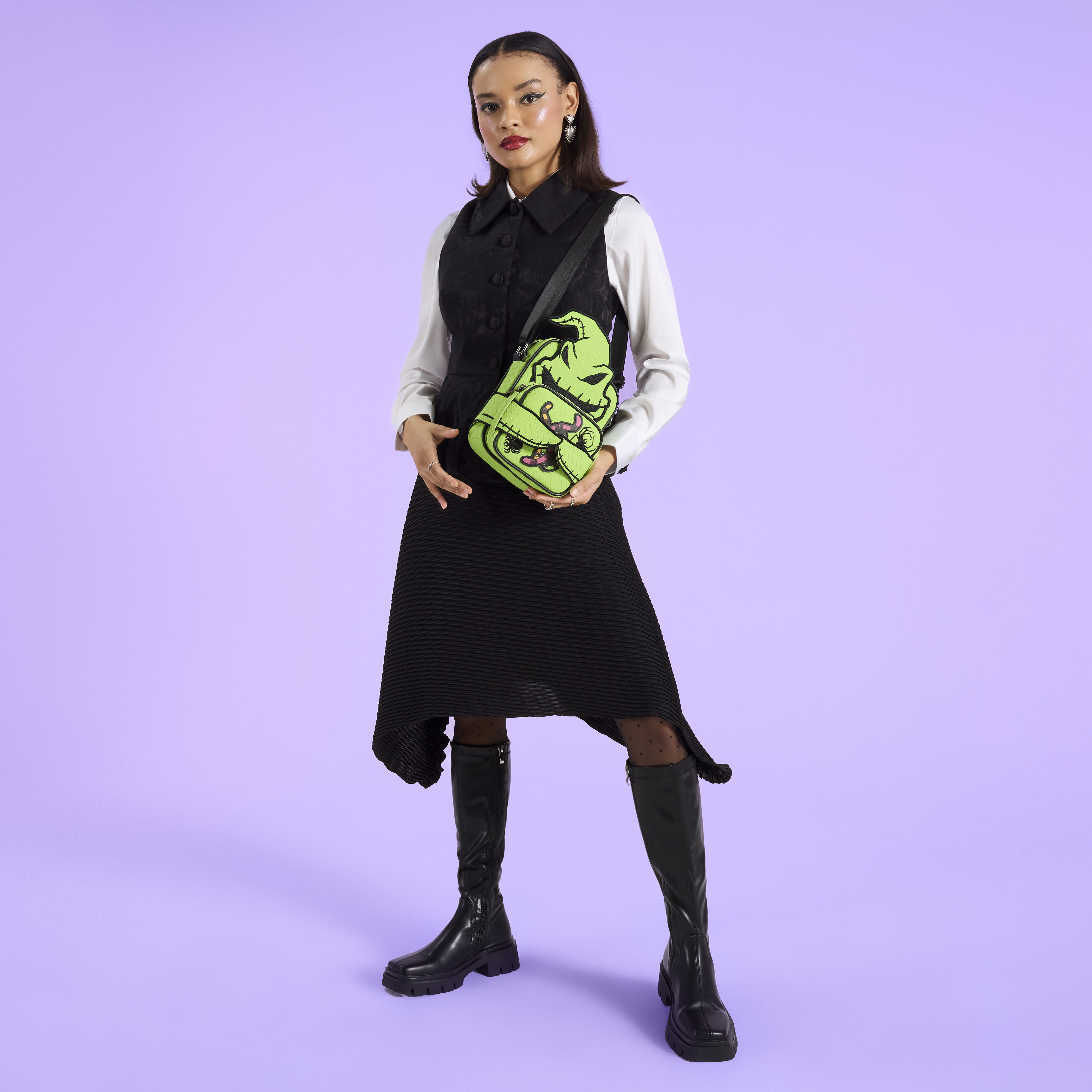 This crossbody bag features an applique of Oogie Boogie front and center. His two arms wrap around a removable and reversible coin pouch: one side features spiders and worms and the other side features creepy crawlies spilling out of a "tear." Oh, and the best part? This bag glows in the dark!
