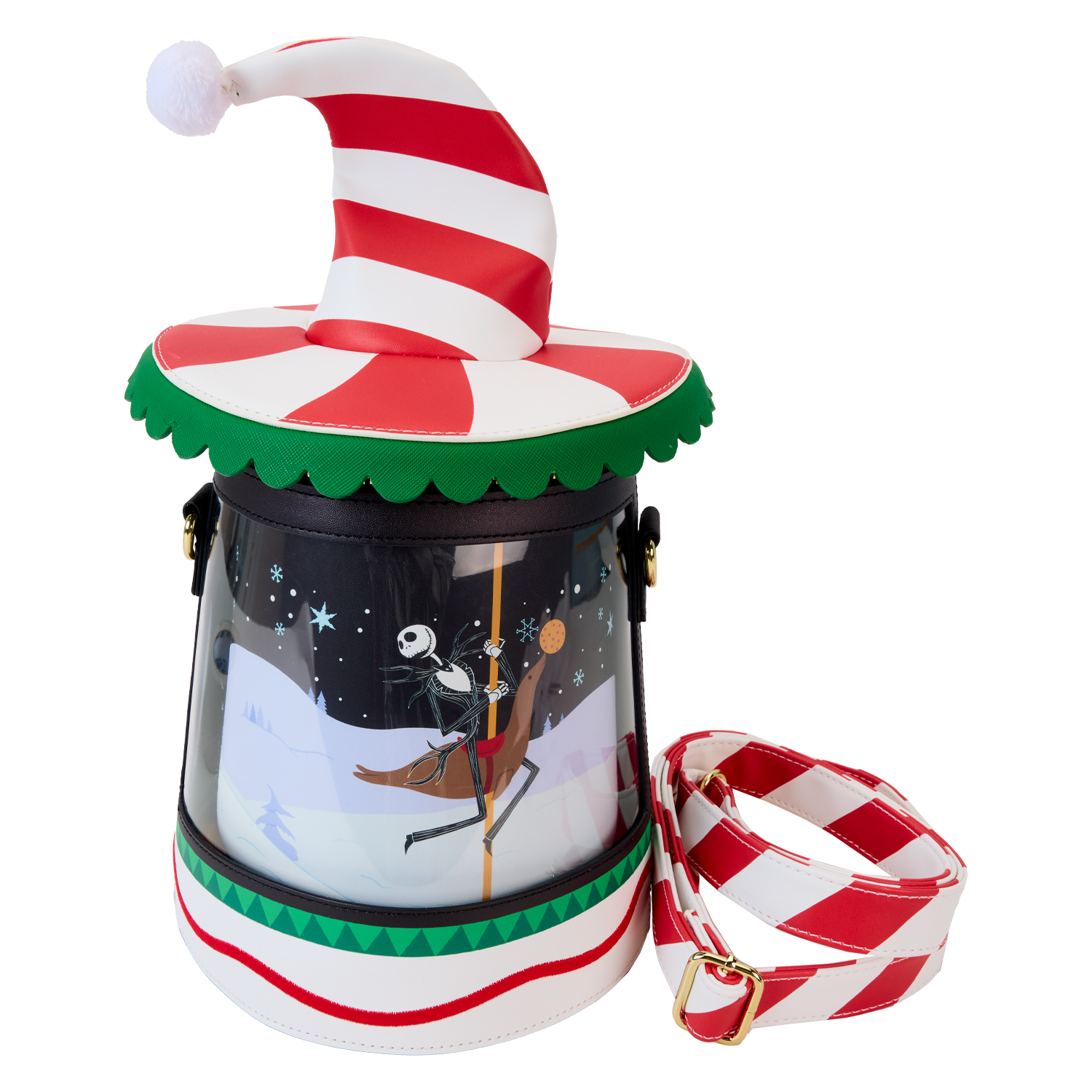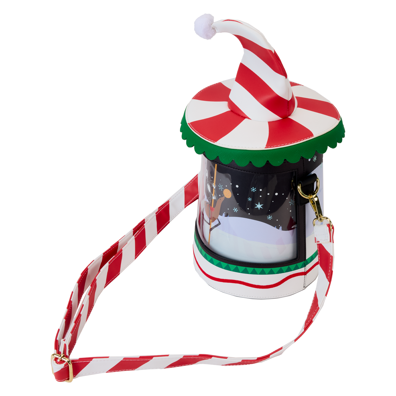 Up and down and ‘round we go! Jack and Sally take Christmas Town for a spin on this whimsical crossbody bag. Twist the bottom of the bag to set the carousel in motion, bringing the scene to life with unique spinning details! This accessory makes a festive addition to any outfit and will inspire holiday spirit wherever you go.