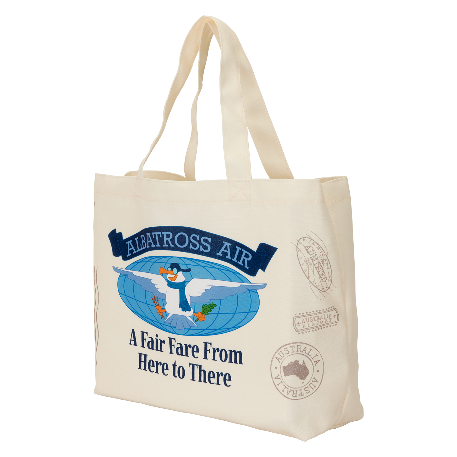 This canvas tote bag pays homage to Disney's Rescuers Down Under and features the Albatross Air logo. You'll find an Albatross symbol in front of a globe. Above is a banner that reads, "Albatross Air" and below it says, "A Fair Fare from Here to There." Along the side you'll see "Express" and other symbols "stamped" on the bag. Turn it around to find another Australia "stamp."