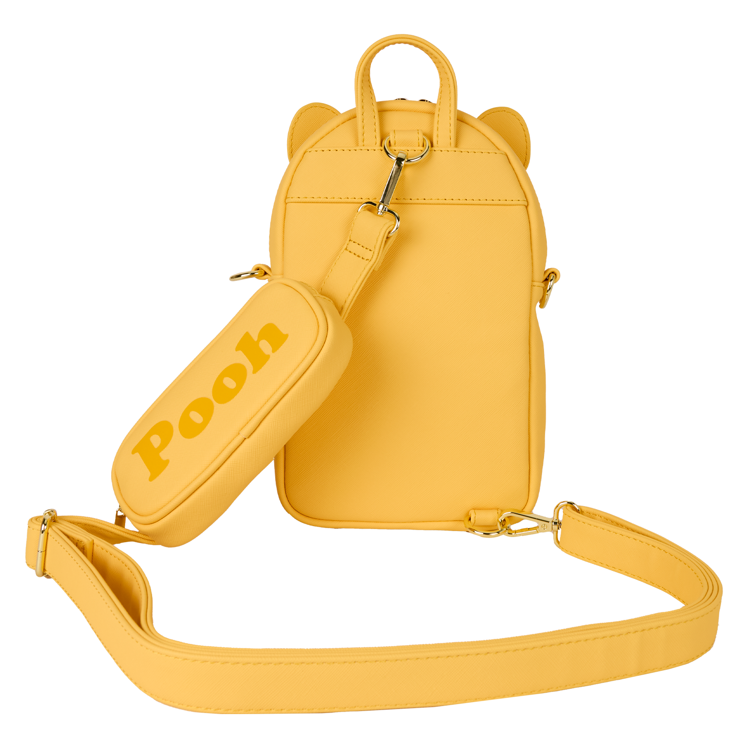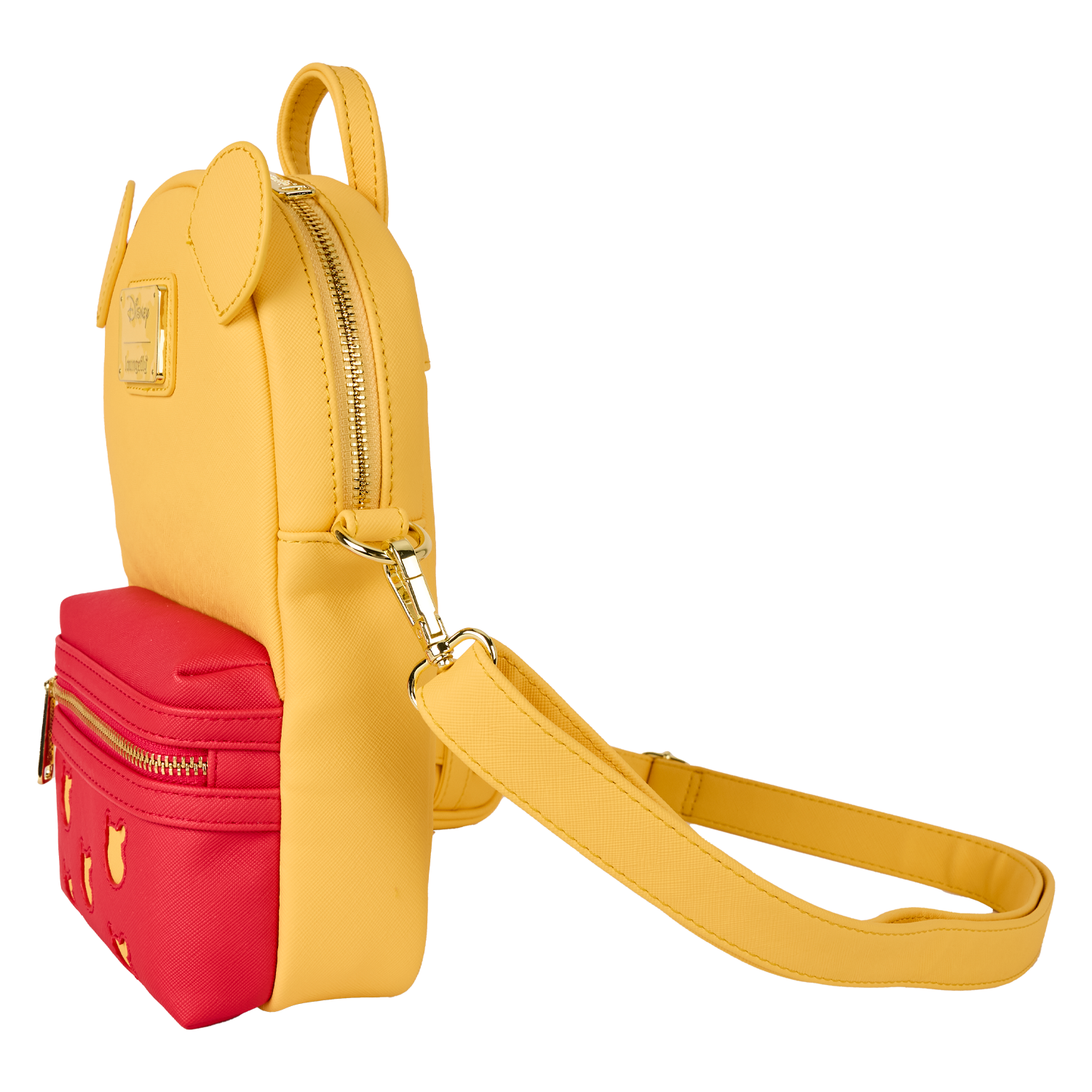 This sling bag is inspired by Winnie the Pooh. It follows a similar style to our mini backpacks, featuring a front pocket and a main zippered compartment. You'll find 3D ears sticking out from the top. The front pocket is red and features an all-over pattern of Pooh’s silhouette! Attached to the crossbody strap is a coin bag that says "Pooh" on it!