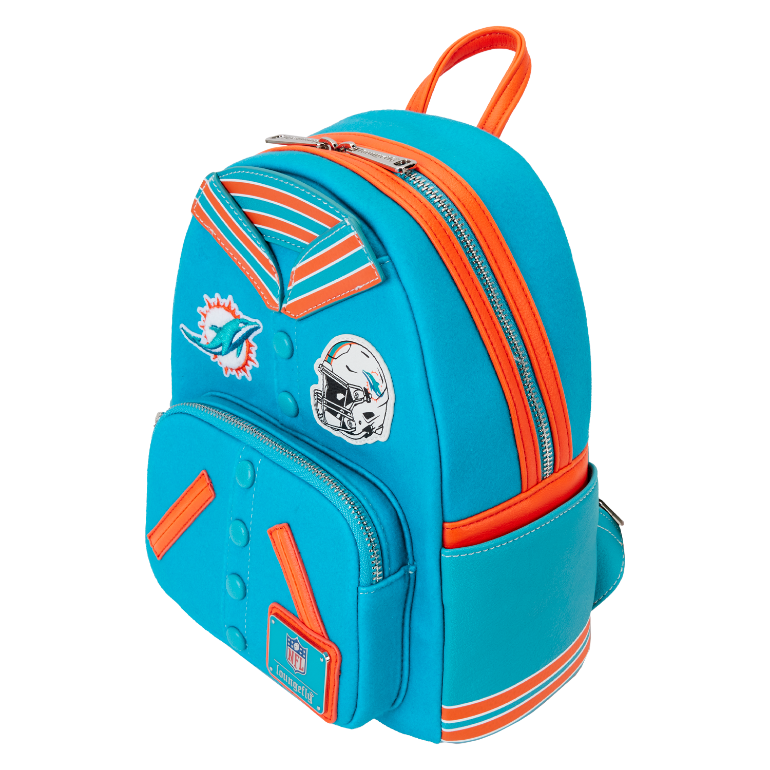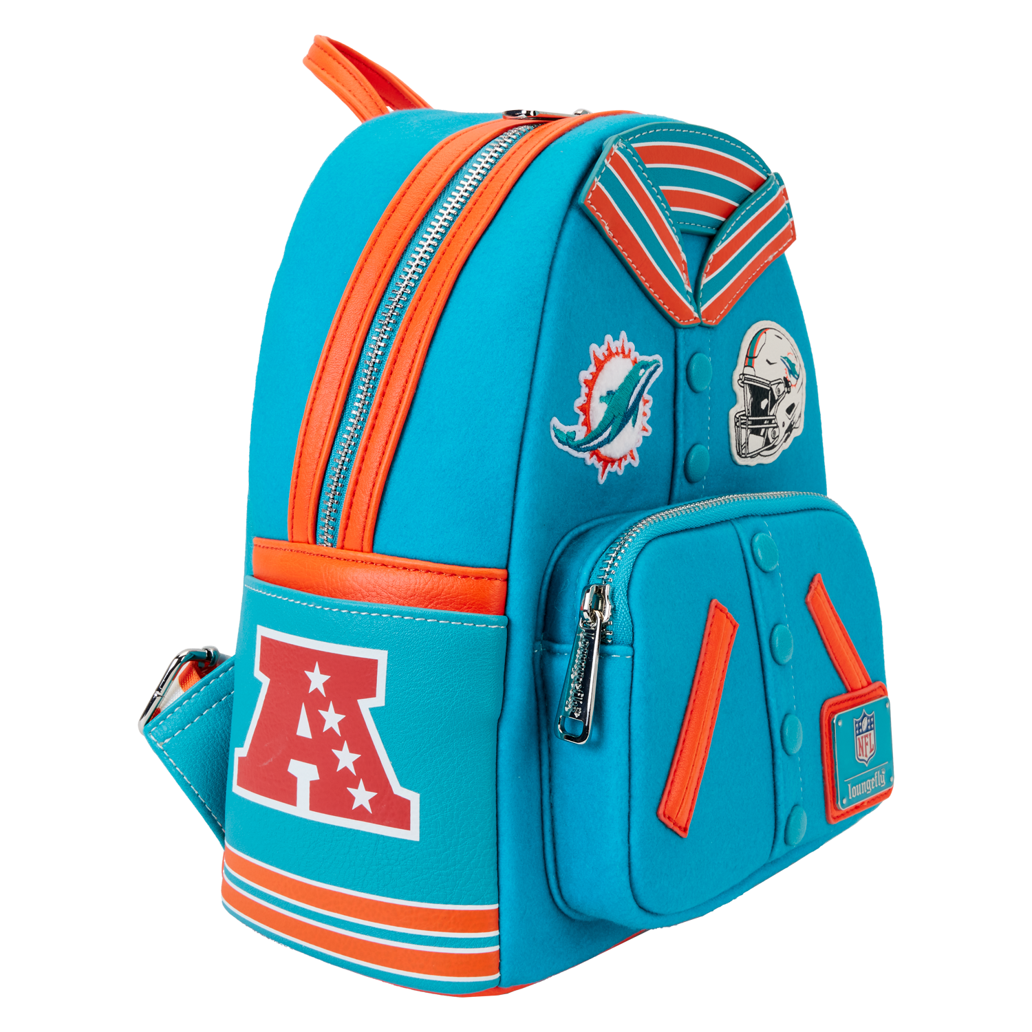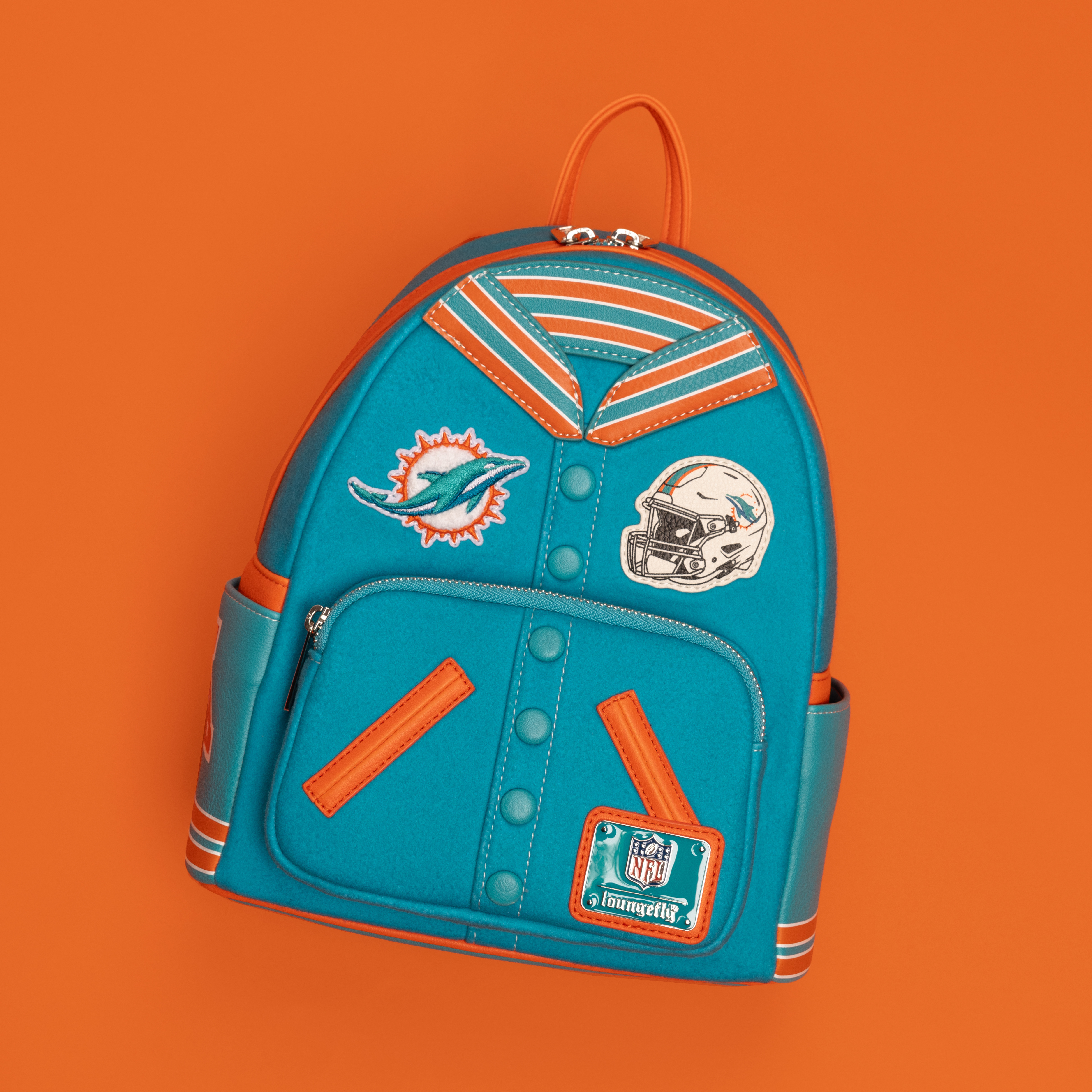 Show your colors proud and true—you've got spirit, yes you do! Cheer your team in style! Our sturdy Miami Dolphins Varsity Mini Backpack will stand out in the crowd. This backpack, fashioned as a varsity jacket, scores big points in details. A chenille patch logo and helmet patch add a winning look, along with aqua, orange, and white jersey material appliques in Miami Dolphins colors. Real metal snaps also line the front for a “buttoned-up” look. Pack just what you need for the day to show off your team pride.