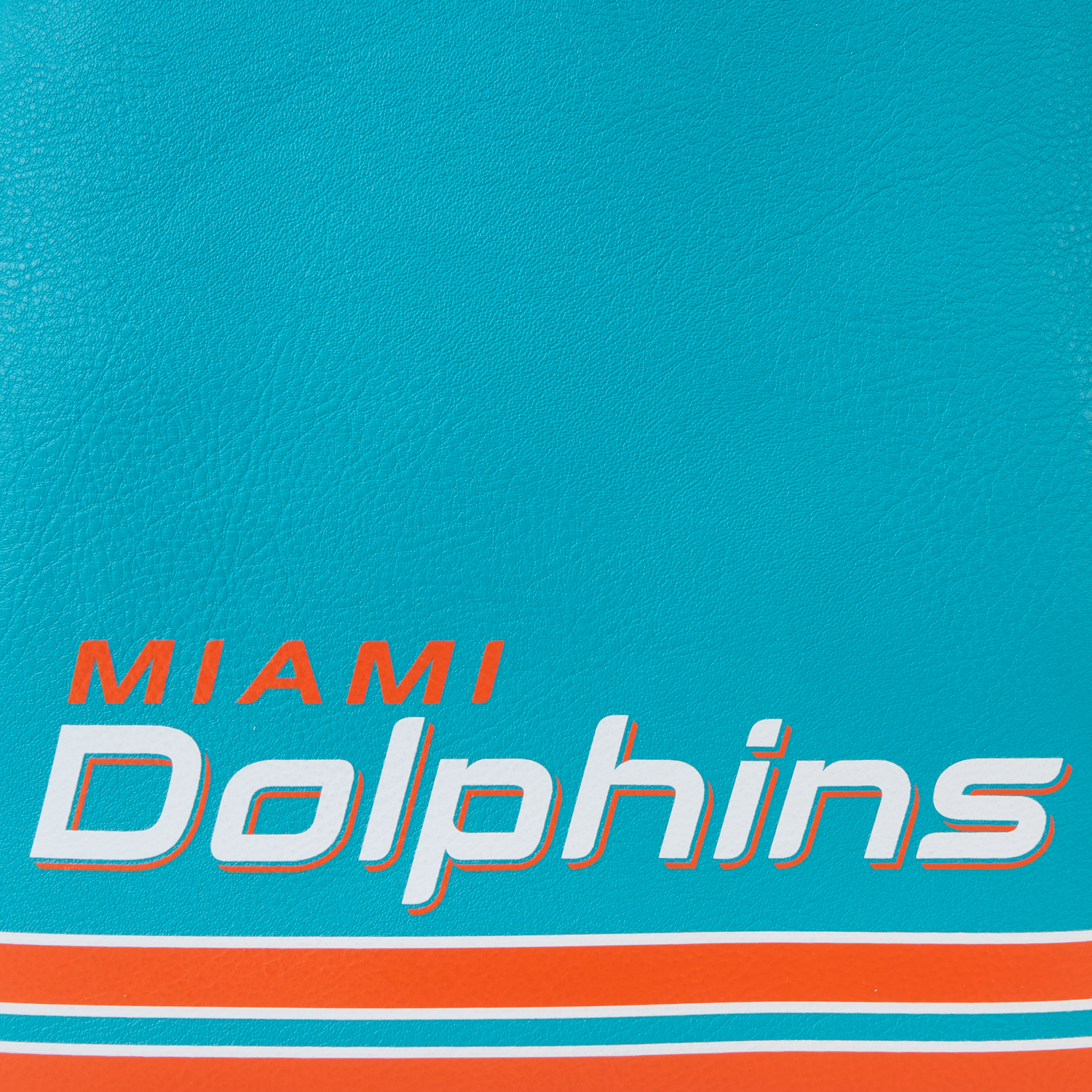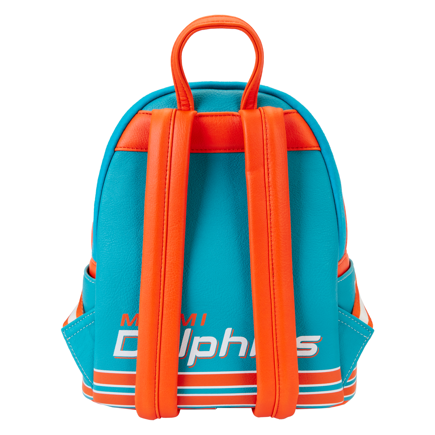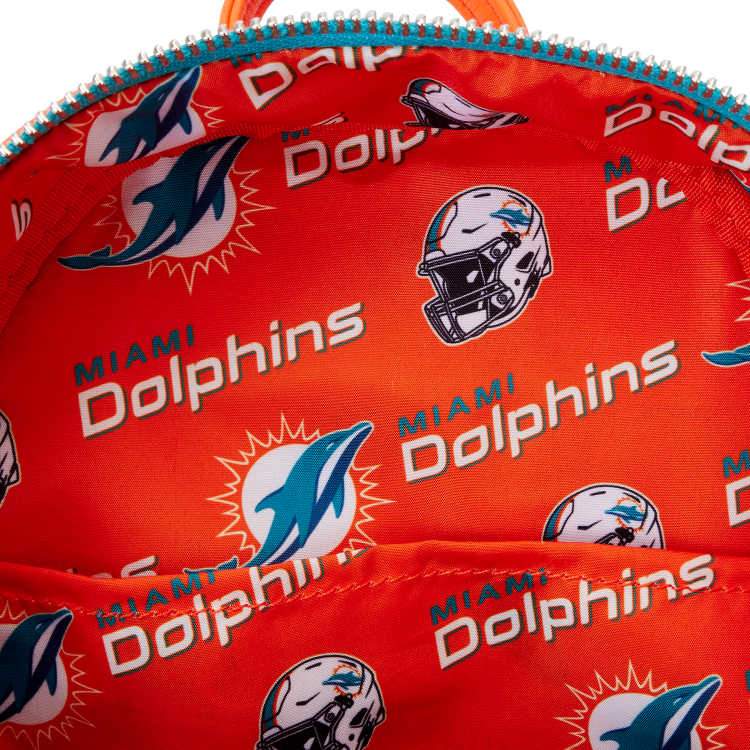 Show your colors proud and true—you've got spirit, yes you do! Cheer your team in style! Our sturdy Miami Dolphins Varsity Mini Backpack will stand out in the crowd. This backpack, fashioned as a varsity jacket, scores big points in details. A chenille patch logo and helmet patch add a winning look, along with aqua, orange, and white jersey material appliques in Miami Dolphins colors. Real metal snaps also line the front for a “buttoned-up” look. Pack just what you need for the day to show off your team pride.