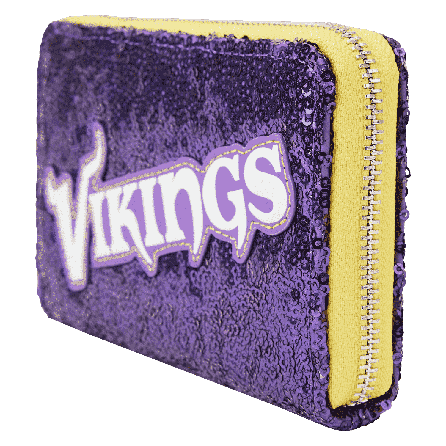 The Loungefly NFL Minnesota Vikings Sequin Zip Around Wallet is made of vegan leather (polyurethane). Wallet zips closed and has sturdy metal hardware. Additional features include applique and printed details. Take note of the coordinating inside lining.