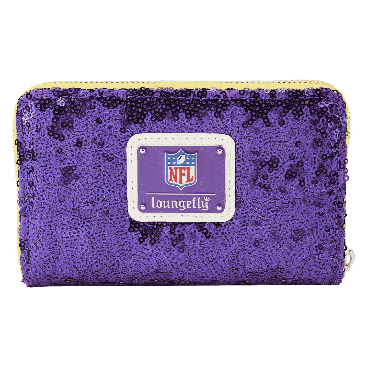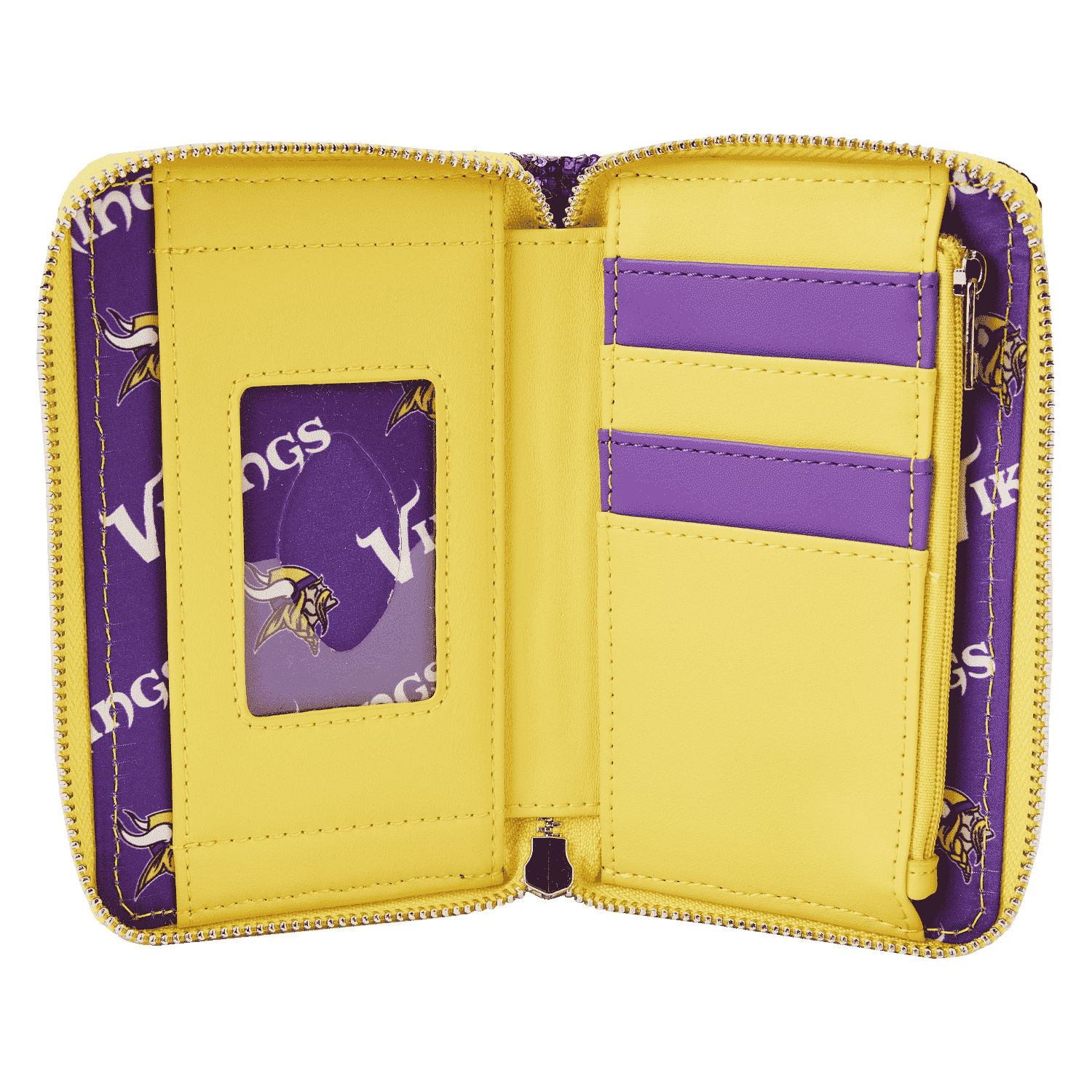 Show your team spirit with a game-winning play for your Loungefly collection! The NFL Minnesota Vikings Sequin Zip Around Wallet is a touchdown for any Vikings fan. This wallet features purple sequins with gold trim to match the team’s colors. The team’s name appears on the front. With 4 slots for holding cards and a clear slot to hold your ID, this accessory provides a stylish way to carry your important items as you cheer from the sidelines.