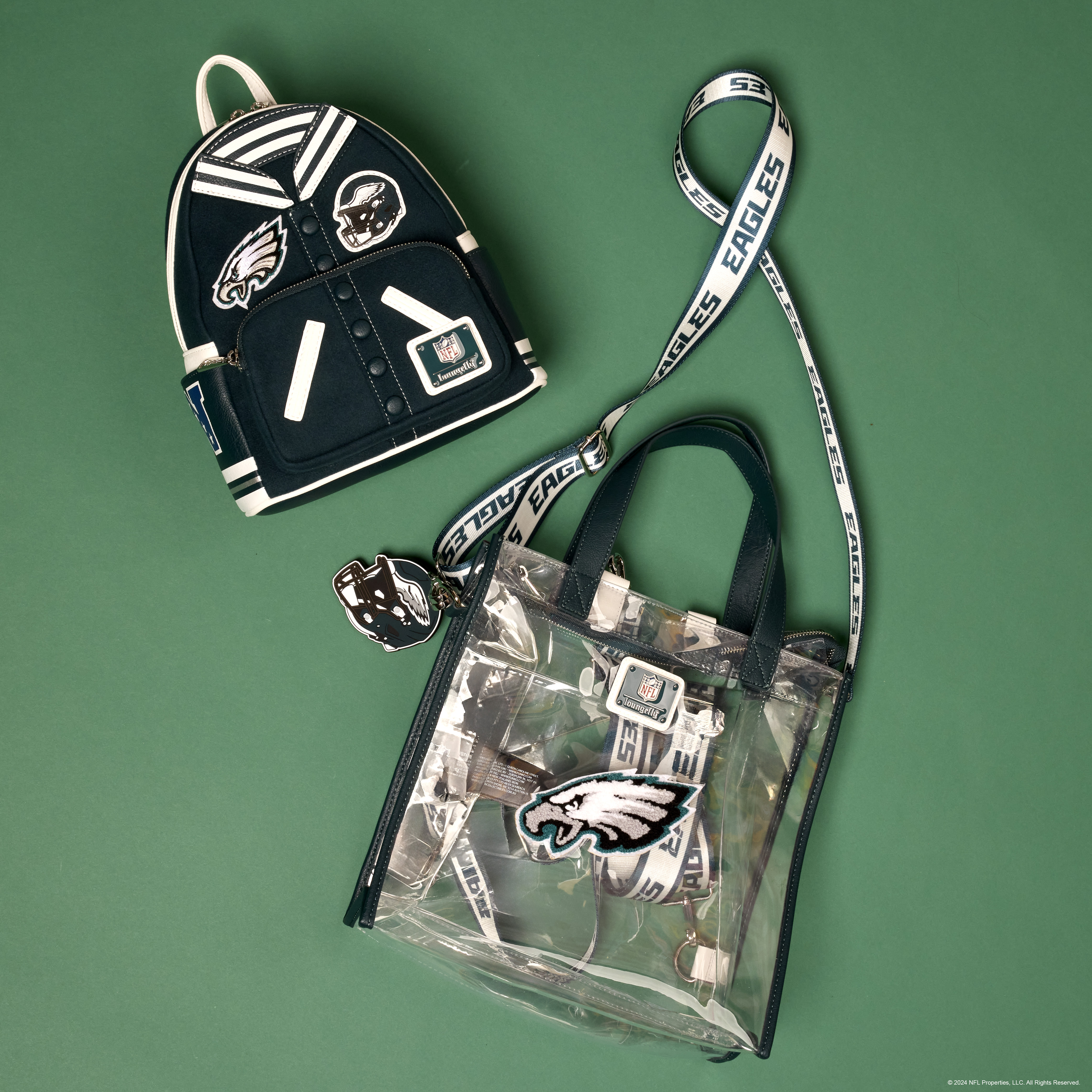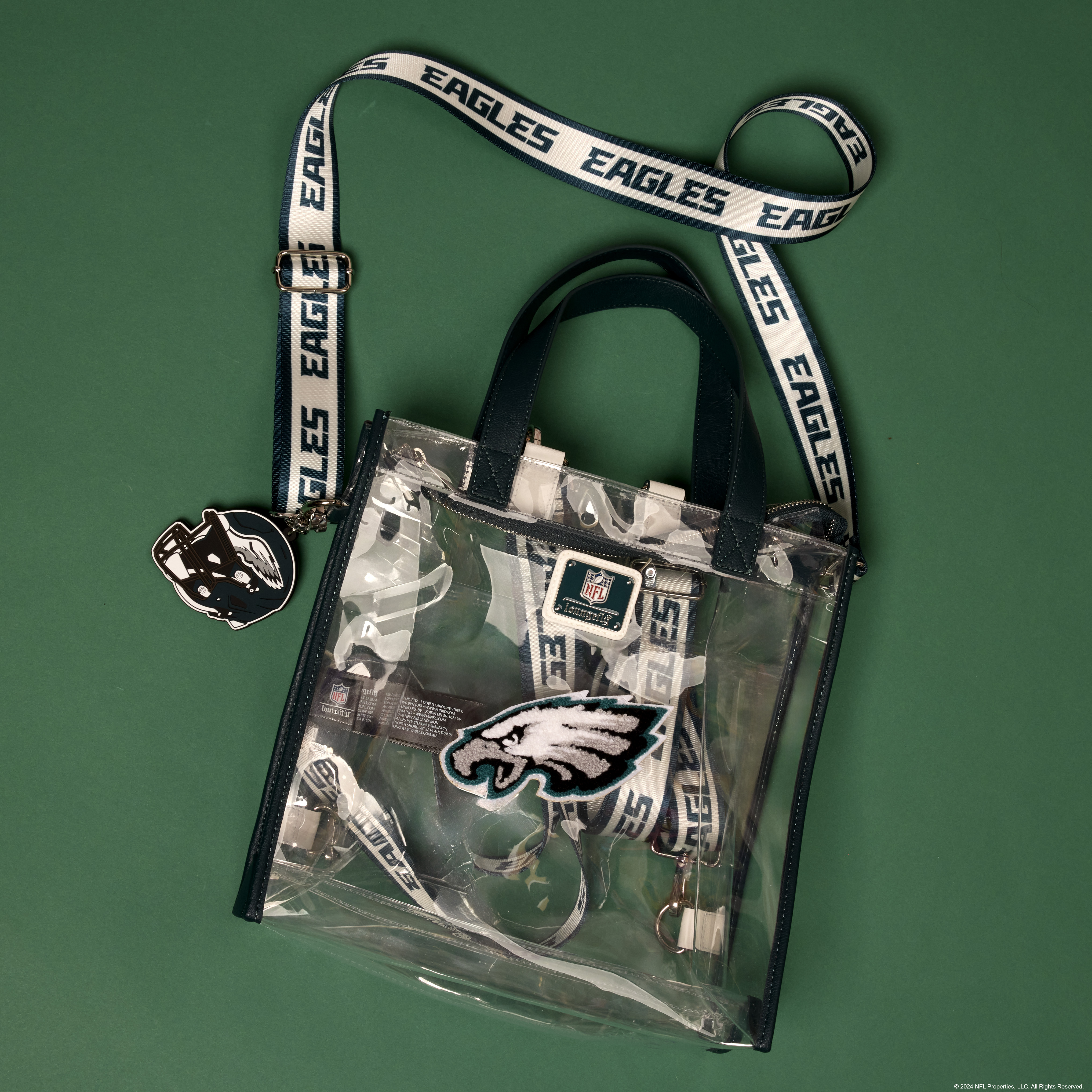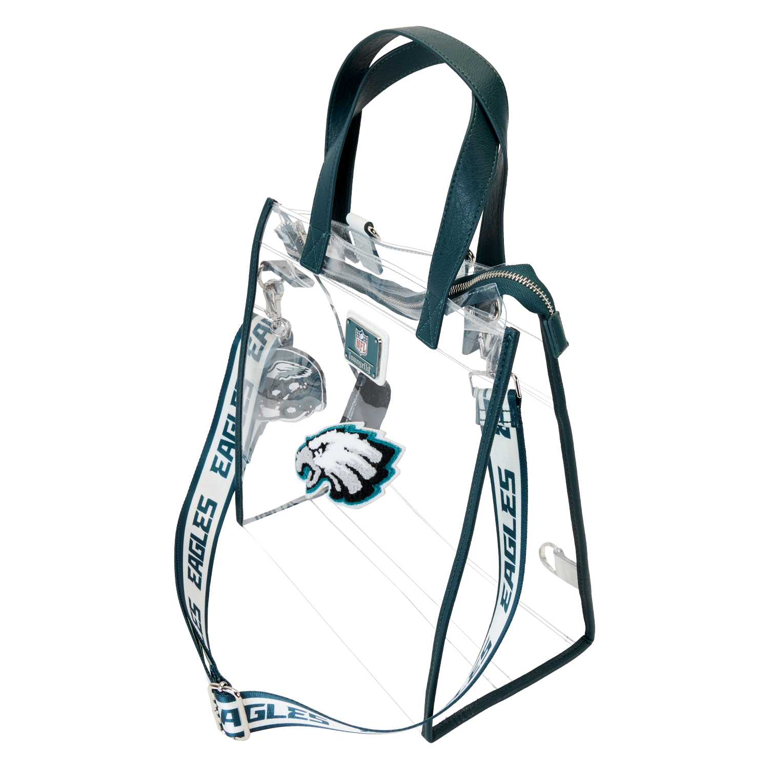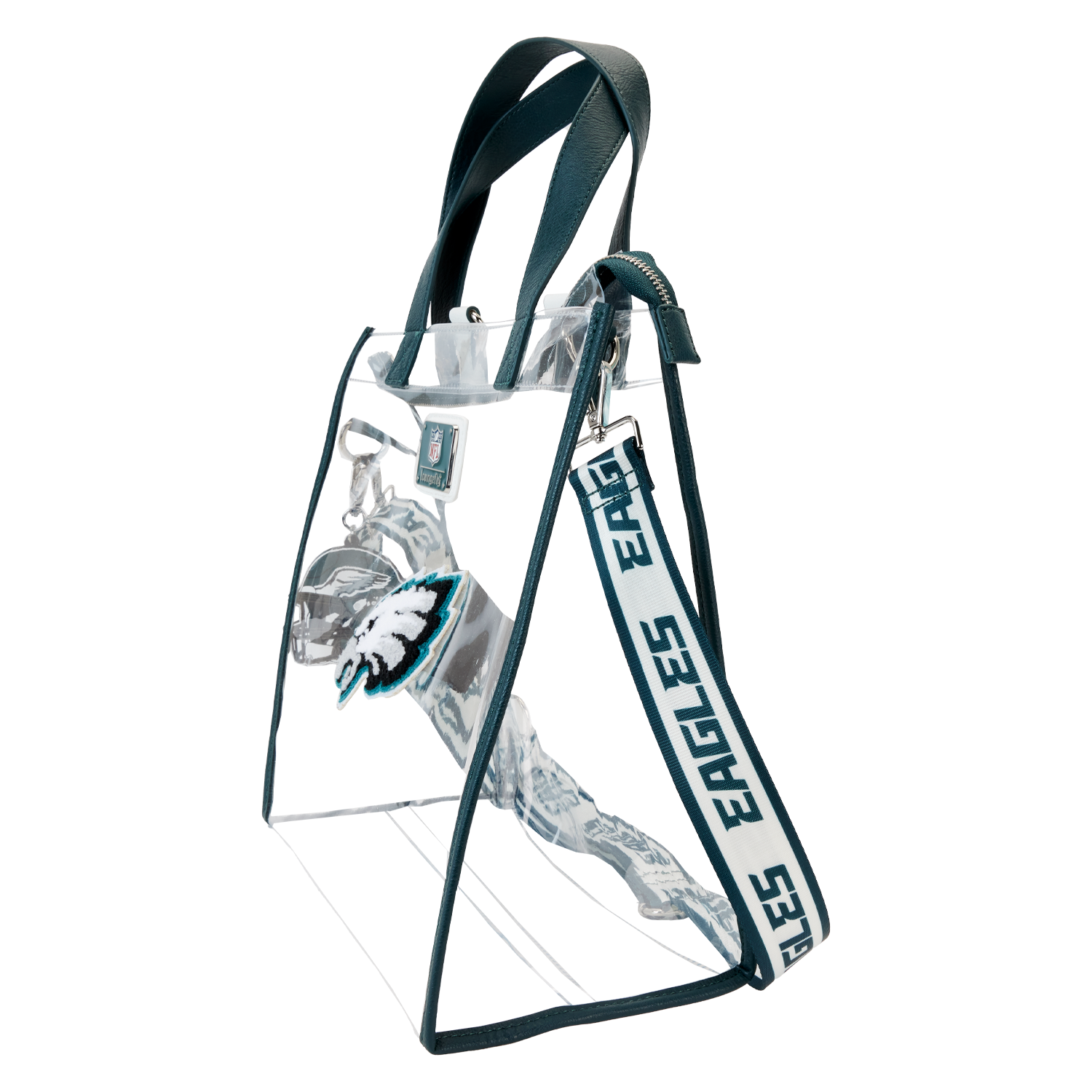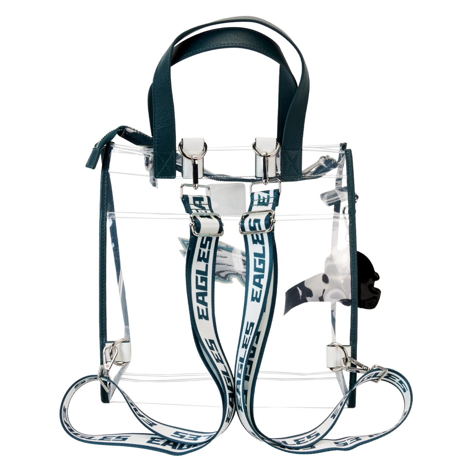 Feeling game-day ready? Cheer on your favorite football team with this convertible tote bag! The clear design makes it easy to bring your belongings into the stadium, and versatile shoulder straps help to keep your bag close as you wander the crowds. A chenille patch of the Eagles logo, a helmet-shaped bag charm, and coordinating team colors give this bag an elevated look. No need to sacrifice your style at the big game – this accessory is the perfect combination of fashion and function.