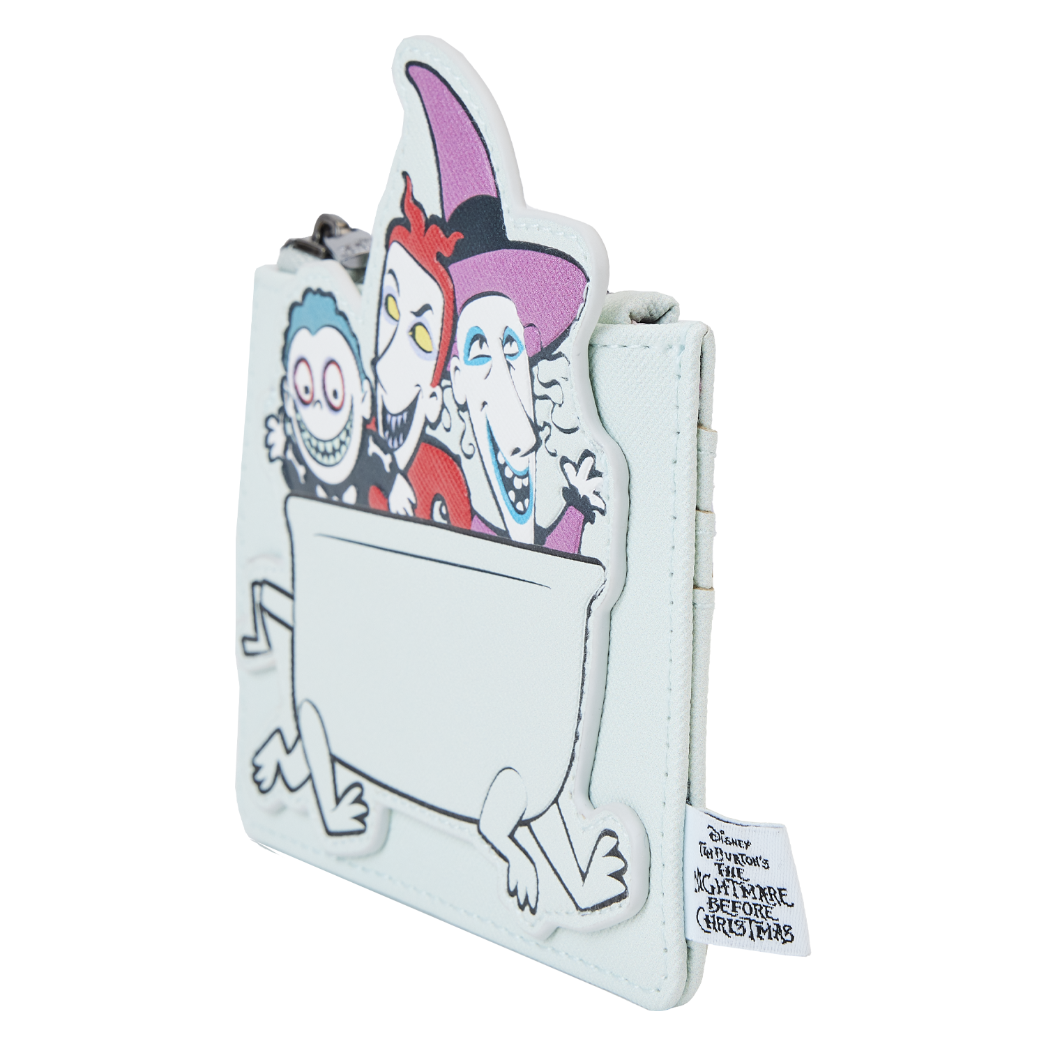 The Loungefly Nightmare Before Christmas Lock Shock Barrel Bathtub Card Holder is made of vegan leather (polyurethane). Card holder has zippered coin pouch with sturdy metal hardware. Additional features include applique, debossed, and printed details.