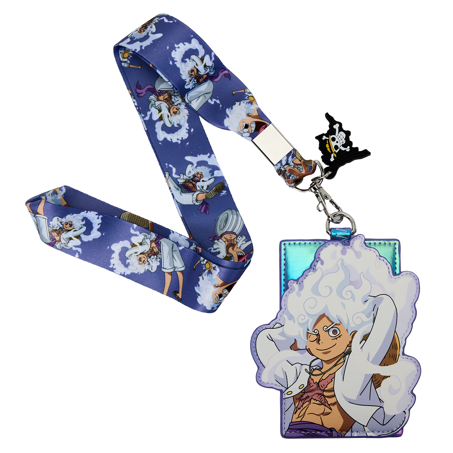 The strap features various images of Luffy in GEAR5. Attached is a rubber charm of the Jolly Roger flag. A card/badge holder features Luffy in GEAR5 in applique detail on the front with iridescent material. This limited edition lanyard is a must-have for any ONE PIECE fan!