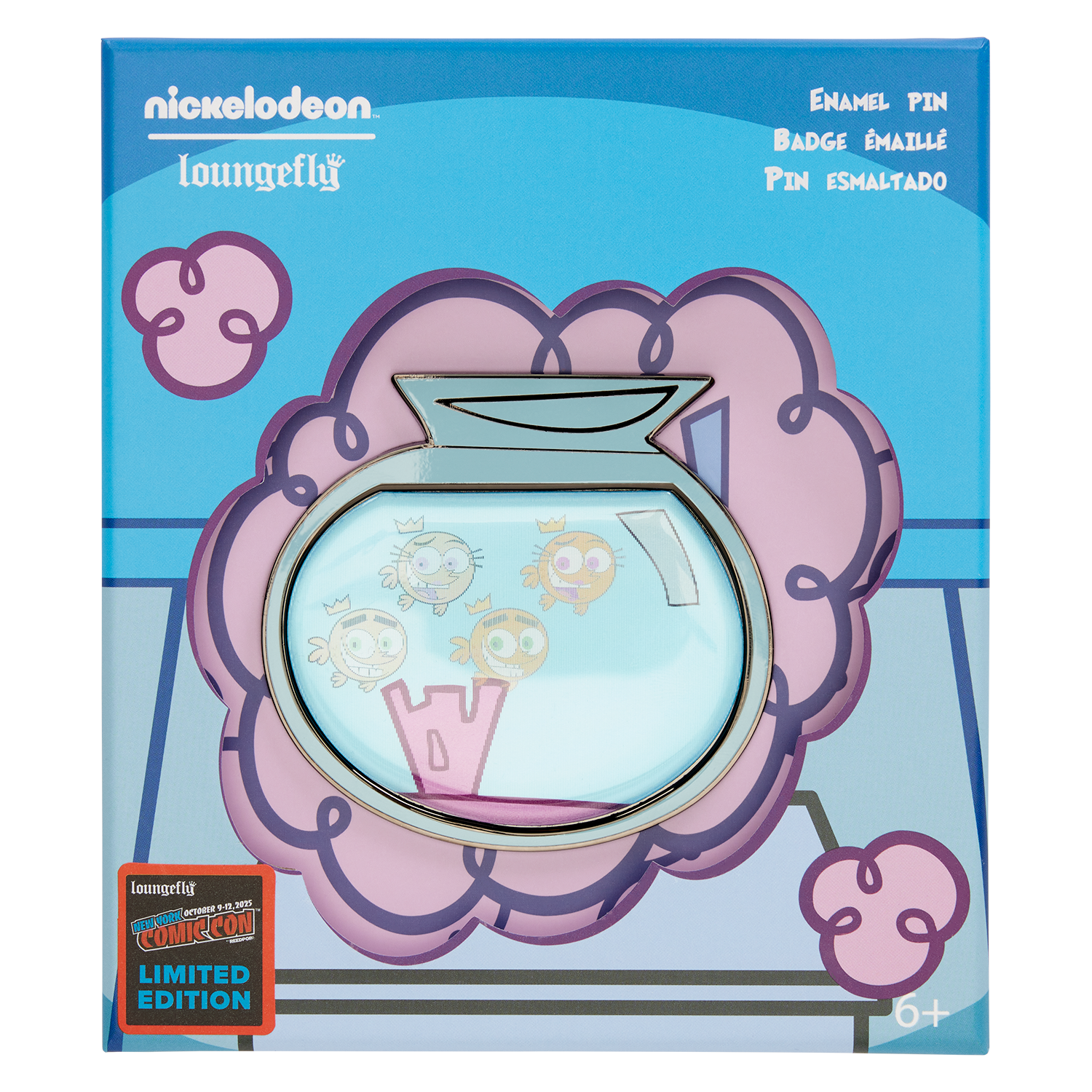 This 3" collector box pin features Cosmo and Wanda as goldfish in a bowl. The pin features an epoxy dome and a lenticular feature that shows Cosmo and Wanda "swimming" in the bowl! This pin is limited edition 700, making it an extra special piece to collect and display!