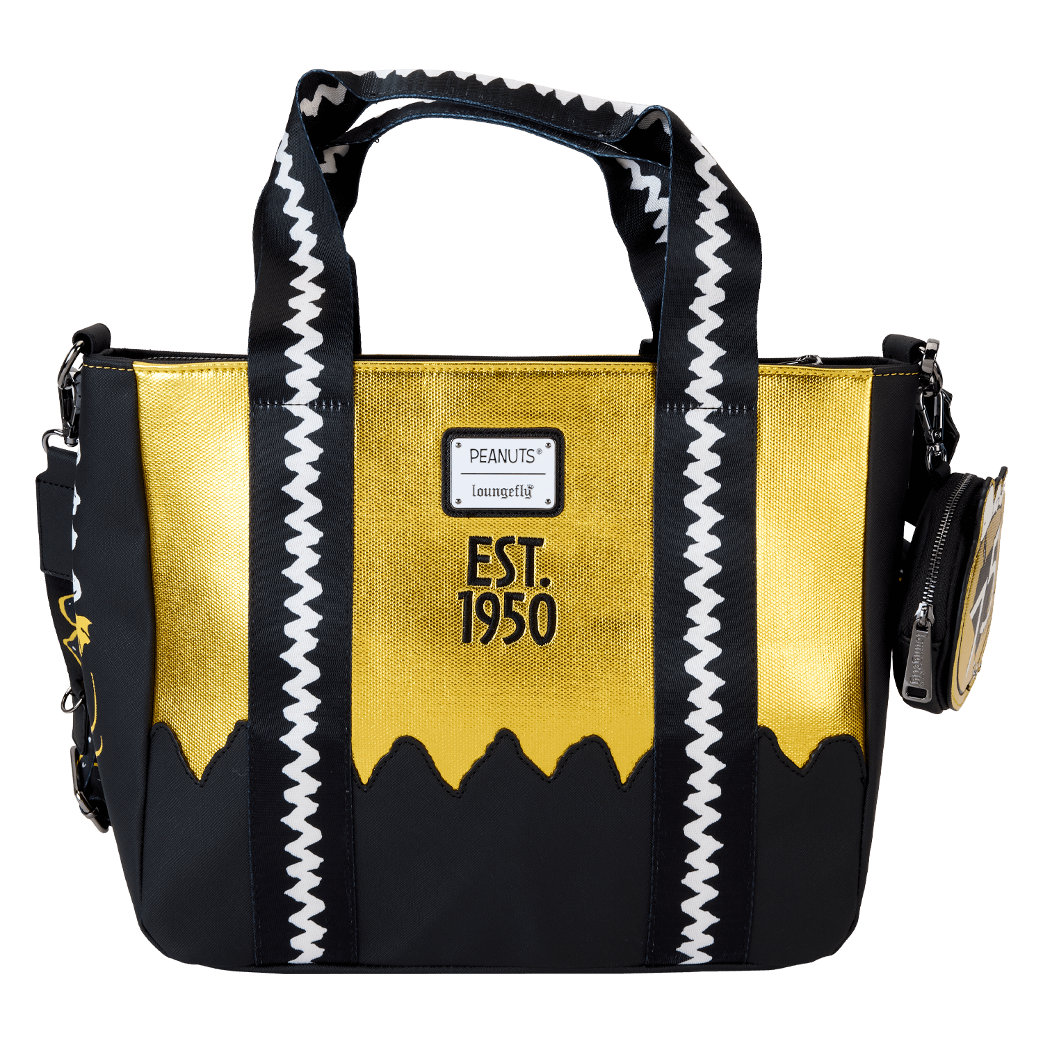 Happiness is…a big celebratory feeling you can take with you wherever you go. Celebrate the 75th anniversary of Peanuts™ with our tote bag featuring the whole gang. Charlie Brown’s signature wavy stripe makes several fun appearances on this bag, starting with the die-cut waves on the bottom front. Above, the whole gang appears as embroidery, in silhouette form, against a textured, shiny yellow background. Snoopy is above, doing a happy dance. A coin purse marking the 75th anniversary gives Snoopy an opportunity to make an encore appearance, snoozing on top. Flip the bag around, and you’ll find the words “Est. 1950,” to recognize 75 years of Peanuts characters. Pack your daily essentials in this roomy tote to commemorate a milestone anniversary and add a little character of your own.