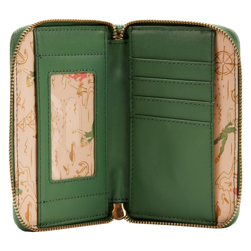 Celebrate the childlike wonder of Disney’s Peter Pan with a charming interpretation of the animated classic! The Loungefly Peter Pan Book Zip Around Wallet portrays the story of the boy who never grew up. Resembling a book cover, the front of this wallet features Peter Pan and the Darling siblings as they fly through the night sky. Gold foil details portray the title and book cover framing. On the back, Peter sits above a compass while playing his flute for Tinkerbell. The phrase “never grow up…” is displayed in a bookish script. With four slots for holding cards and a clear slot to hold your ID, this wallet will keep your important items safe as you take flight on any adventure.