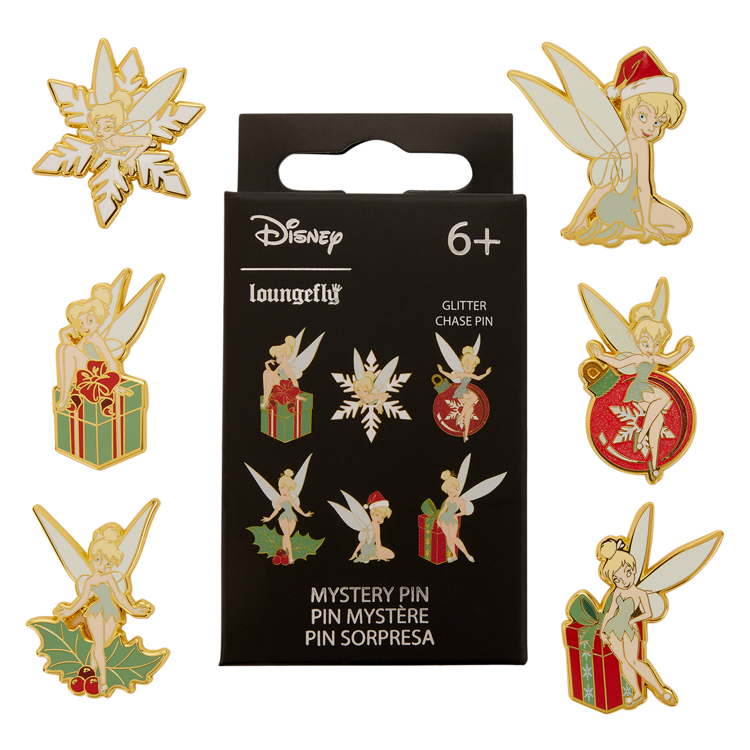 These mystery pins feature Tinker Bell interacting with various holiday items. There are six in total to collect: Tinker Bell sitting on a present, Tinker Bell with a snowflake, Tinker Bell with holly, Tinker Bell wearing a Santa hat, Tinker Bell leaning against a present, and the glitter chase is Tinker Bell flying beside an ornament! Each is a mystery so you don't know which you'll get!