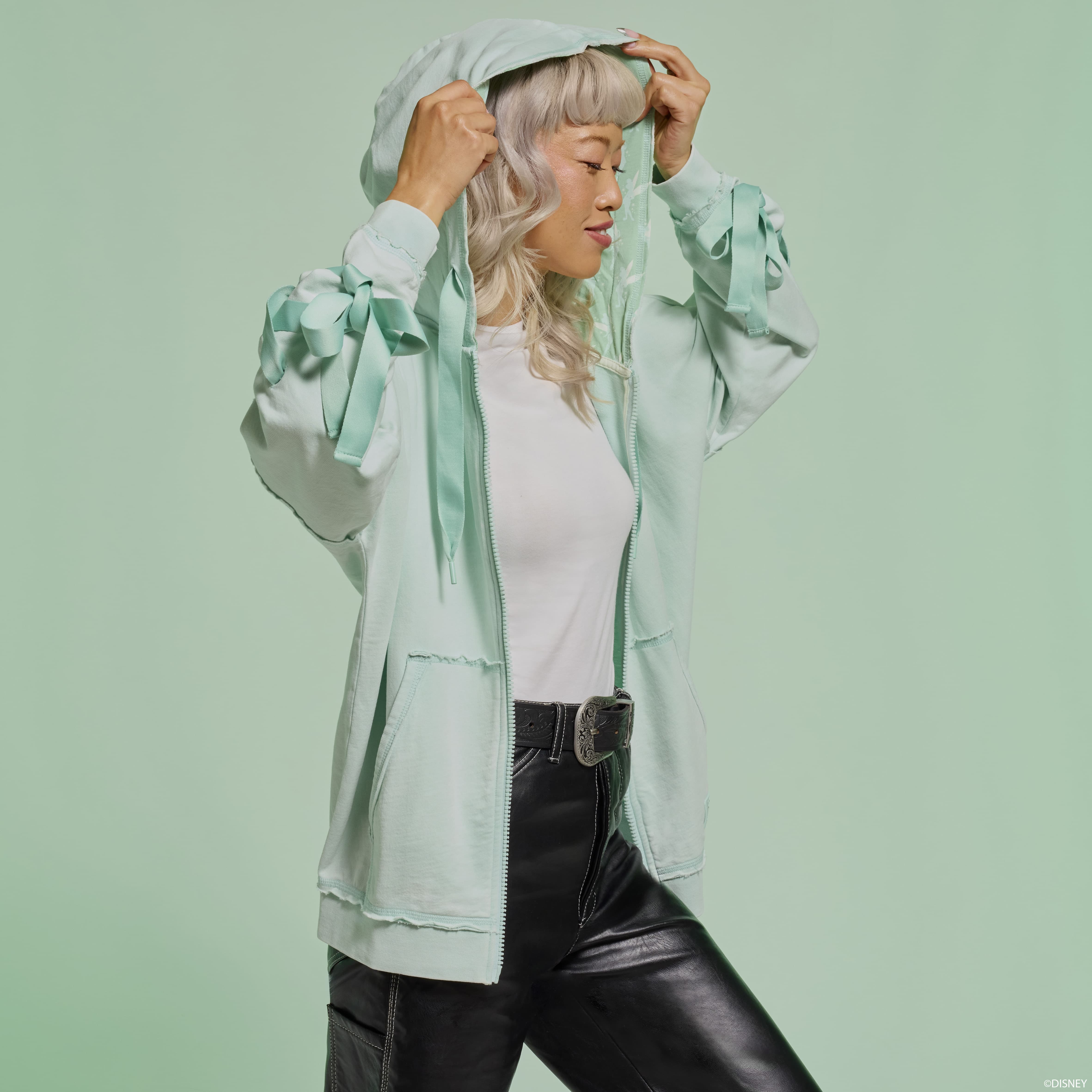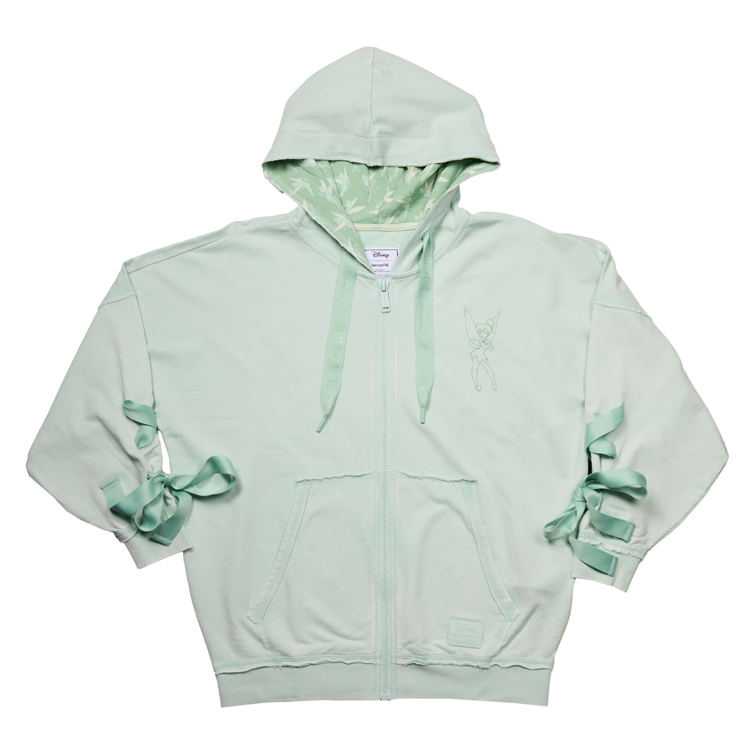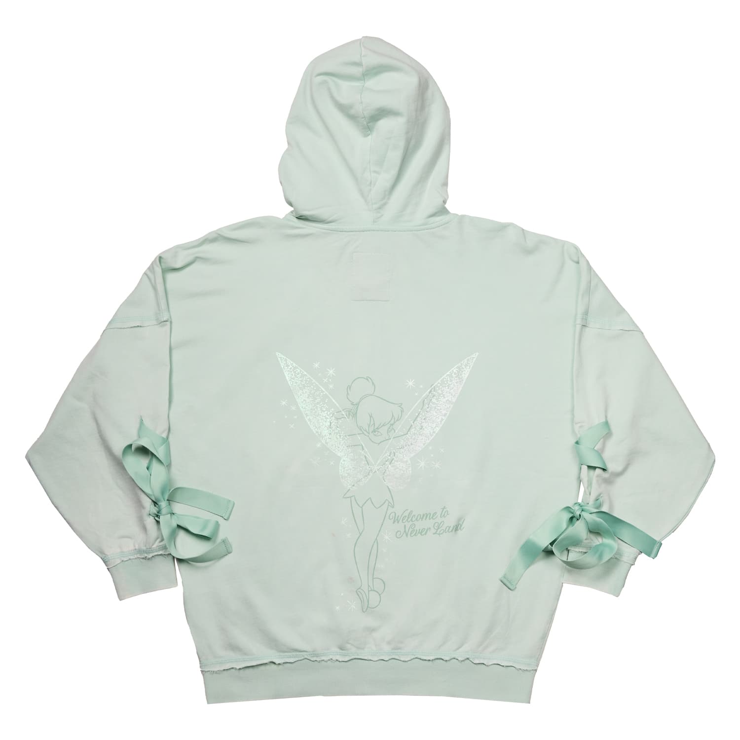 Luck takes a fashionable turn at the second star to the right. Disney’s Tinker Bell welcomes you to Never Land on this zip-up hooded jersey. She appears as a print in the top corner and embroidered on the back. Tinker Bell looks over her shoulder, and her wings take on an iridescent shine. The sleeves on this soft green hoodie feature real sewn-in ribbon that weaves its way down and finishes off with a bow. Take flight for magical adventures in style.