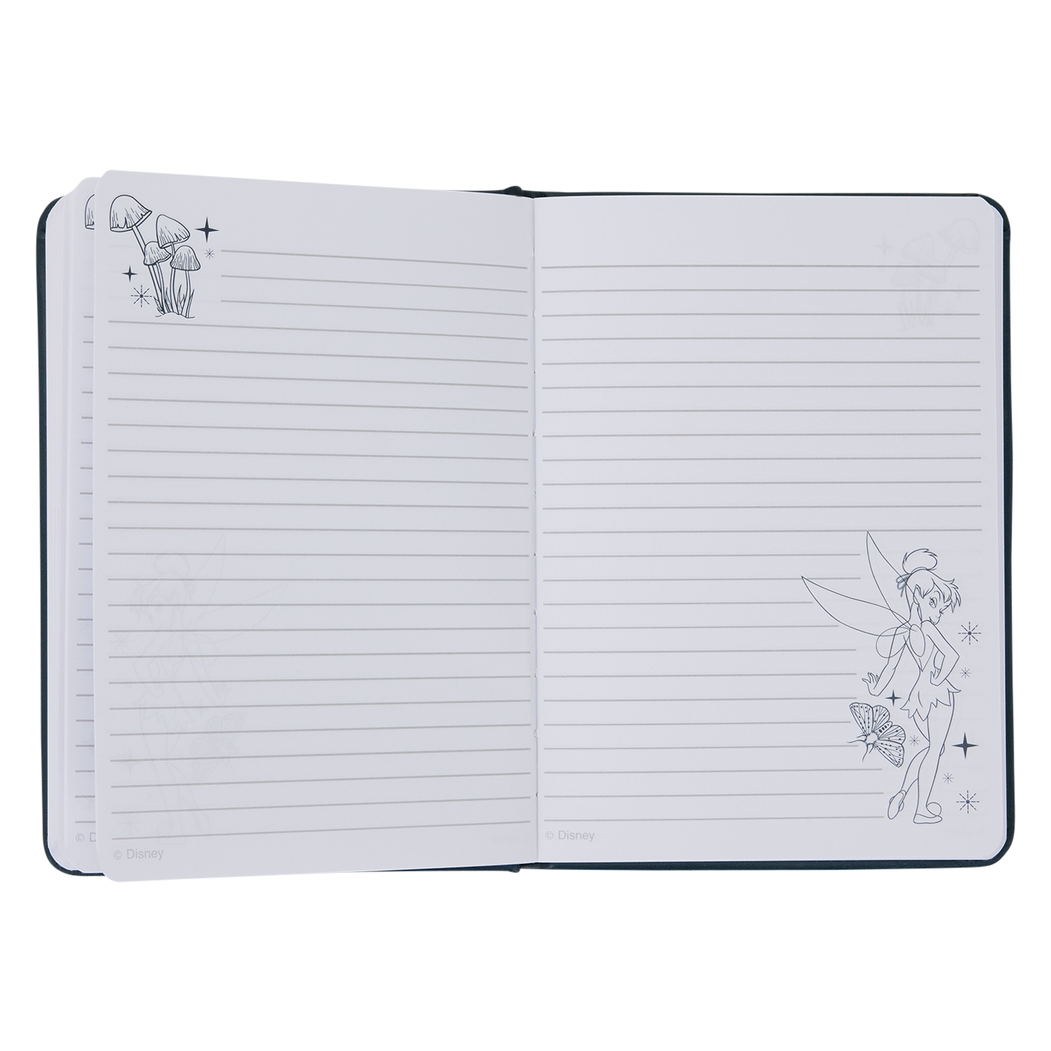 This journal features Disney’s Tinker Bell on the front sitting on a mushroom. Butterflies fly around her. On the back, you'll find another image of Tinker Bell surrounded by more butterflies. This journal features lined pages with images of Tinker Bell and mushrooms in the corners.