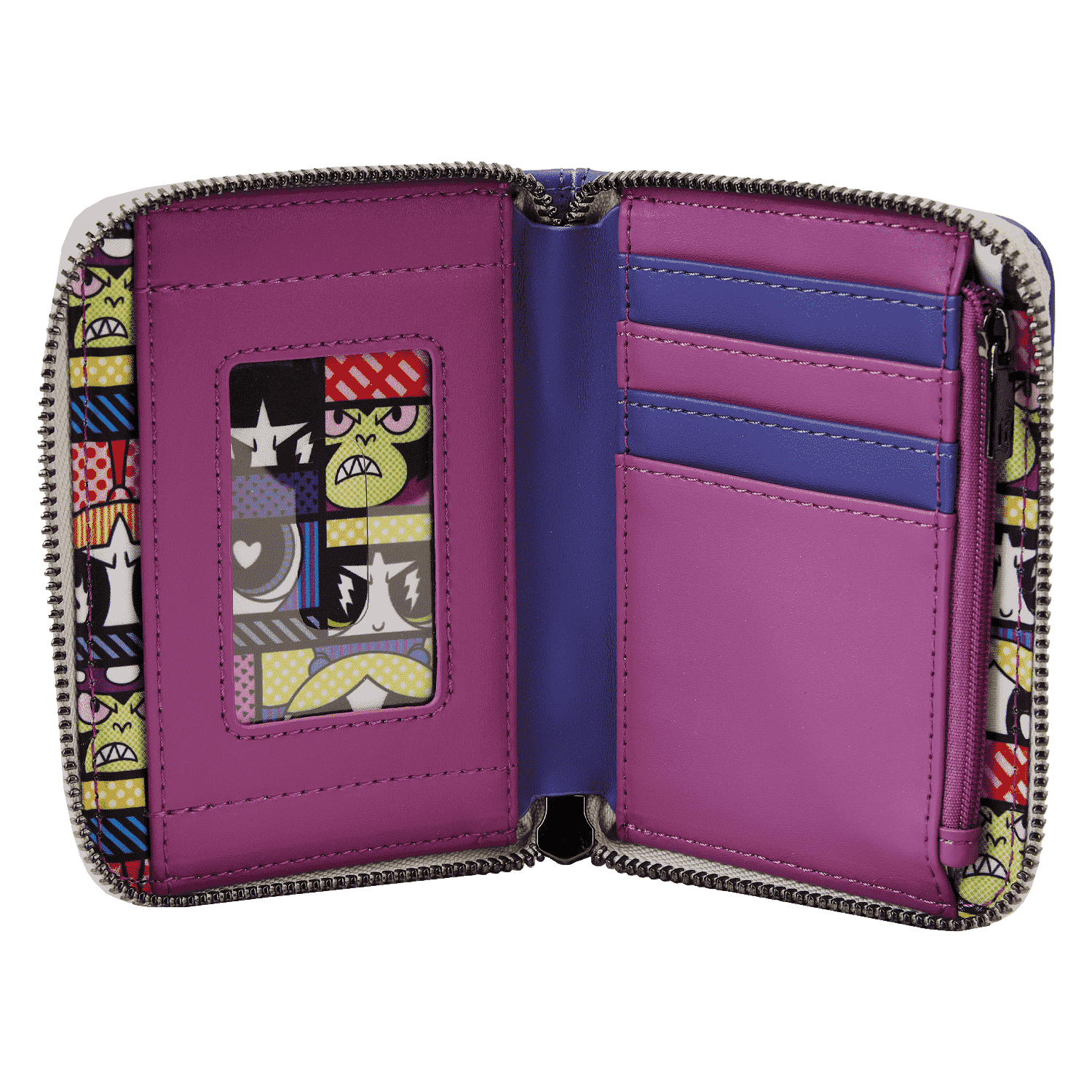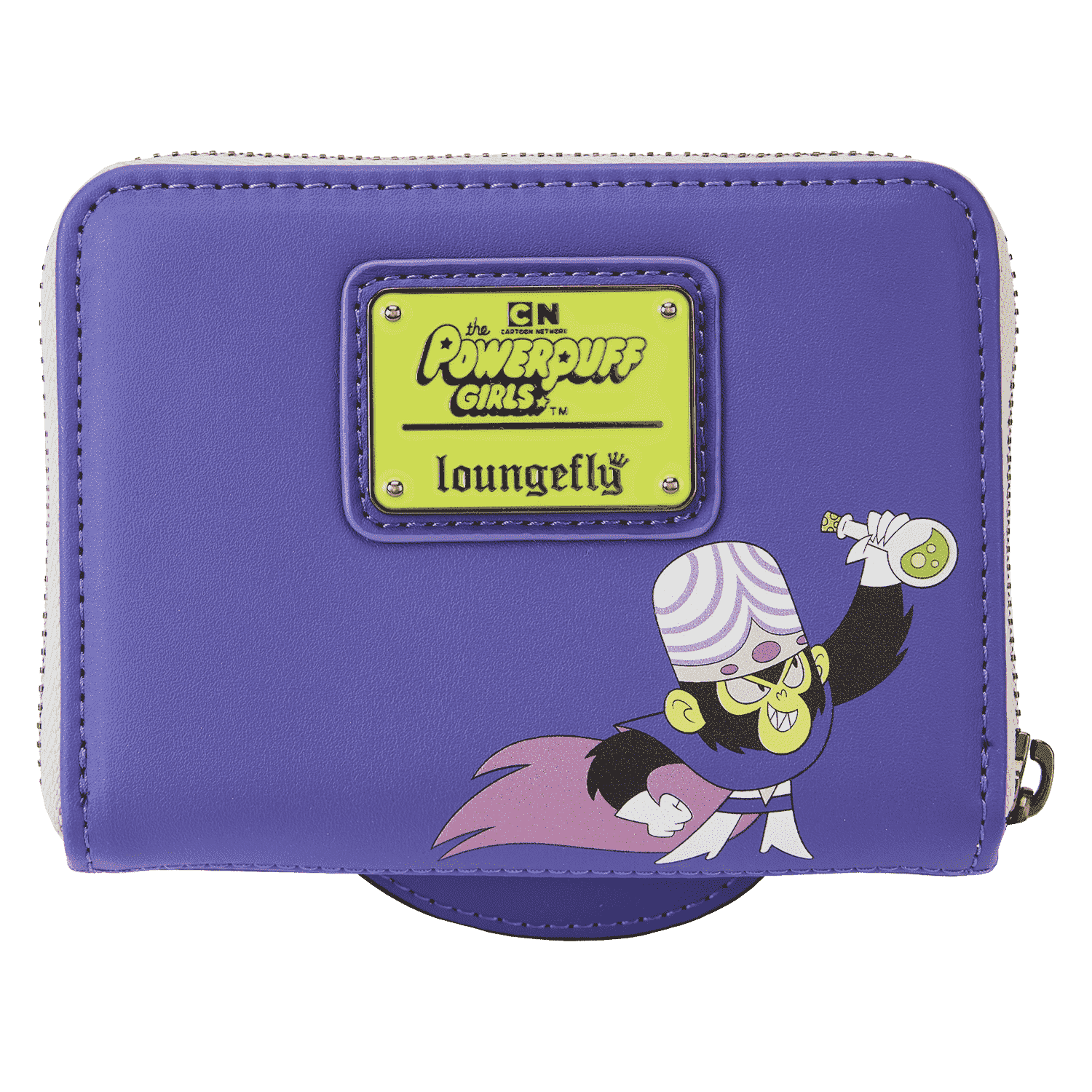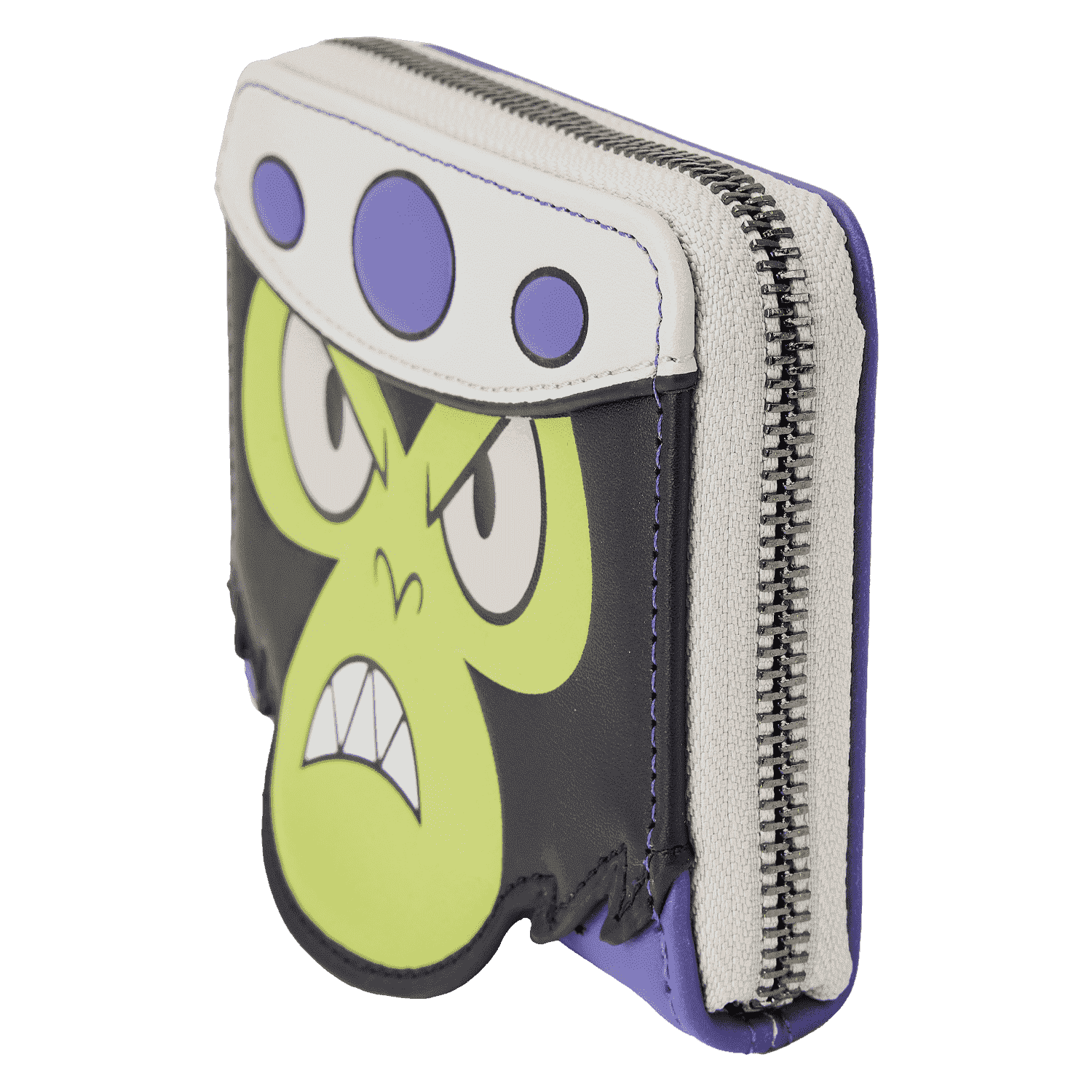 The Loungefly Powerpuff Girls Mojo Jojo Cosplay Zip Around Wallet is made of vegan leather (polyurethane). Wallet zips closed with shiny silver hardware. Additional features include applique, embroidered, glow-in-the-dark, and printed details. Take note of the coordinating inside lining.