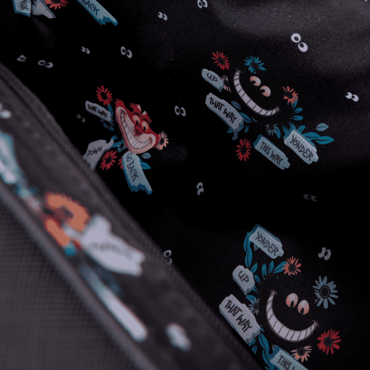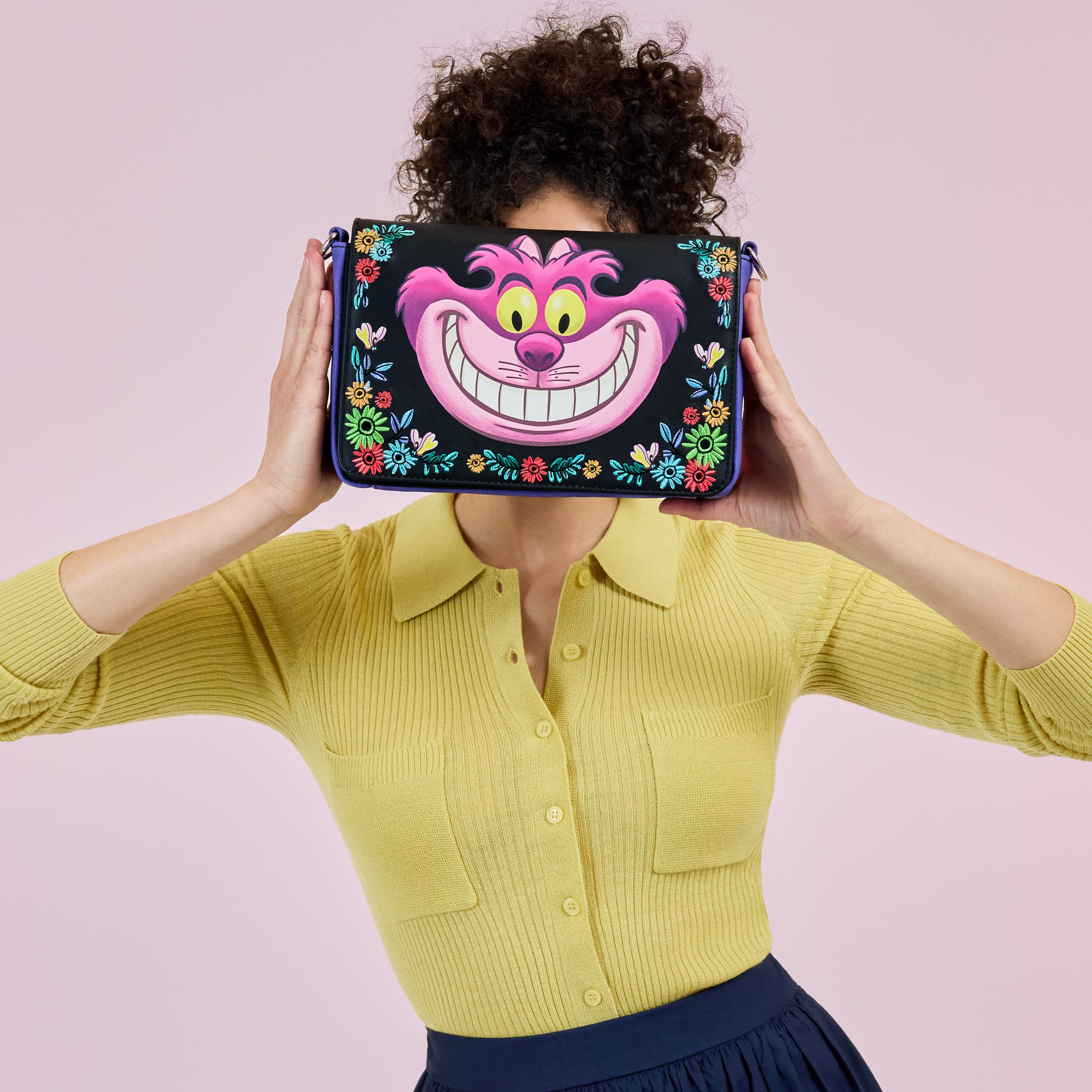 This crossbody bag features the Cheshire Cat front and center on the front of the bag. colourful embroidered flowers surround him. More floral details are on the back, surrounding the Cheshire Cat's eyes and classic smile as he disappears.