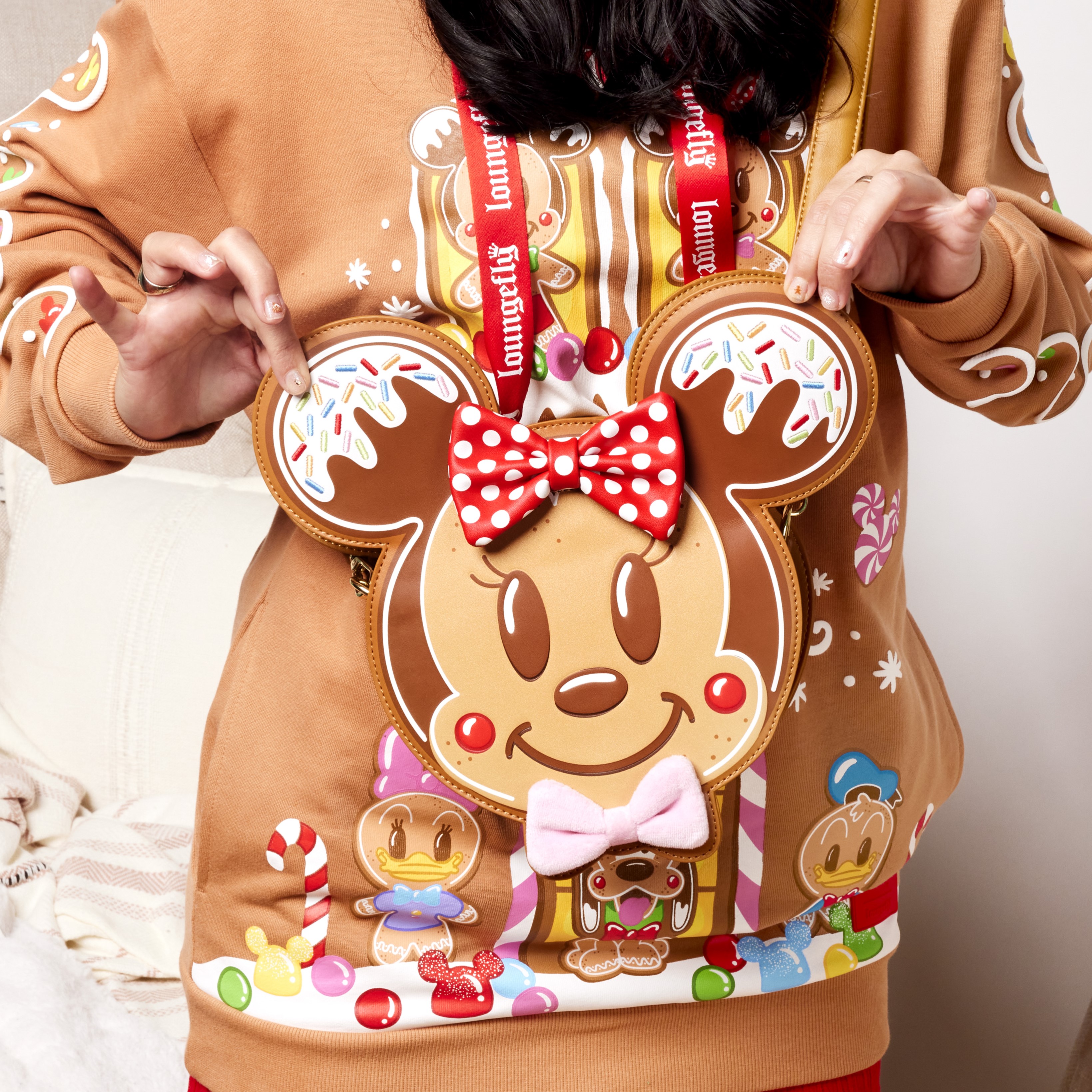 The Loungefly Mickey and Minnie Gingerbread Cookie Figural Crossbody Bag is made of vegan leather (polyurethane). Bag has adjustable (detachable) shoulder strap and sturdy metal hardware. Additional features include applique, embroidered, velvet, and printed details. Take note of the coordinating inside lining.