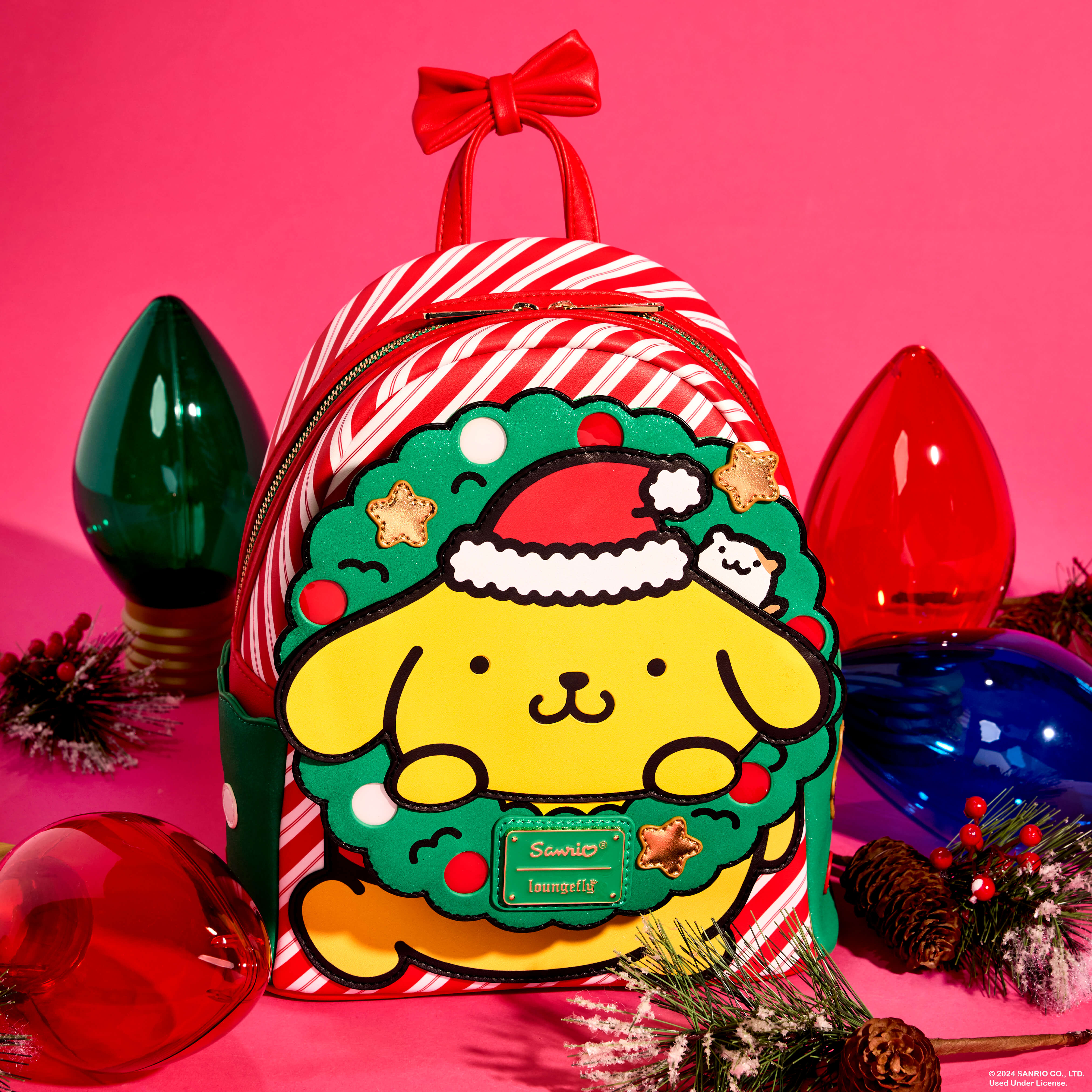 The sweetest and merriest adventures are all a-glow with a ho-ho-ho! Set off in style with our exclusive Pompompurin mini backpack, which features a fun holiday wreath. Pompompurin, in applique form, is happily caught in the wreath’s embrace. And, the lights on the wreath light up! Metallic gold star applique details add a festive touch, along with candy-cane-striped patterns. The wreath also doubles as a figural front pocket for securing smaller items on your journeys. Pack your daily essentials and share smiles wherever you go this holiday season.