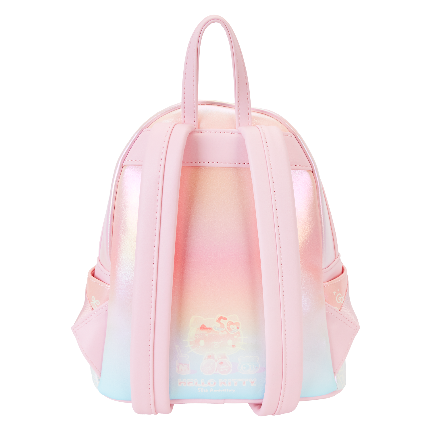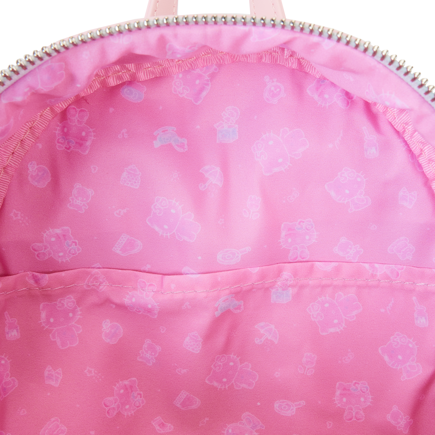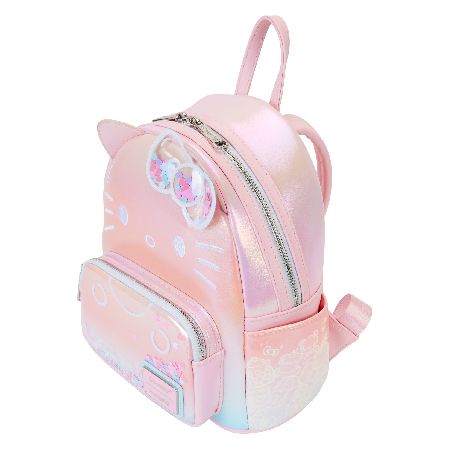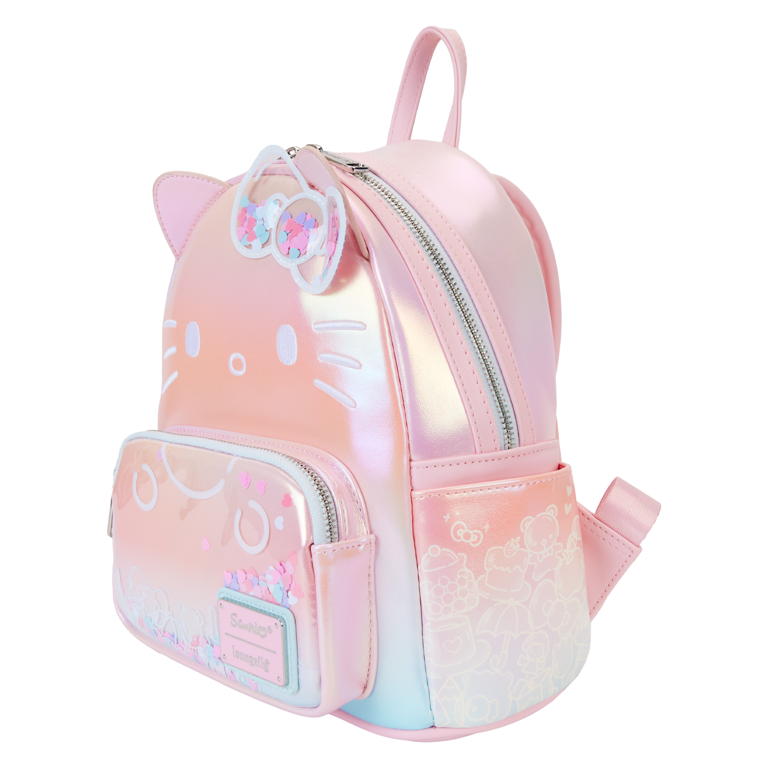 Guess who’s clearly sweet with a bow that’s neat! Break out the confetti to celebrate Hello Kitty’s 50th anniversary! This shiny pink iridescent cosplay backpack is full of surprises. And speaking of confetti…Hello Kitty’s clear bow at the top is filled with heart-shaped colorful confetti. The front pocket has clear PVC material over the top, so you can see more fun-filled confetti shapes. White print, on the pocket, reveals some of Hello Kitty’s favorite things. Her applique face is brought to life in white embroidered detail, and her ears stick up over the top. Frosted print artwork continues on the side pockets, where you’ll find images of more of Hello Kitty’s cherished belongings, including a teddy bear, apple, airplane, milk jug, and more. On the back, she makes an encore as an adorable print. Pack just what you need for the day to celebrate in style.