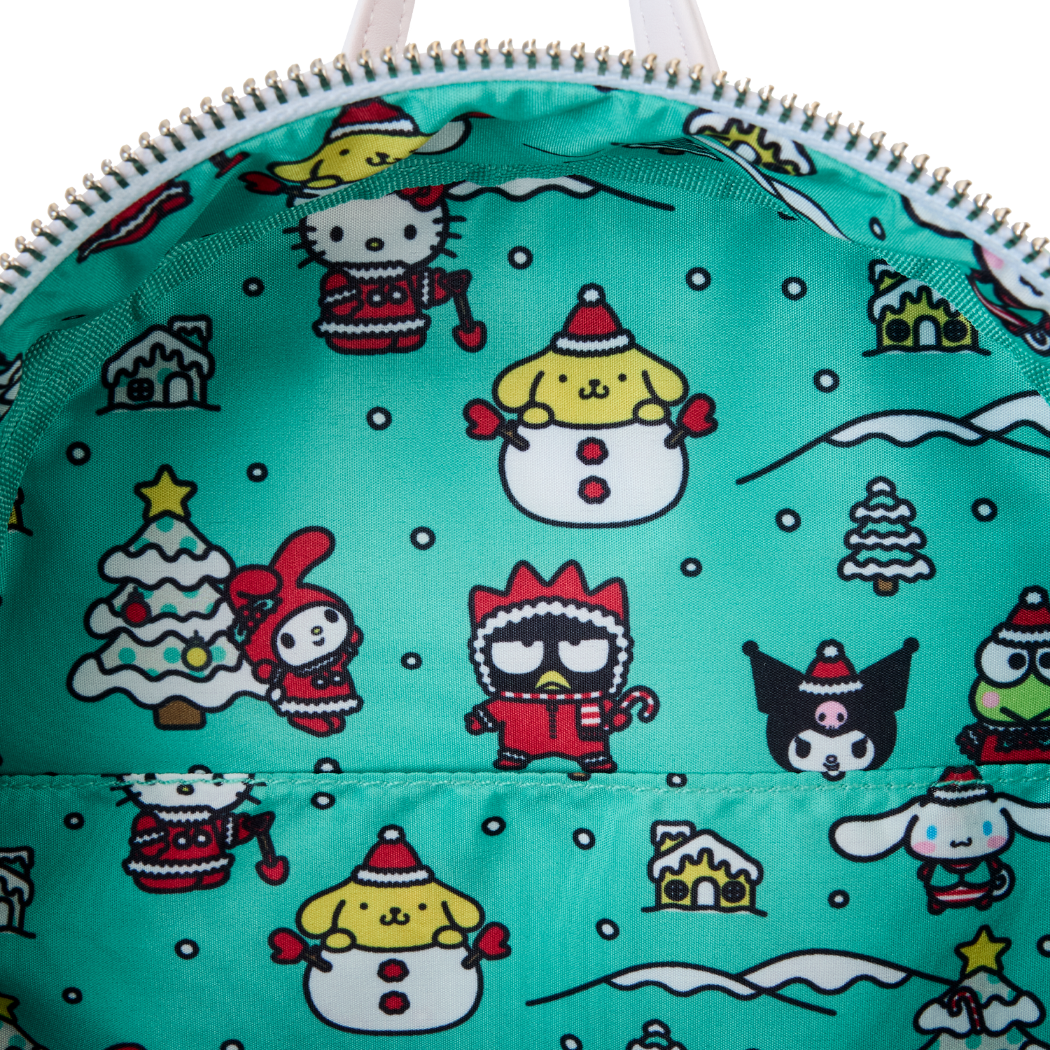 Hello, holidays! Welcome Hello Kitty™ and Friends to all your festive fun. Take along this holiday backpack and share smiles wherever you go. The front features the cutest wreath, with Hello Kitty’s adorable face peeking out. Below, a cozy fireplace, in applique detail, becomes the perfect setting for a few of Hello Kitty’s friends—along with some stockings, presents, and the warm glow of a fire. On the back, the whole gang gathers to wish you “Happy Holidays.” You might be able to spot My Melody, Kuromi, Keroppi, Badtz-Maru, Cinnamoroll, Pompompurin, and Chococat. Pack just what you need for the day to wish all your besties a merry holiday.