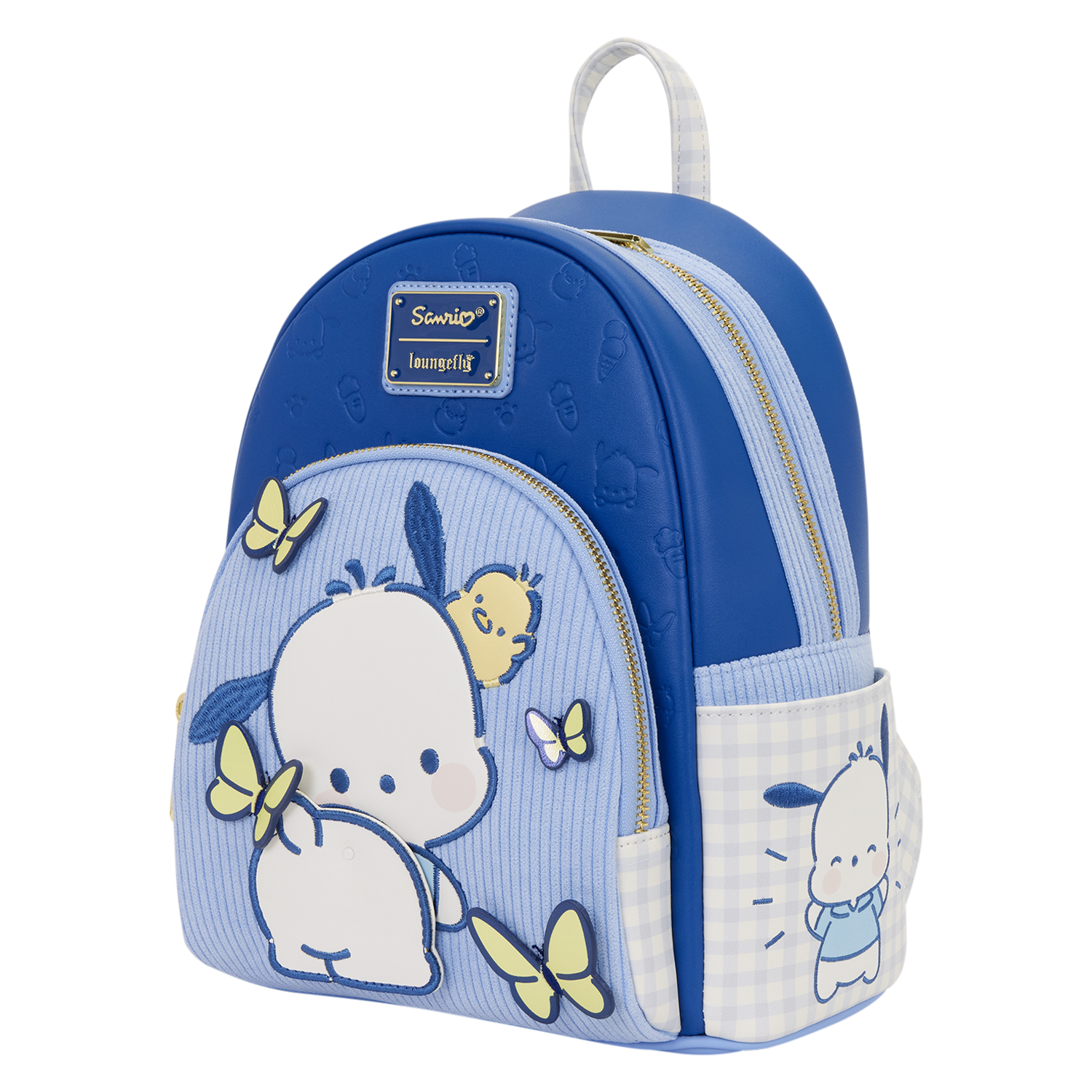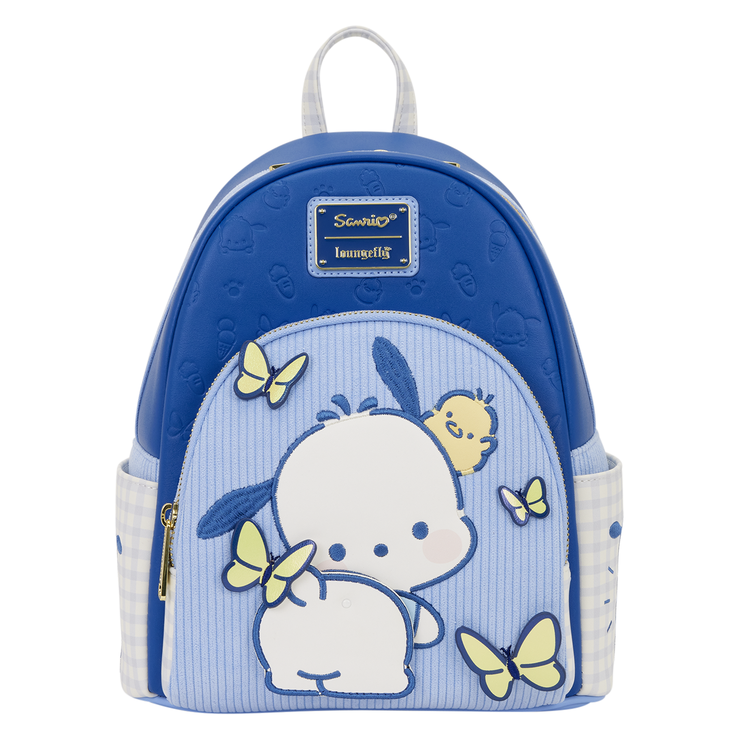 This adorable mini backpack is inspired by Pochacco! You'll find him on the front surrounded by butterflies! He also appears on the side pockets being oh-so-cute! On the front, you'll find that Pochacco's behind swings on a rivet! You'll find a light blue and white gingham pattern over the side pockets, top handle, and straps. Plus, there are iridescent applique butterflies attached to the straps!