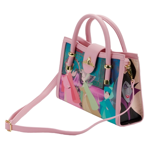 Awaken the magic of a fairy-tale dream with this Loungefly Disney Sleeping Beauty Princess Scenes Crossbody Bag. On this bag, a dream sequence of favorite animated scenes evolves in vivid color and exquisite detail. Capture your favorite Sleeping Beauty moments and keep them close on all your journeys. On the front, Flora, Fauna, and Merryweather are portrayed in rich color, their wands raised. A shiny gold crown molded rivet on the closure tab holds this bag firmly shut, in elegant Disney Princess style. The side panels reveal Maleficent on one side, and Aurora and Prince Phillip, embracing for true love’s kiss, on the other. On the back, an owl suits up as a suitor so that Aurora can have a dance in the woods. This crossbody bag is the perfect accessory to pair with a Disney outfit or for transforming everyday outings into magical adventures.