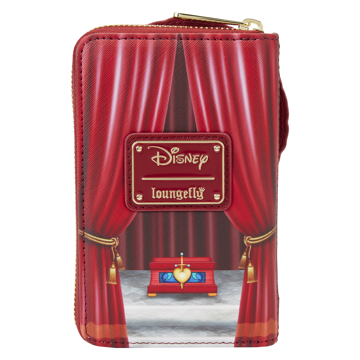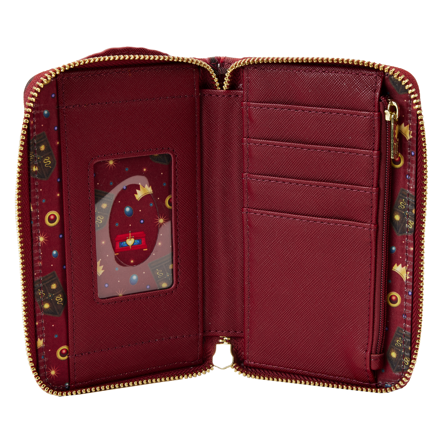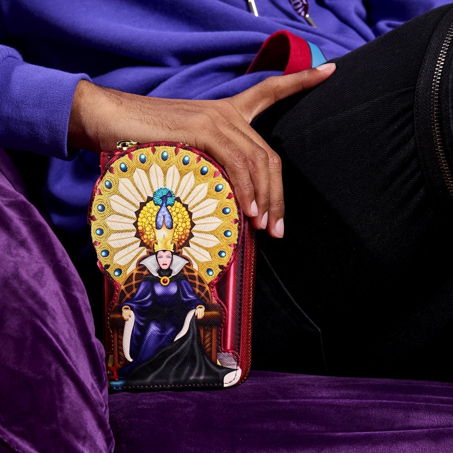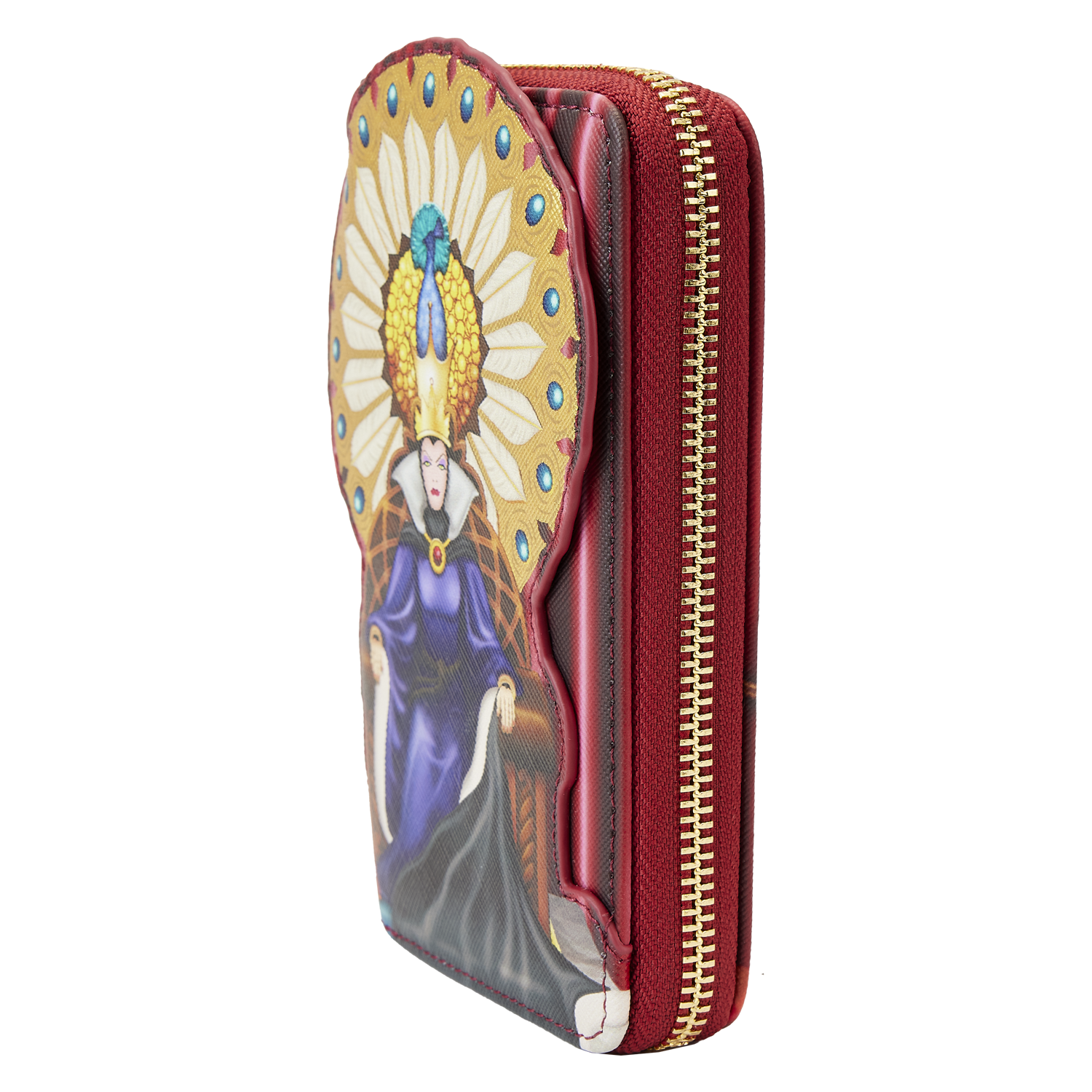 Elegantly evil and ready to rule! Bring on the reign with our Loungefly Disney Snow White Evil Queen Throne Zip-Around Wallet! The Evil Queen is looking particularly regal in the throne room. All artwork on this wallet is original and hand-drawn in-house by our artists. Applique and gold-foil details add a royal touch. A circle of peacock feathers surrounds the Evil Queen on the front of the wallet, which rises up over the top. The box, meant to keep Snow White’s heart, appears on the back, surrounded by red curtains from the throne room. Inside, you’ll find 4 slots for holding cards and 1 clear slot for displaying your ID. Keep your favorite animated moments close while adding wickedly royal fun to your everyday outings, with this exquisite accessory.