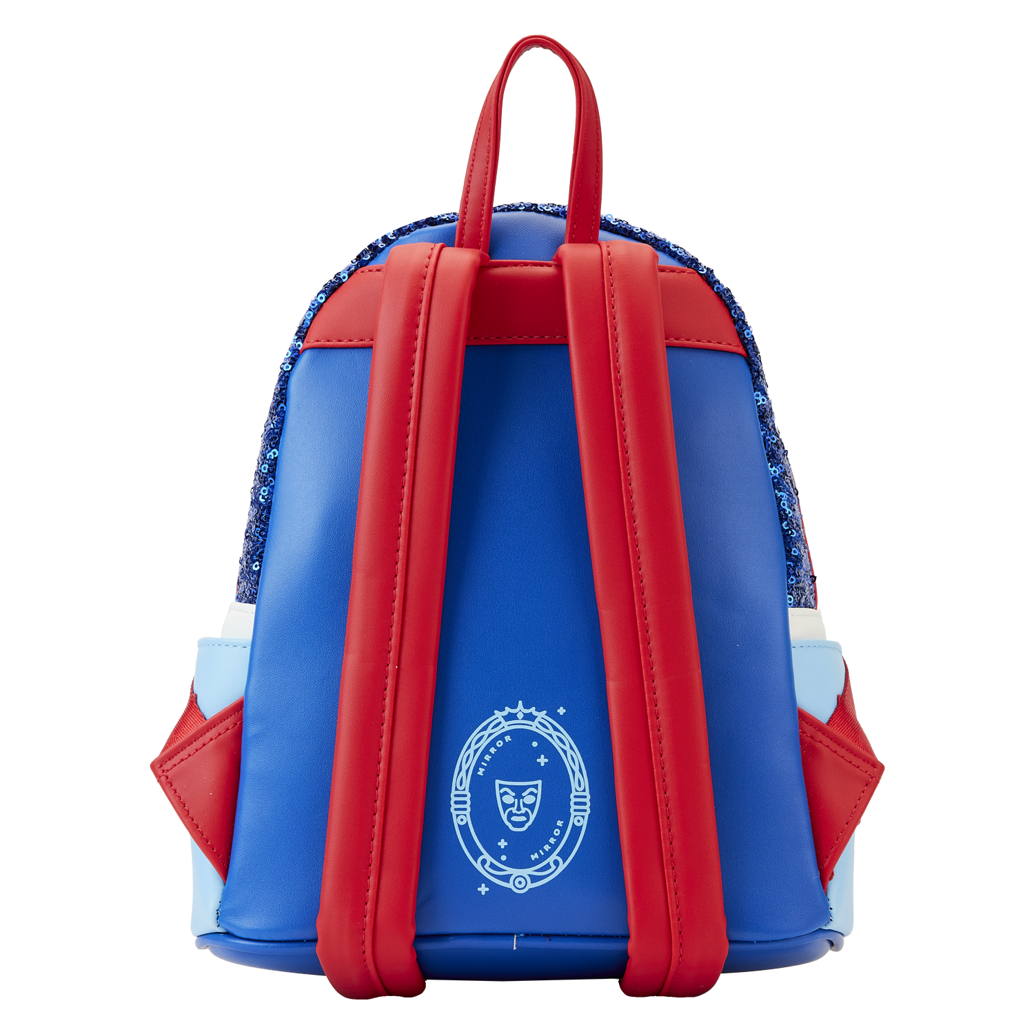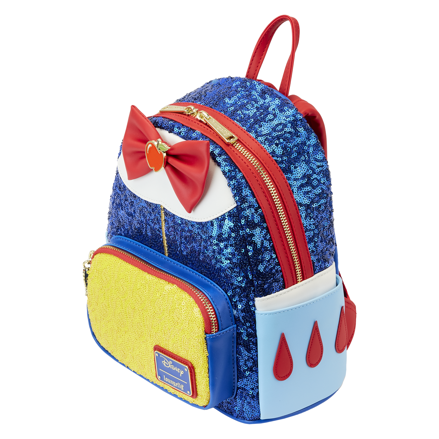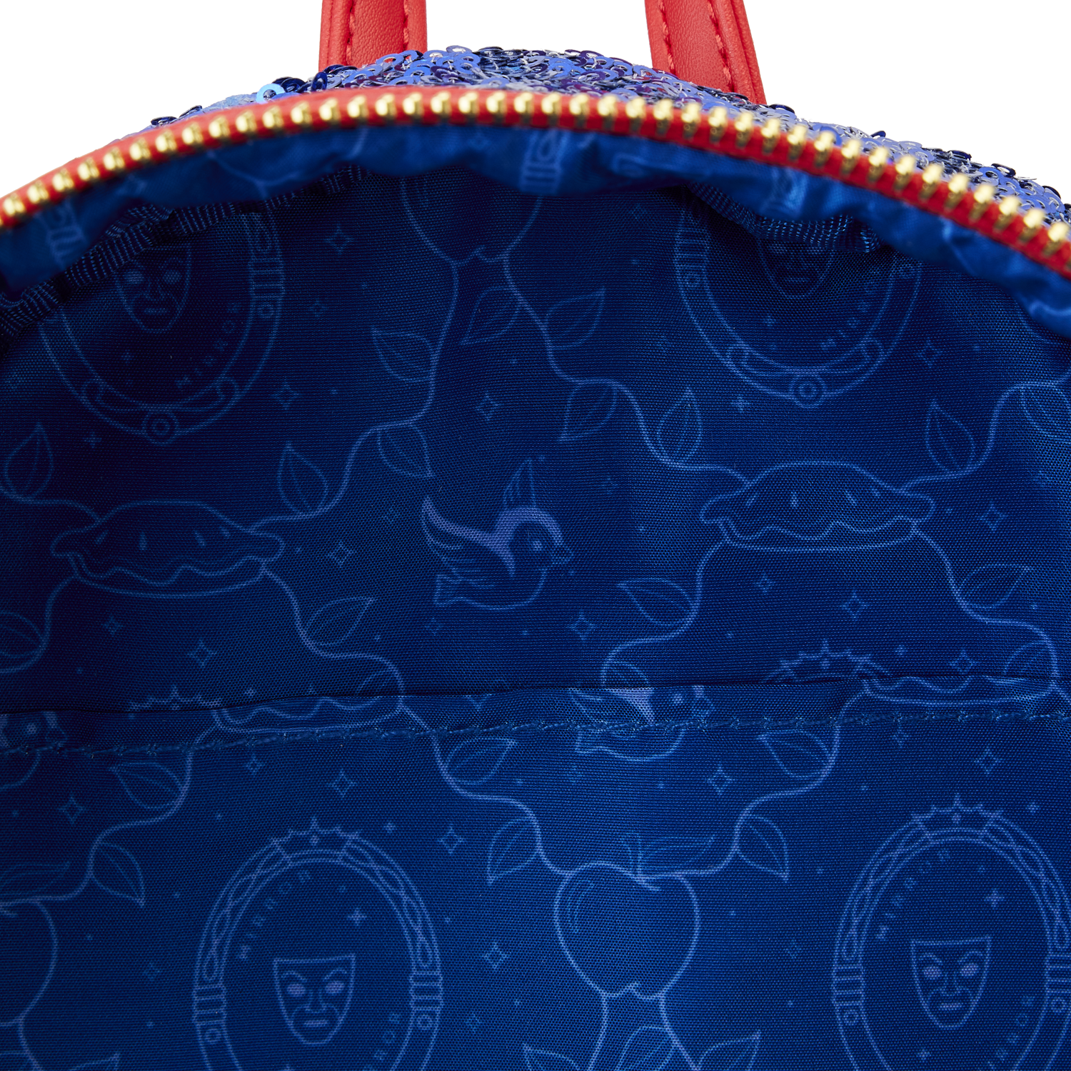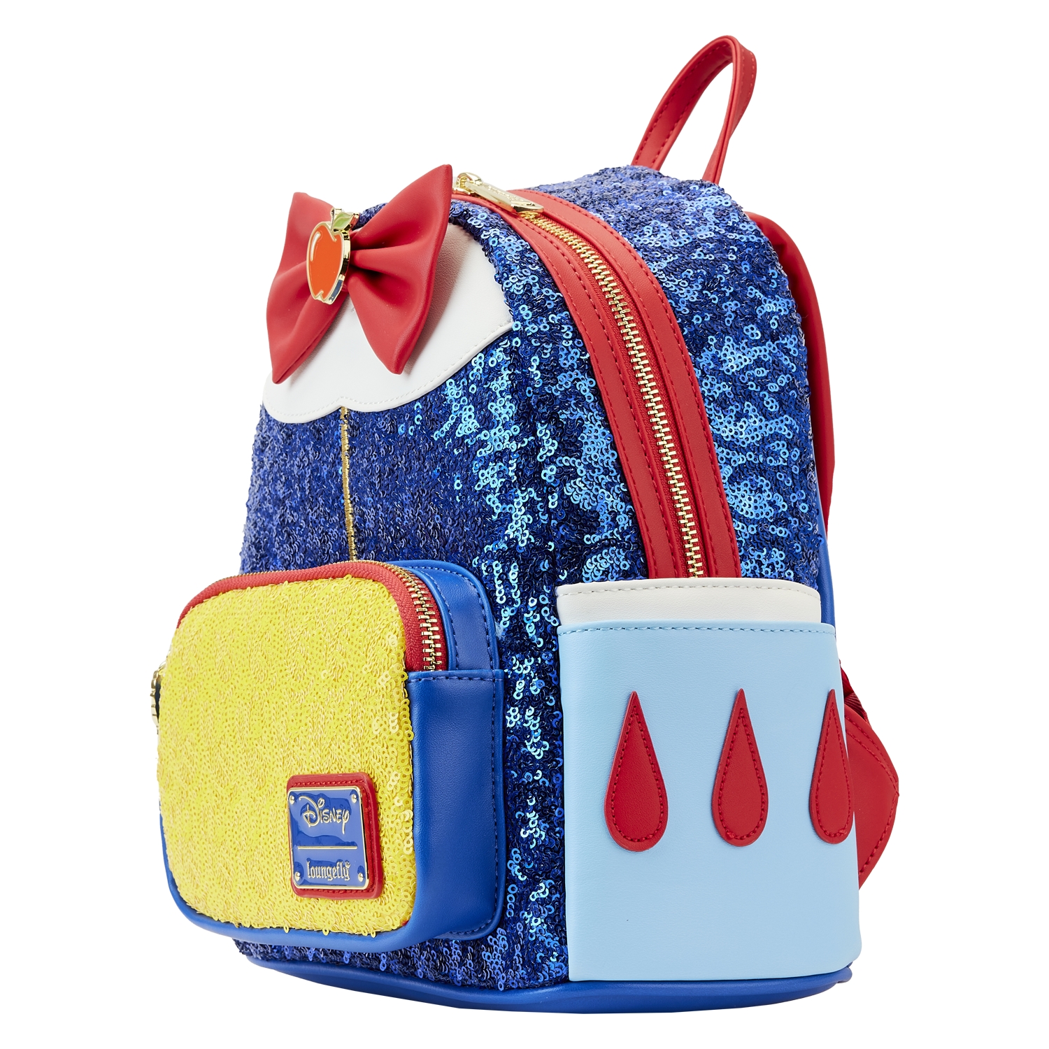 The Exclusive Loungefly Snow White Sequin Series Mini Backpack is made of sequins with vegan leather trim (polyurethane). Bag has adjustable shoulder straps and sturdy metal hardware. Additional features include applique, 3D bow, and printed details. Take note of the coordinating inside lining.