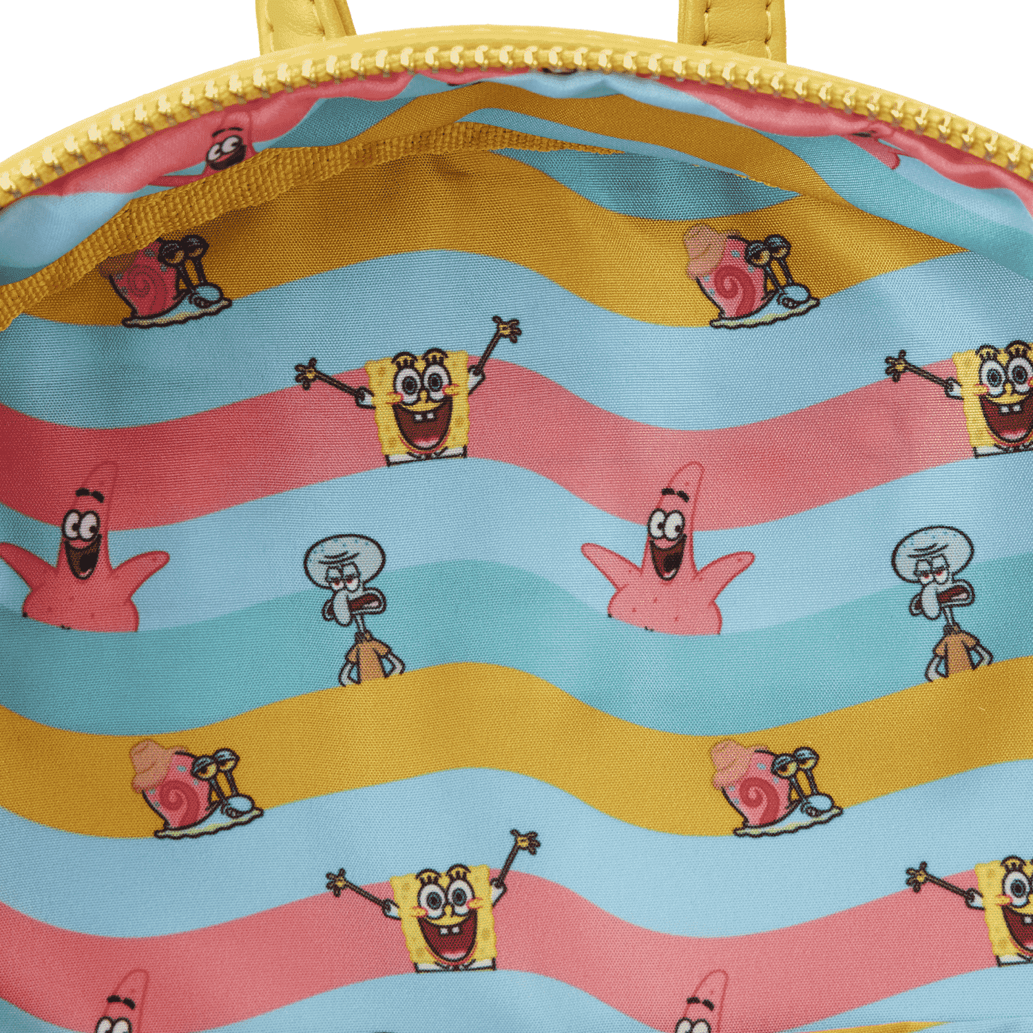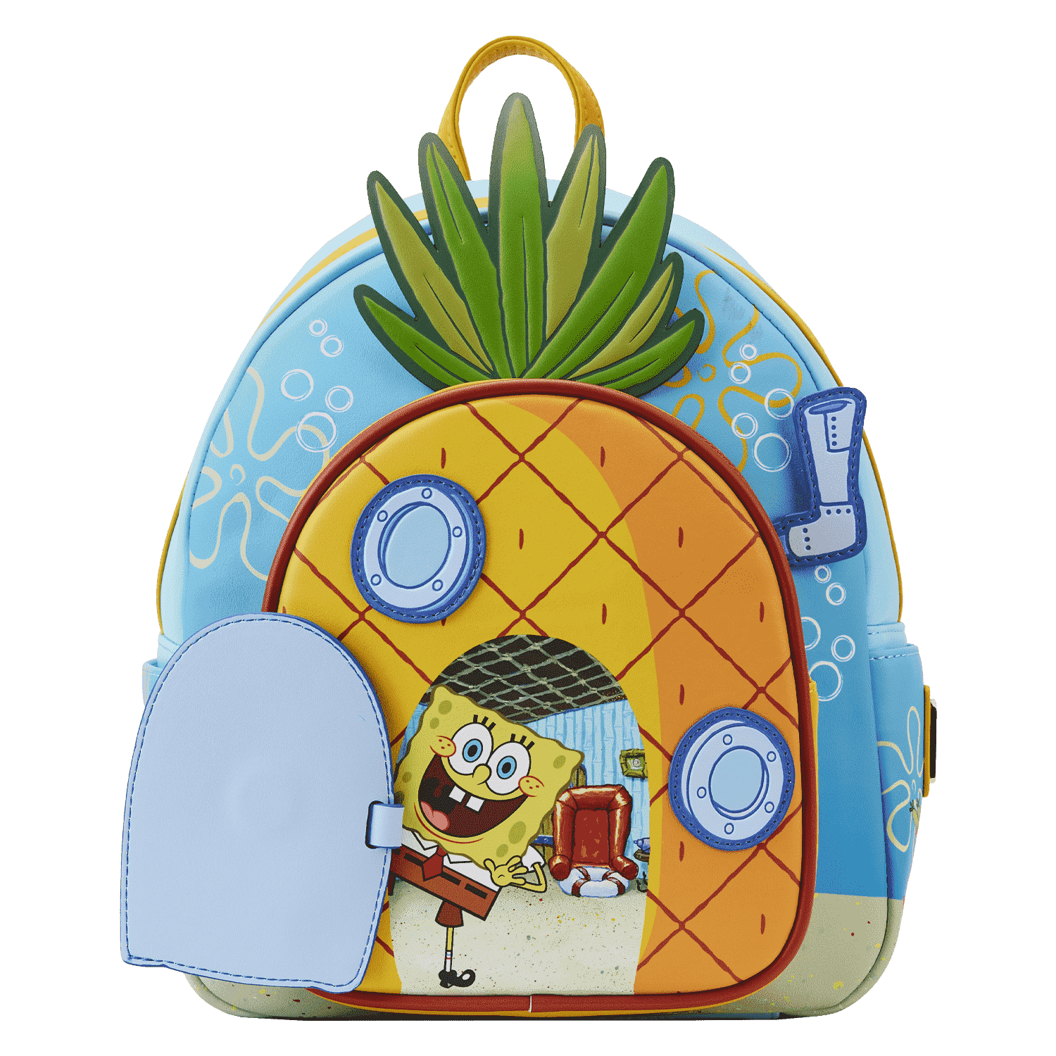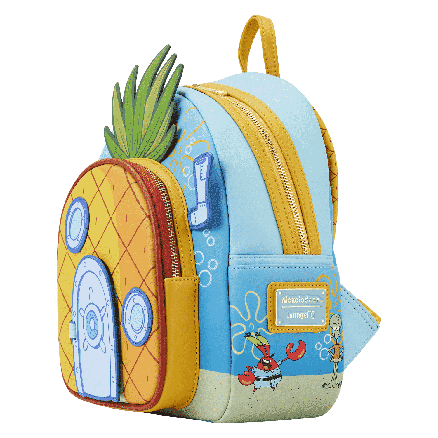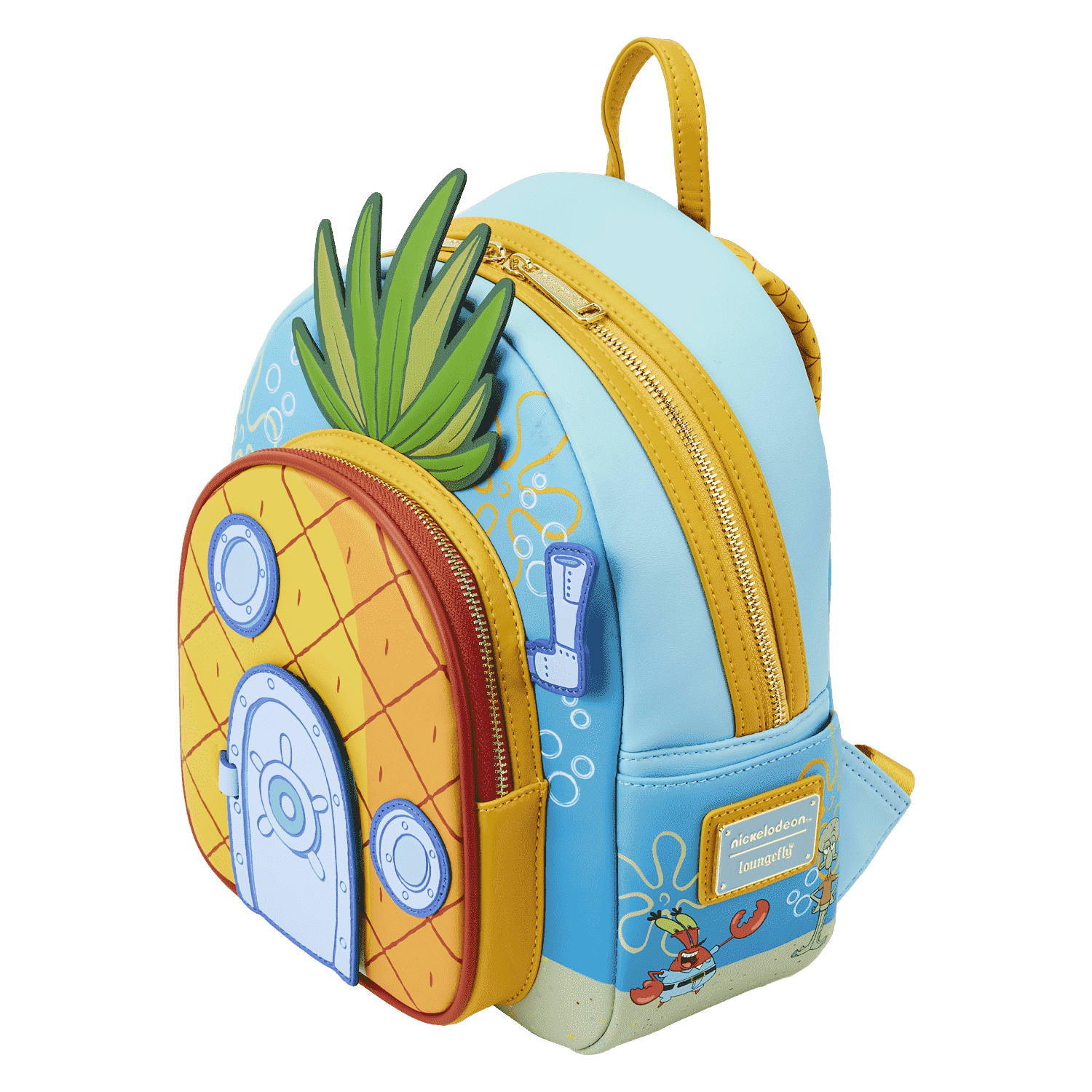 The Loungefly SpongeBob SquarePants Pineapple House Mini Backpack is made of vegan leather (polyurethane). Bag has adjustable shoulder straps and sturdy metal hardware. Additional features include applique, debossed, and printed details. Take note of the coordinating inside lining.